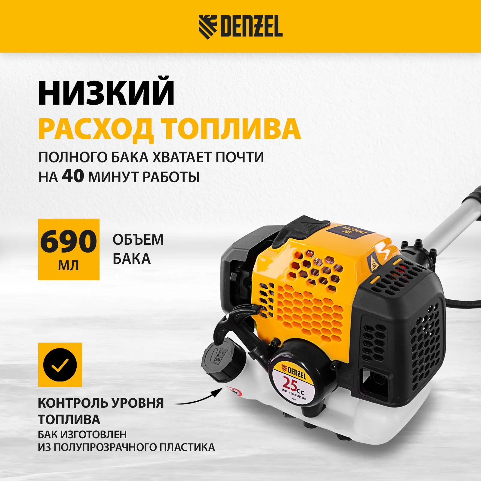 - Удобный контроль уровня топлива — бак выполнен из полупрозрачного пластика.