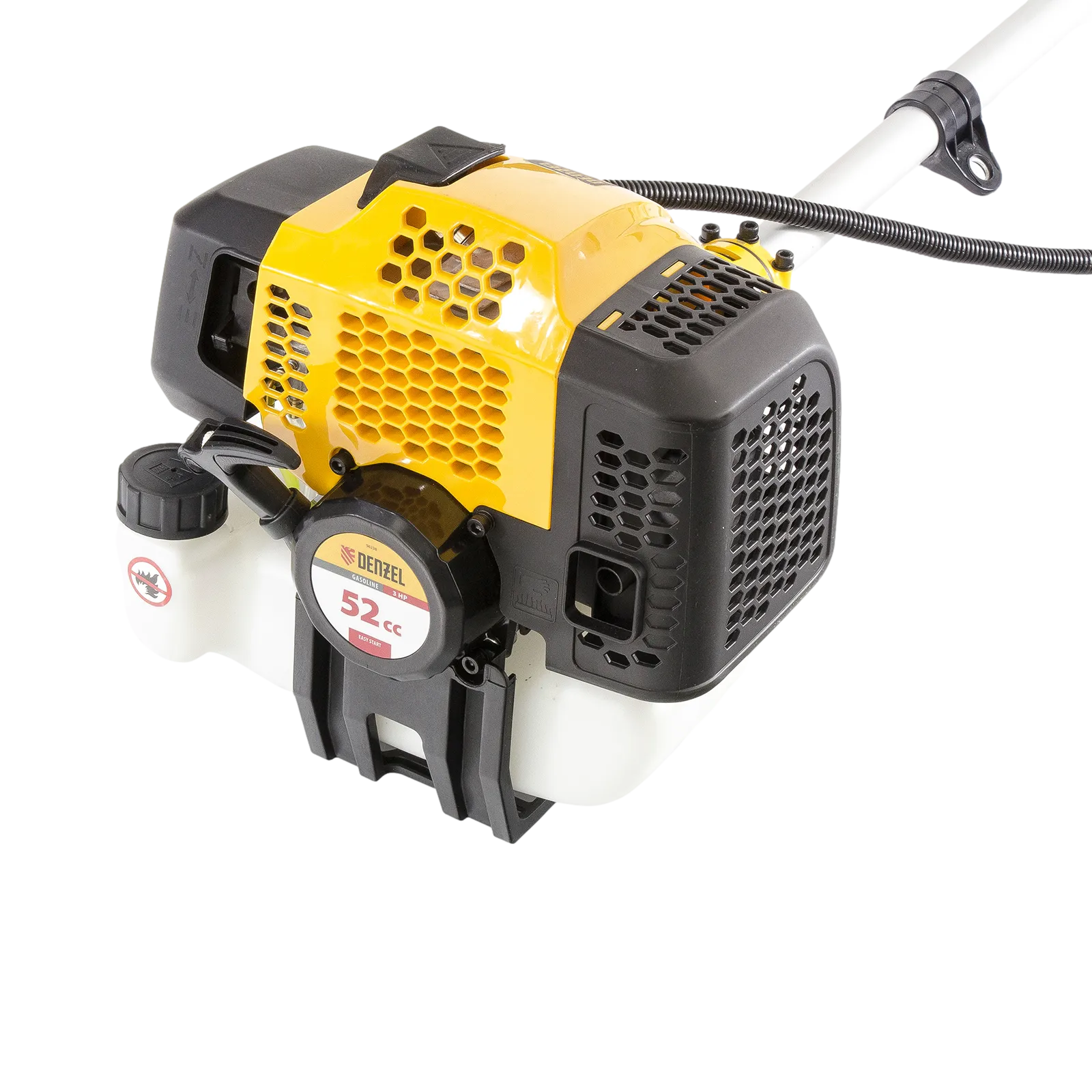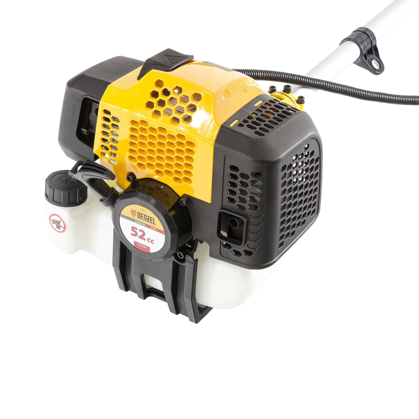 Бензиновый триммер Denzel DGT-520 96238 с неразъемной штангой состоит из 2 частей и оснащен мощным двигателем объемом 52 см3 и мощностью 3 л. с., при этом отличается легкостью и экономичным расходом топлива. Детали двигателя покрыты хромом, что значительно увеличивает ресурс инструмента. Усиленная катушка из полиамида, трехлопастный нож и пильный диск позволяют легко справляться со скашиванием травы всех типов, в том числе с жесткими древовидными стеблями (полыни, крапивы, лебеды, борщевика), а также срезанием кустарника и молодых побегов деревьев с диаметром стволов до 10 мм. Триммер удобен для работы в недоступных для колесной косилки местах. Хорошая сбалансированность инструмента, современная антивибрационная система, подвесной двухплечевой ремень и удобное управление позволяют работать с комфортом даже продолжительное время.