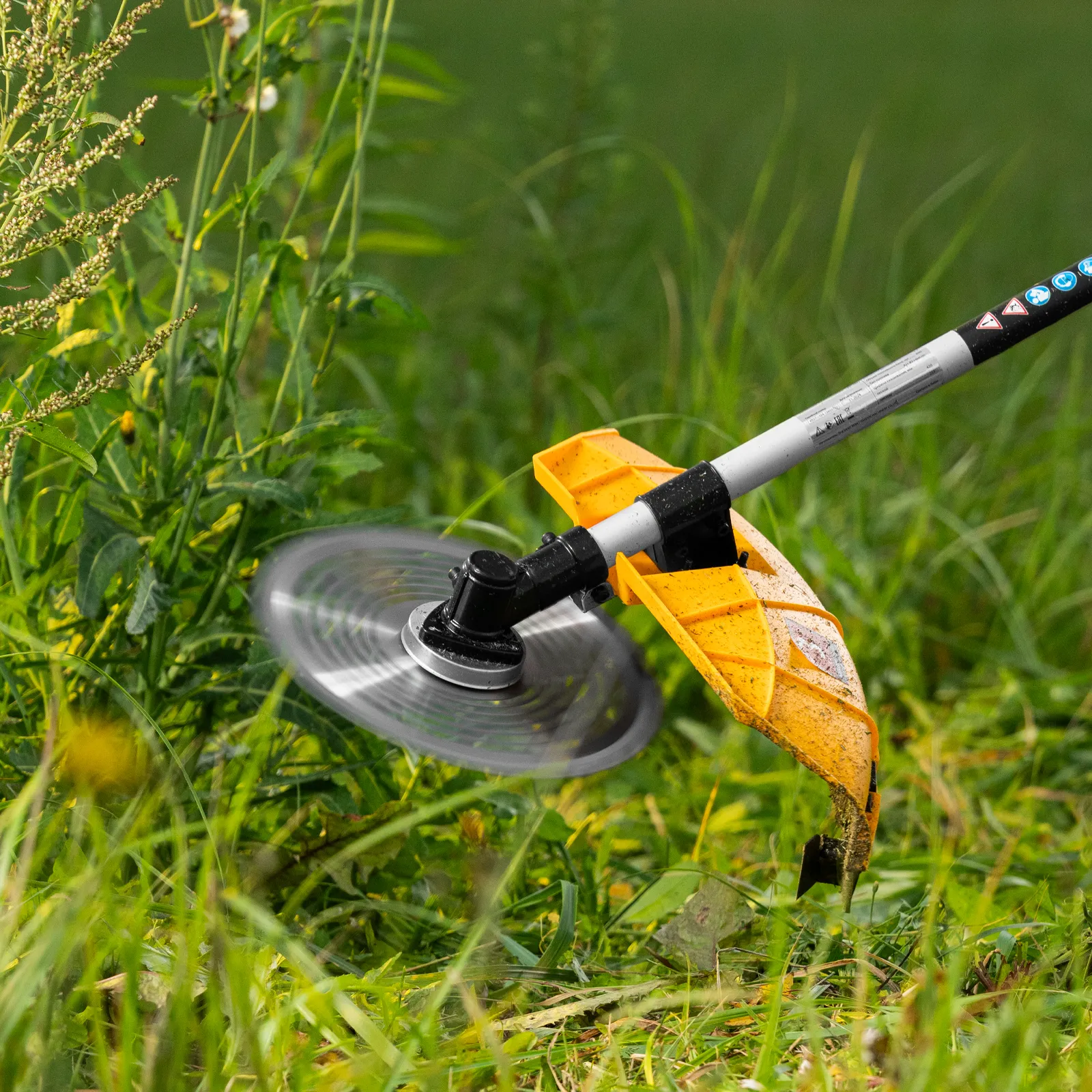 - Дополнительные возможности — можно приобрести и установить на триммер диск Denzel 96323 с шириной скашивания 230 мм для быстрого удаления растительности с жесткими стеблями (полыни, крапивы, лебеды) или 96328 для скашивания молодых побегов кустарника диаметром до 3 мм.