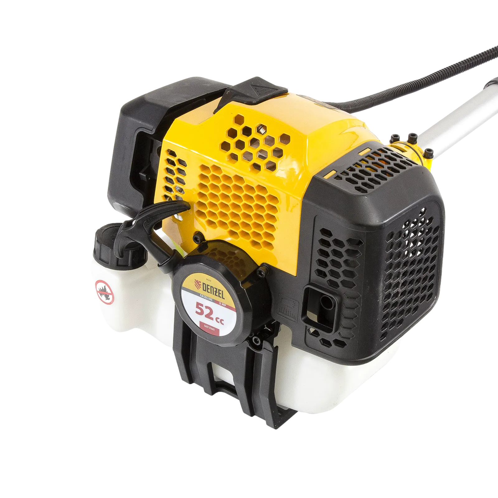 Бензиновый триммер Denzel DGT-520S 96239 с двигателем объемом 52 см3 мощностью 3 л. с., с разъемной штангой, состоит из 2 частей. Скашивает газонную траву, растительность с жесткими и древовидными стеблями (полынь, крапиву, лебеду, борщевик), подходит для срезания кустарника и молодых побегов деревьев с диаметром стволов до 10 мм. Бензиновый двигатель последнего поколения объемом 52 куб. см обеспечивает маневренность и уверенную работу даже в самых труднодоступных местах. Скорость вращения оснастки составляет 9500 об/мин. Ширина прохода диском составляет 255 см, а леской — 420 см, что позволяет обработать большой участок за короткое время.;Триммер работает на смеси бензина с маслом, а потому использовать его можно вдали от дома, независимо от источников электроэнергии. В комплект поставки входит удобный дозатор для приготовления топливной смеси.