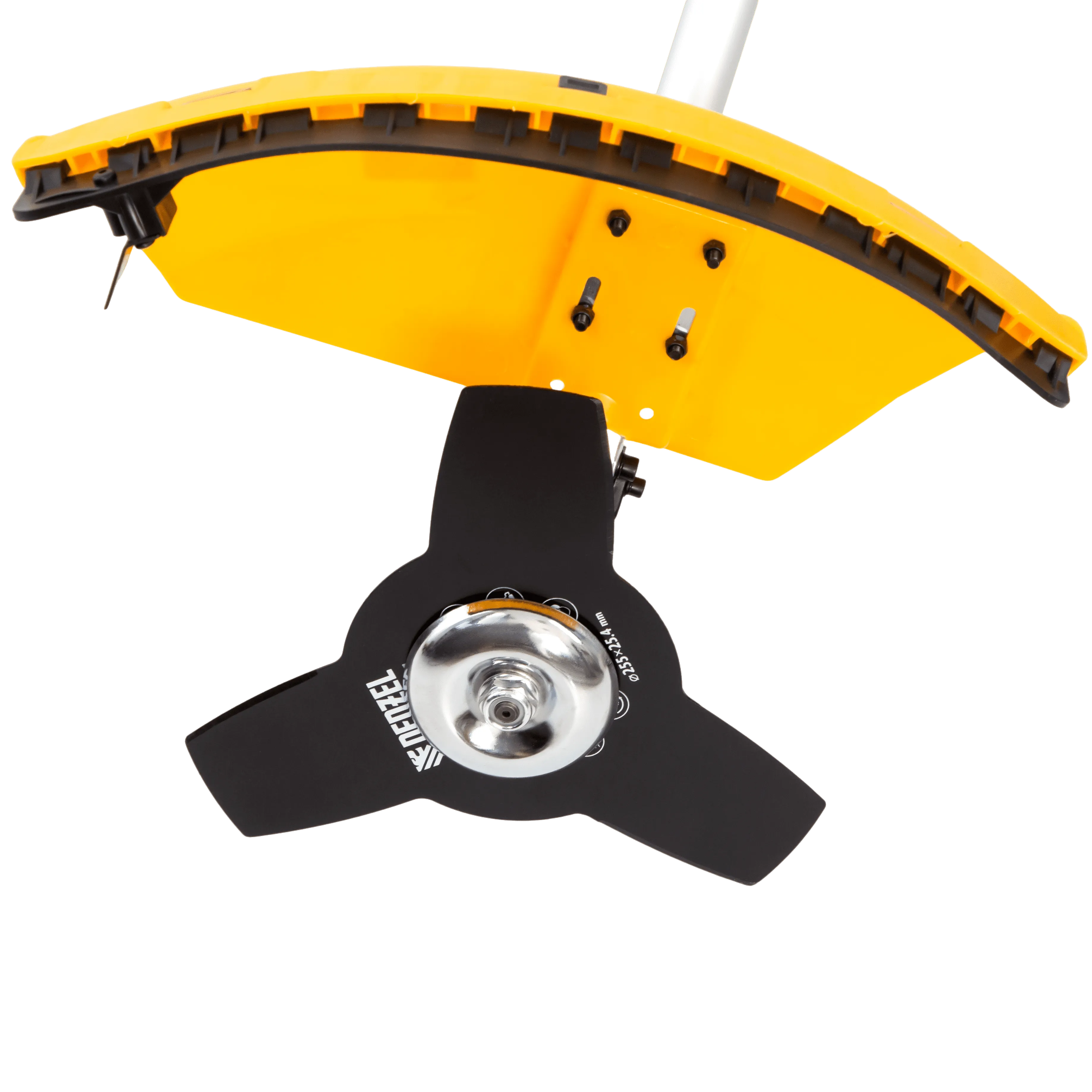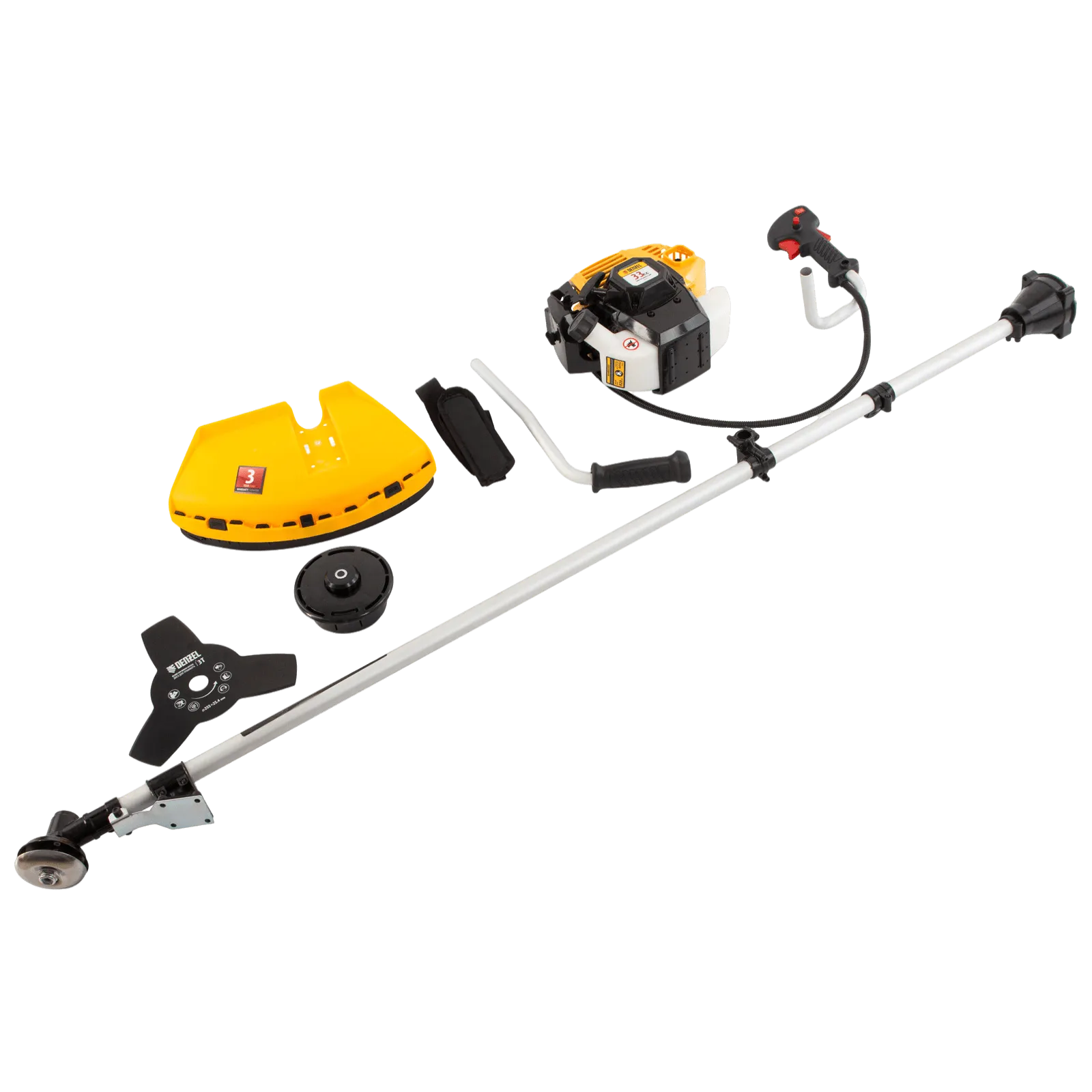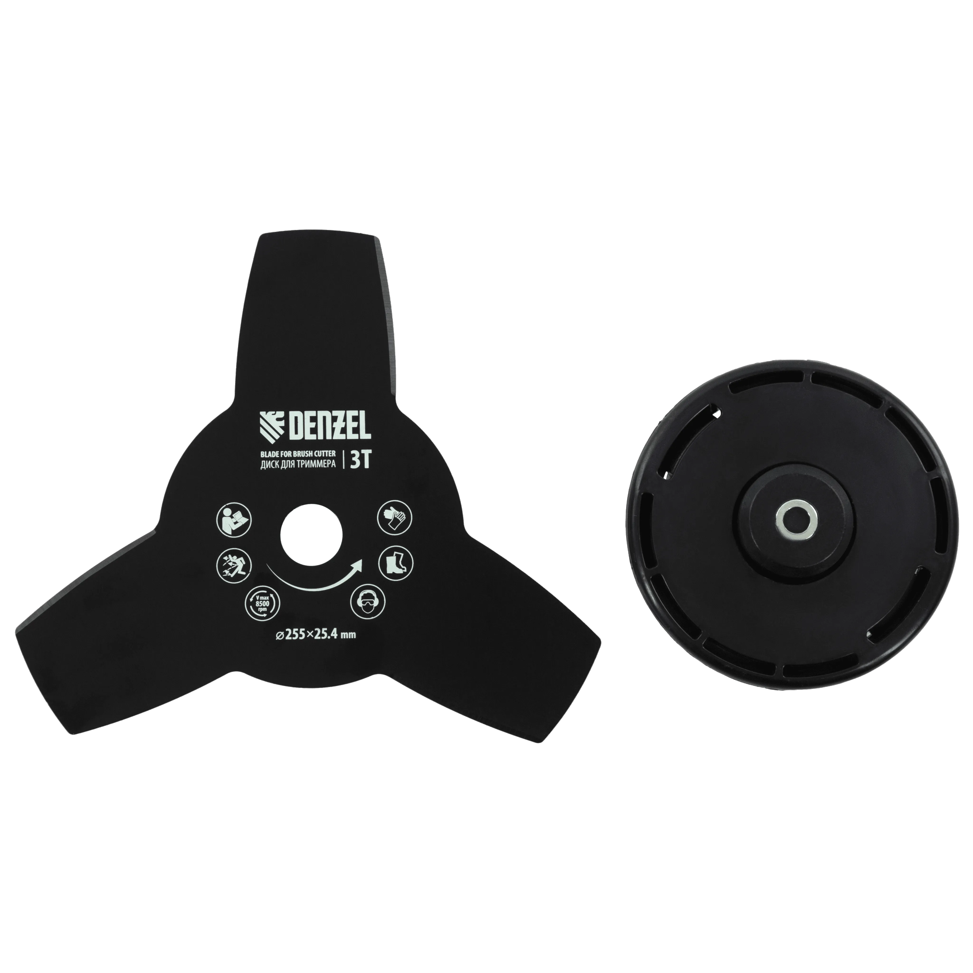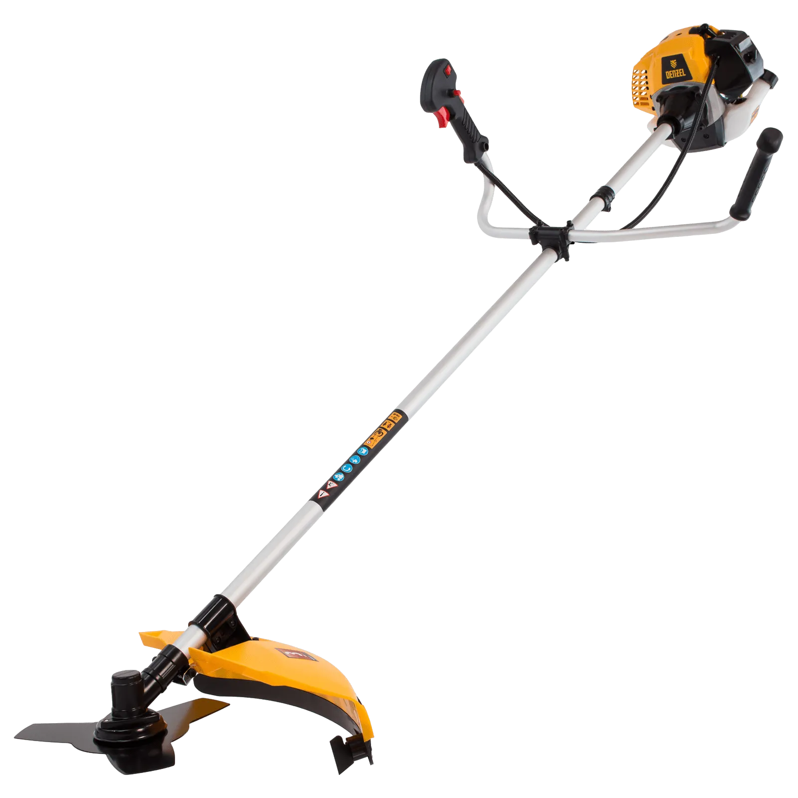 - Дополнительные возможности — можно приобрести диск Denzel 96323 с шириной скашивания 230 мм для быстрого удаления растительности с жесткими стеблями, 96328 для скашивания молодых побегов кустарника диаметром до 3 мм, 96340 для срезания борщевика, кустарника и молодых побегов деревьев с диаметром стволов до 10 мм.