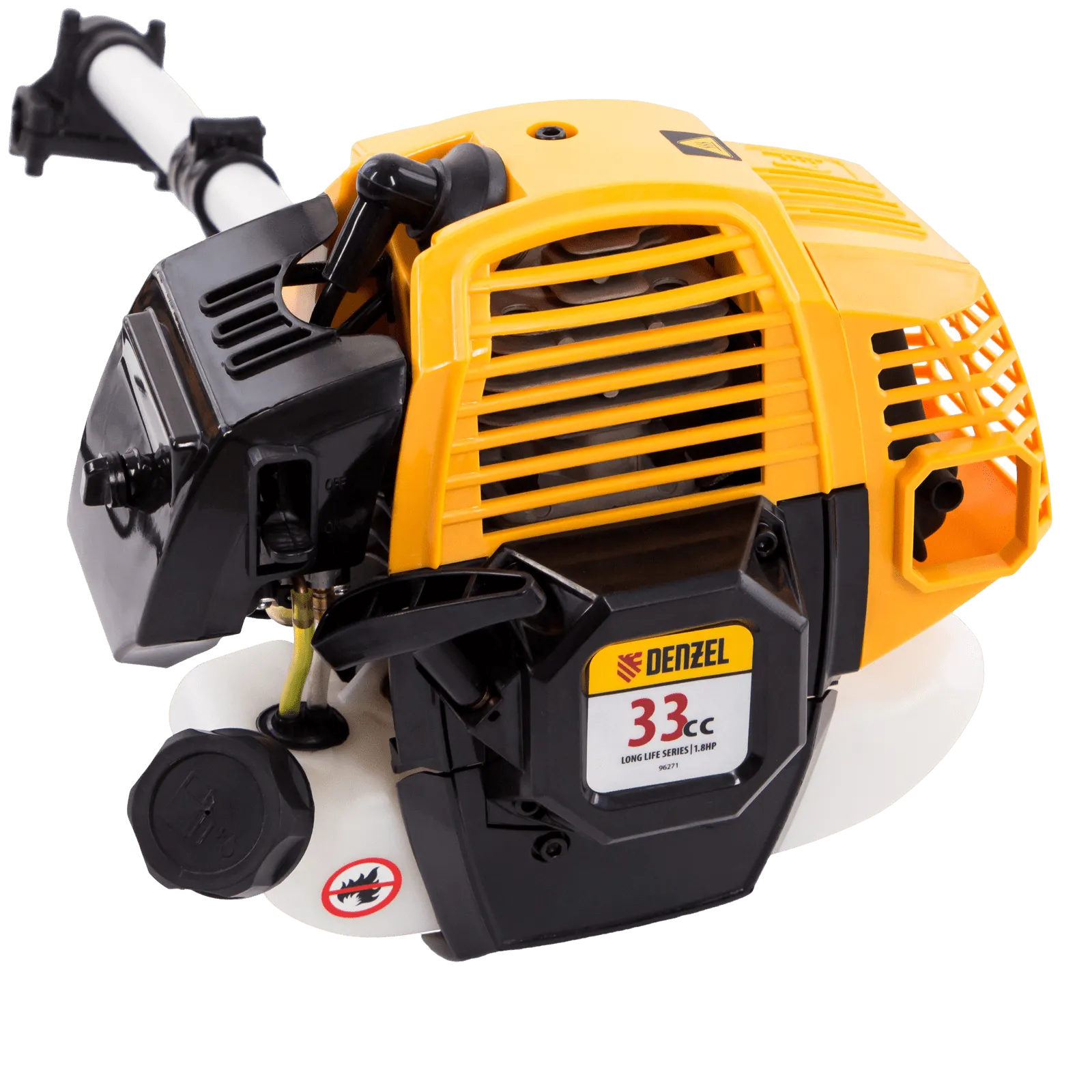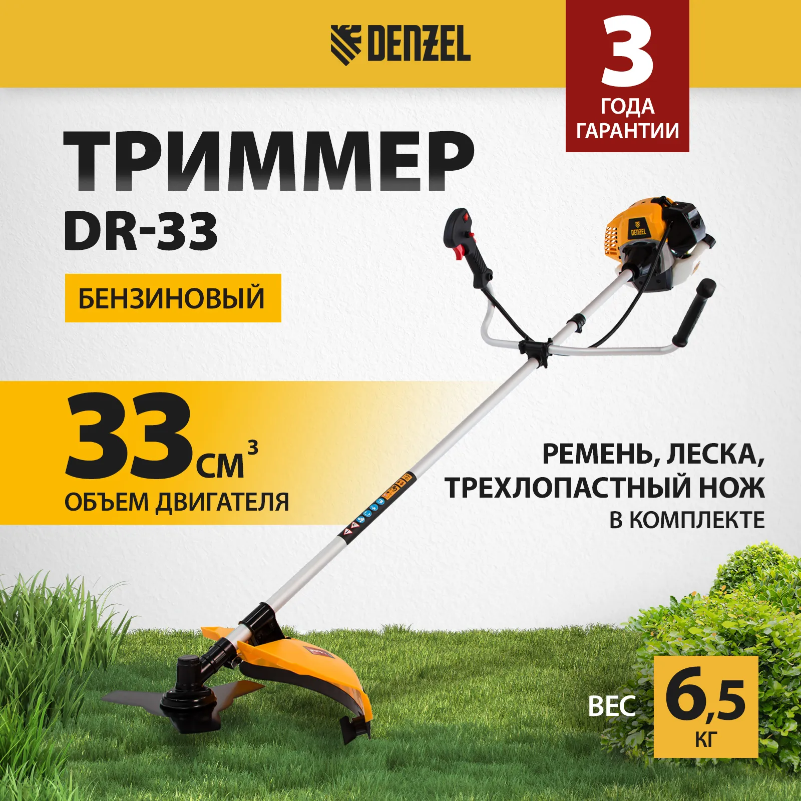 Бензиновый триммер Denzel DR-33 96271 с двигателем объемом 33 см3 и неразъемной штангой состоит из 2 частей. Используется для ухода за газоном, скашивания травы различных типов, в том числе с жесткими стеблями (полыни, крапивы, лебеды). Режущими элементами являются трехлопастный стальной нож и усиленная полиамидная катушка с леской. Оснастка вращается со скоростью 9500 об/мин и обеспечивает ширину скашивания 25,5 см и 42 см. Двухтактный одноцилиндровый двигатель не зависит от электросети, поэтому триммер может использоваться на отдаленных участках. Топливная смесь готовится из бензина и масла, для смешивания которой предусмотрен удобный дозатор.