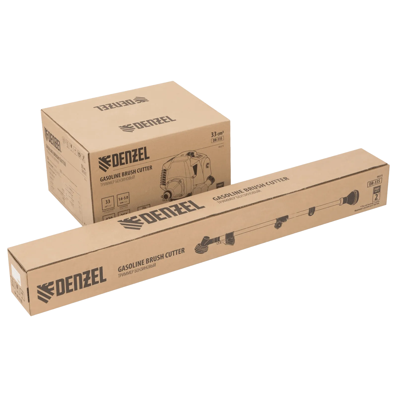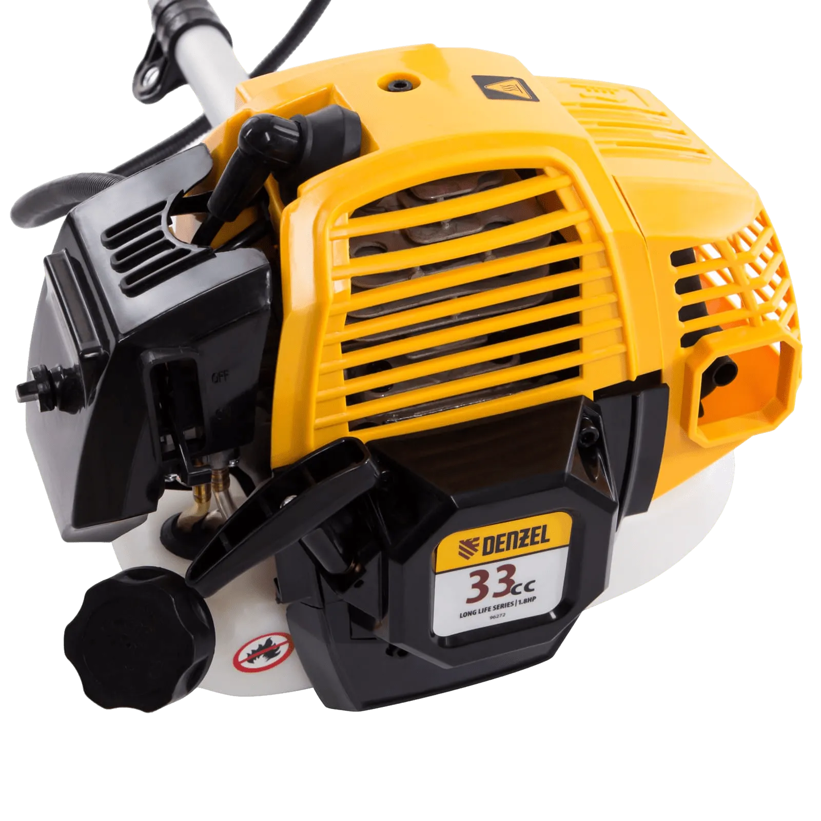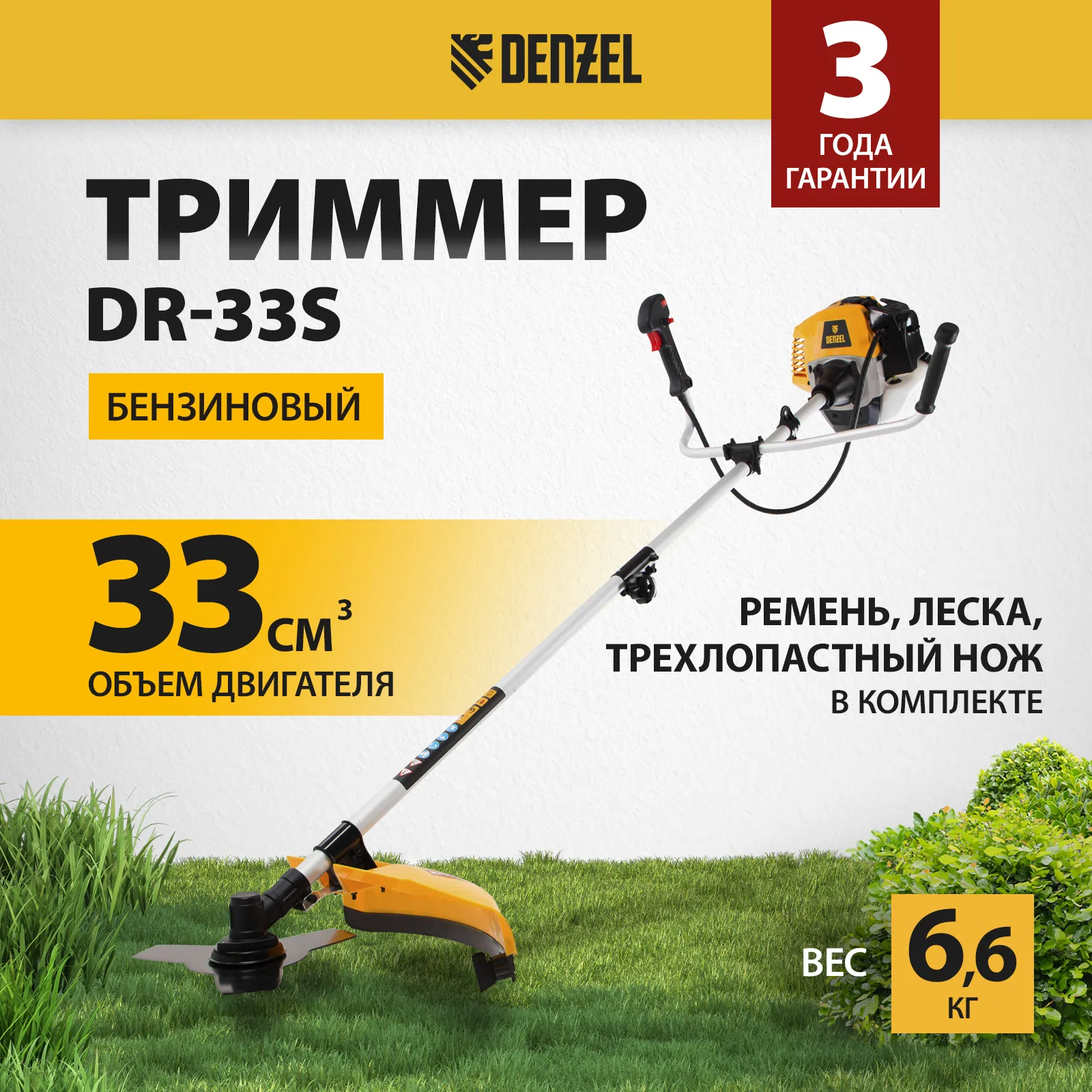 Бензиновый триммер Denzel DR-33S 96272 с двигателем объемом 33 см3 и разъемной штангой, состоит из 2 частей. Используется для ухода за газоном, скашивания травы различных типов, в том числе с жесткими стеблями (полынь, крапива, лебеда). Триммер эффективен на сложных участках: вдоль стен, в ямках и на возвышенностях, вокруг деревьев. Две режущие насадки — трехлопастный нож и катушка с леской — вращаются со скоростью 9500 об/мин, обеспечивая ширину скашивания 25,5 и 42 см. ;Эффективную работу инструмента обеспечивает двухтактный двигатель мощностью 1,8 л.с. При этом триммер экономично расходует топливо, поэтому часто заправлять его не придется.