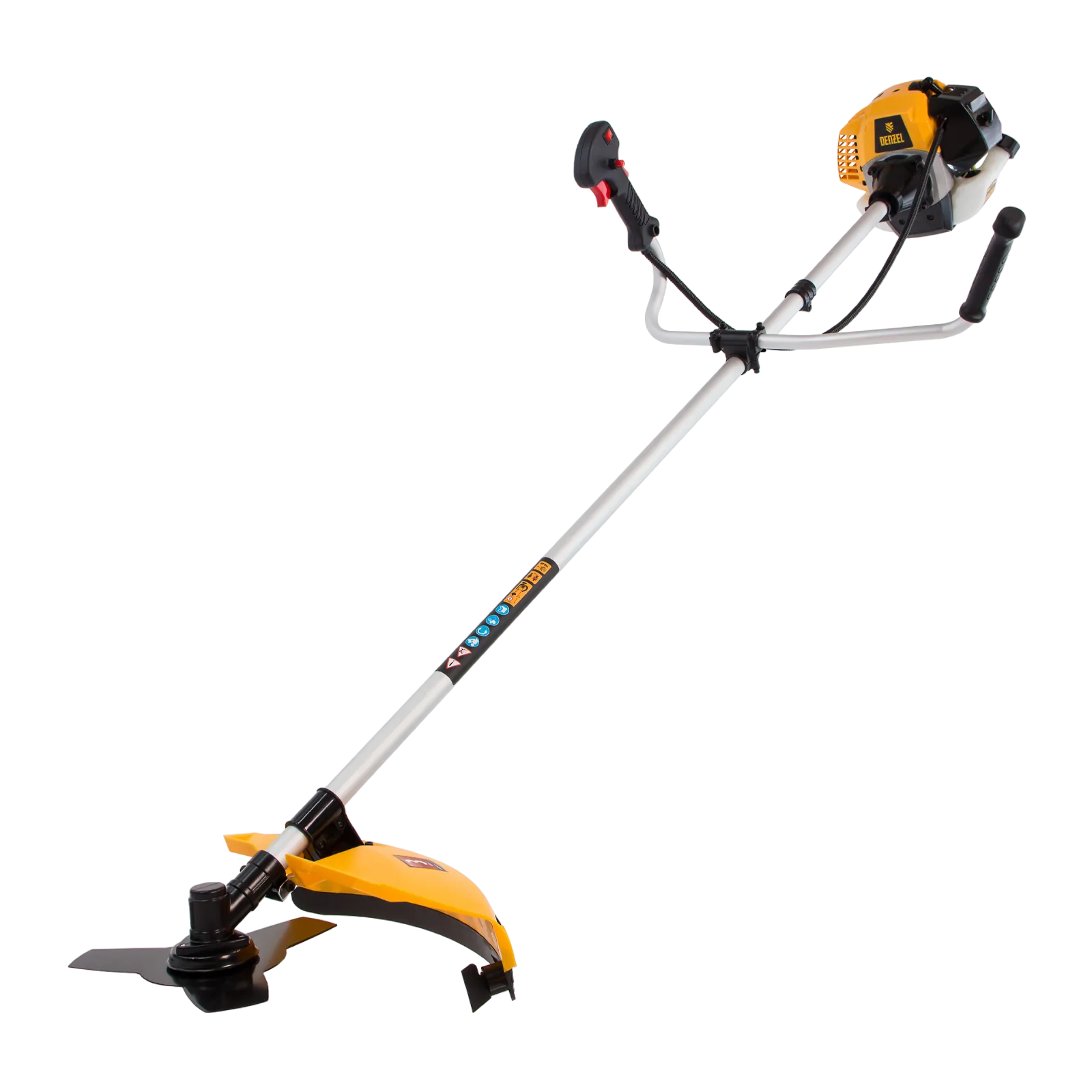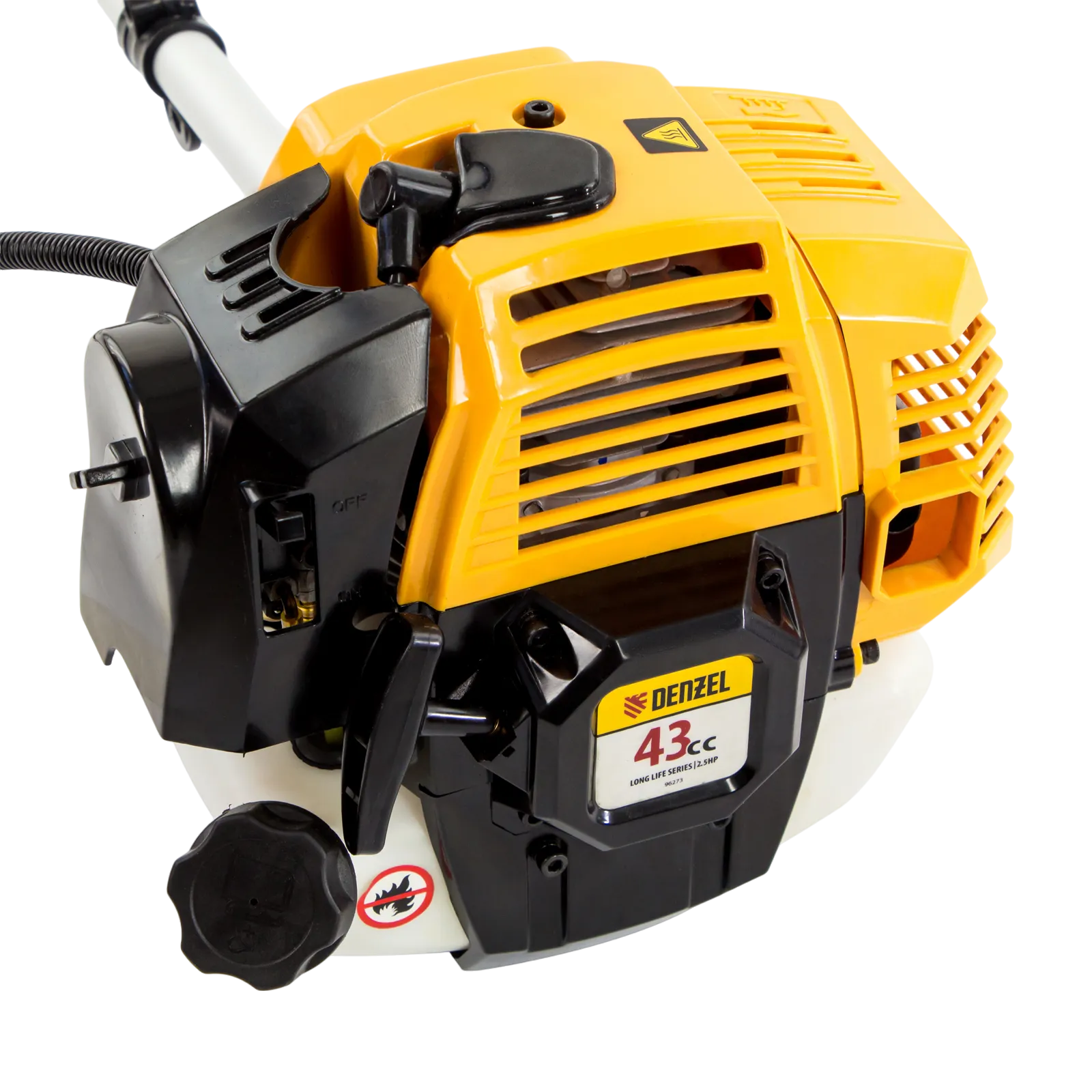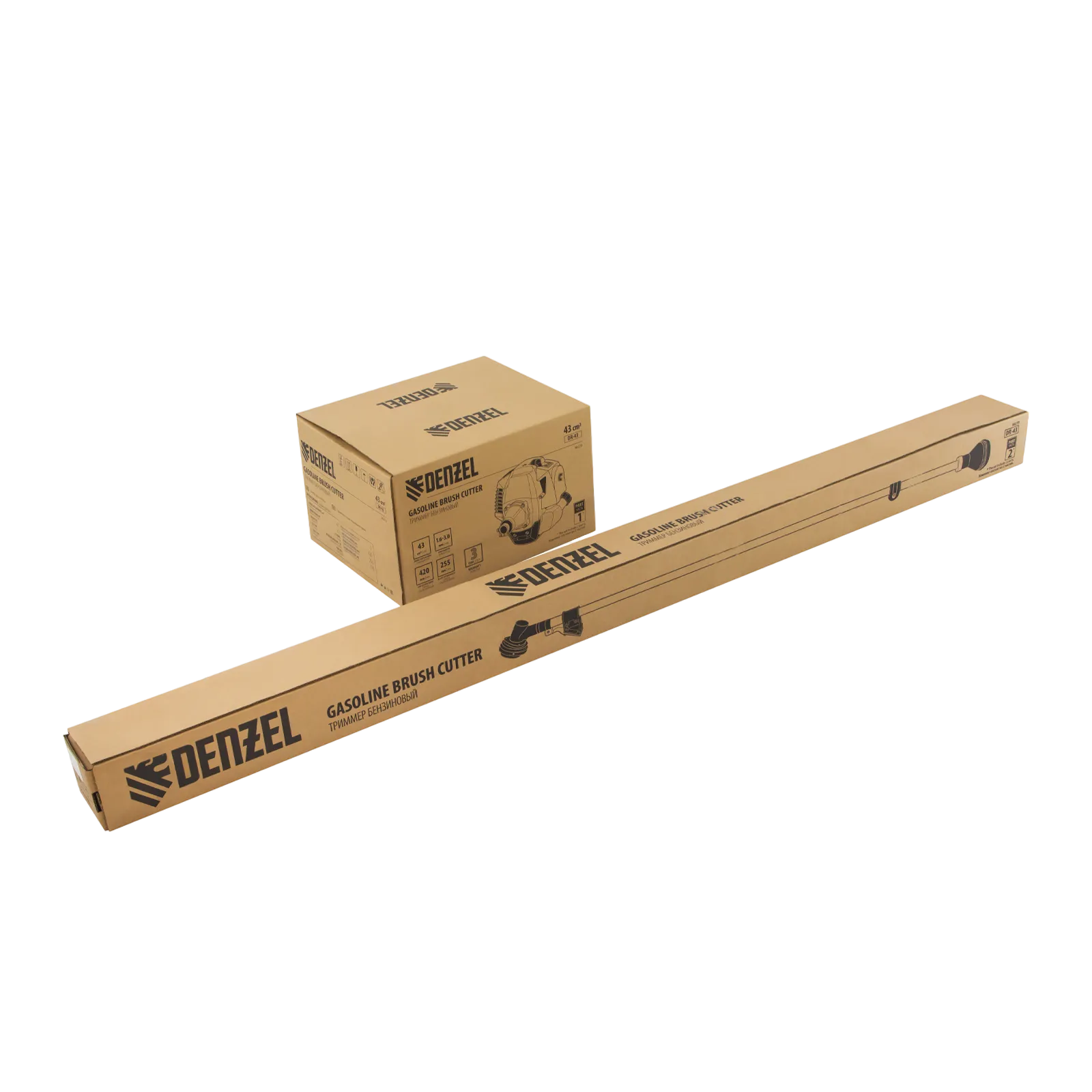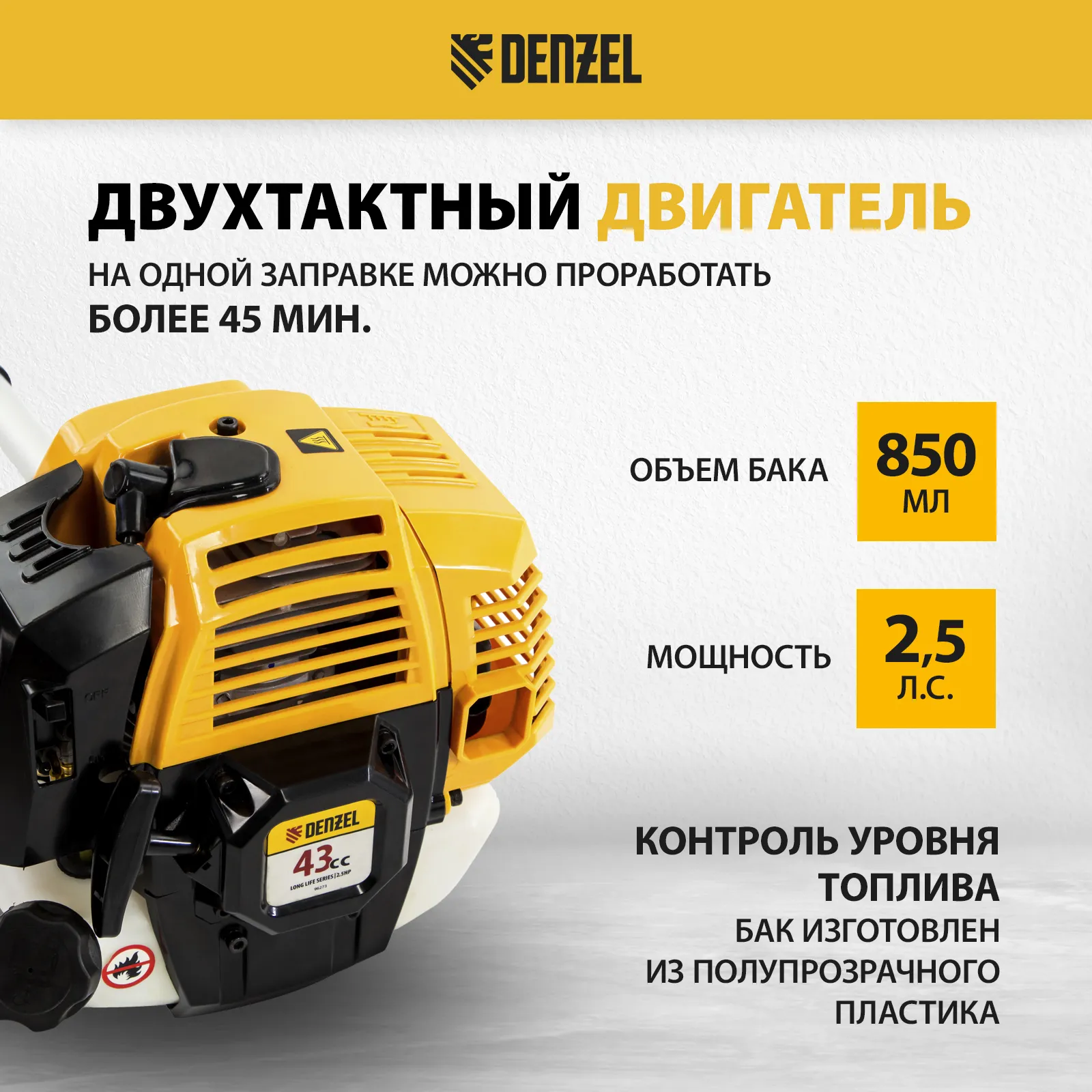 Бензиновый триммер Denzel DR-43 96273 с двигателем объемом 43 см3 и неразъемной штангой состоит из 2 частей и предназначен для ухода за газоном и формирования у него ровных границ, скашивания травы различных типов, в том числе с жесткими стеблями (полынь, крапива, лебеда). Удобен для работы в самых труднодоступных местах — на овражках, вокруг деревьев, вдоль стен и заборов. Эффективное решение этих задач обеспечивают режущие насадки — трехлопастный нож из стали и усиленная катушка из полиамида с леской. Они вращаются со скоростью 9500 об/мин, ширина скашивания составляет 25,5 и 42 см.;Инструмент не нужно включать в розетку, поэтому с ним можно работать в удаленных от дома уголках. Комплект поставки состоит из 2 частей для удобства транспортировки. Редуктор и корпус сцепления уже установлены на штангу, что облегчает его окончательную сборку.