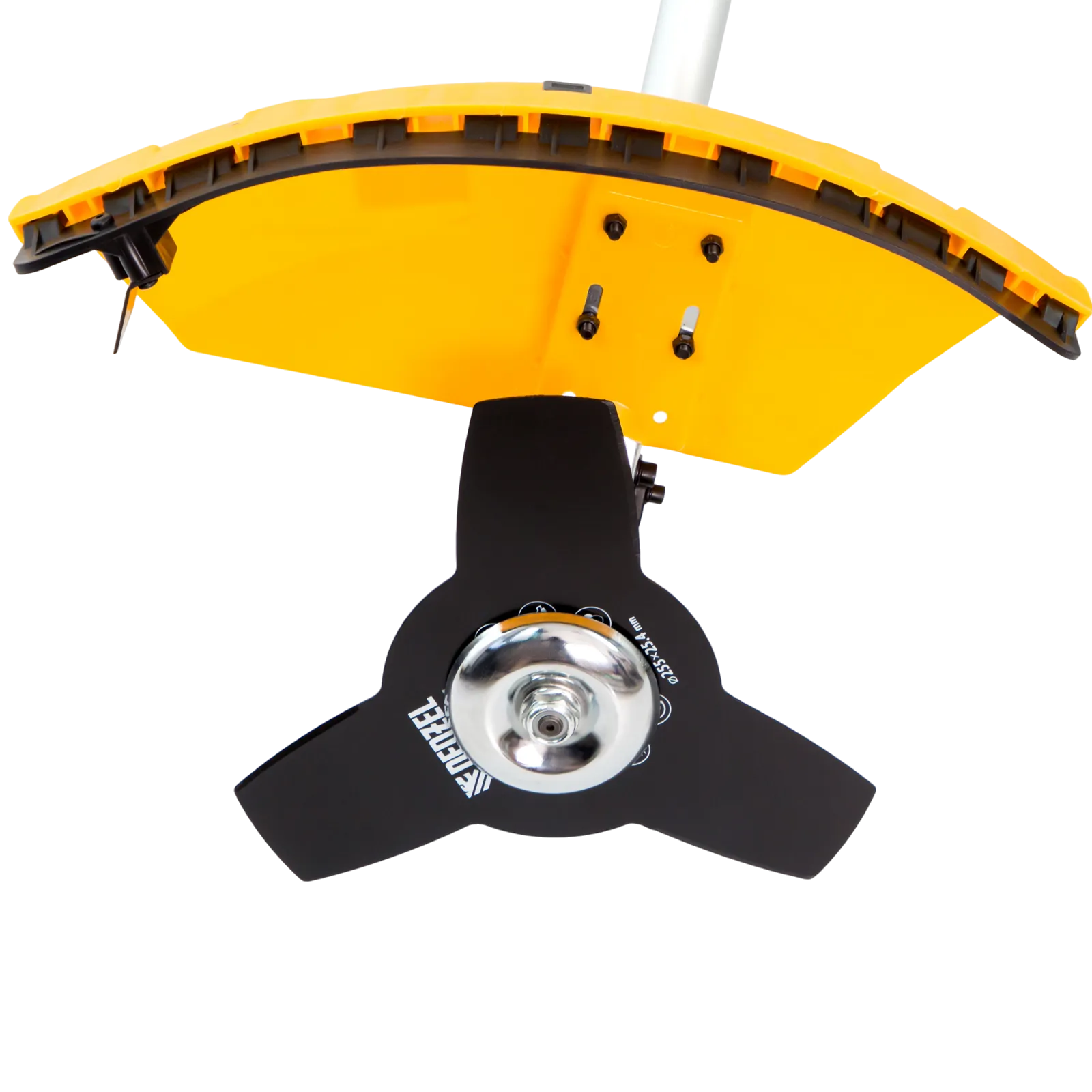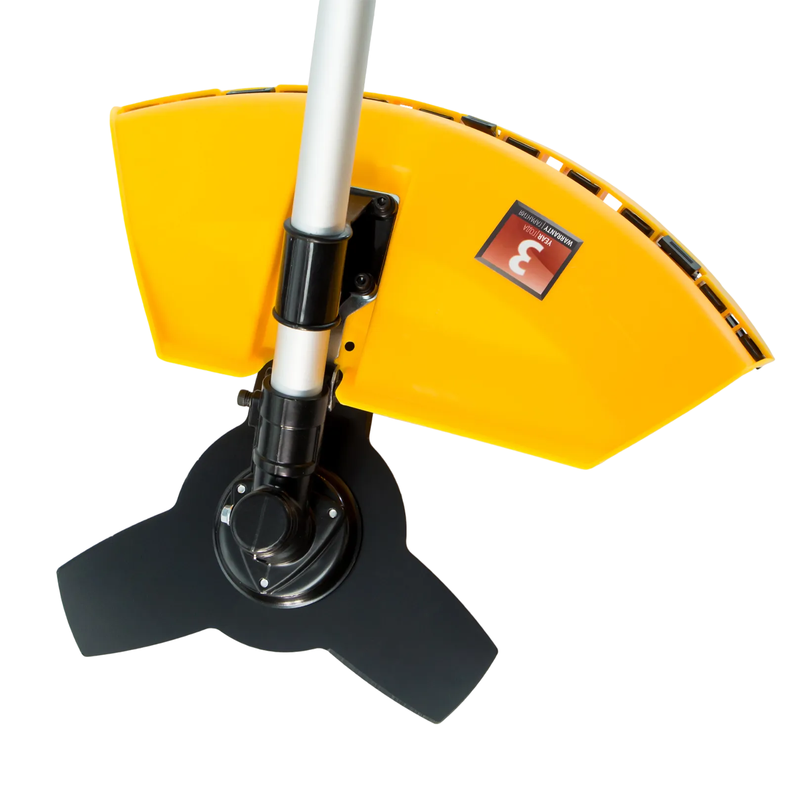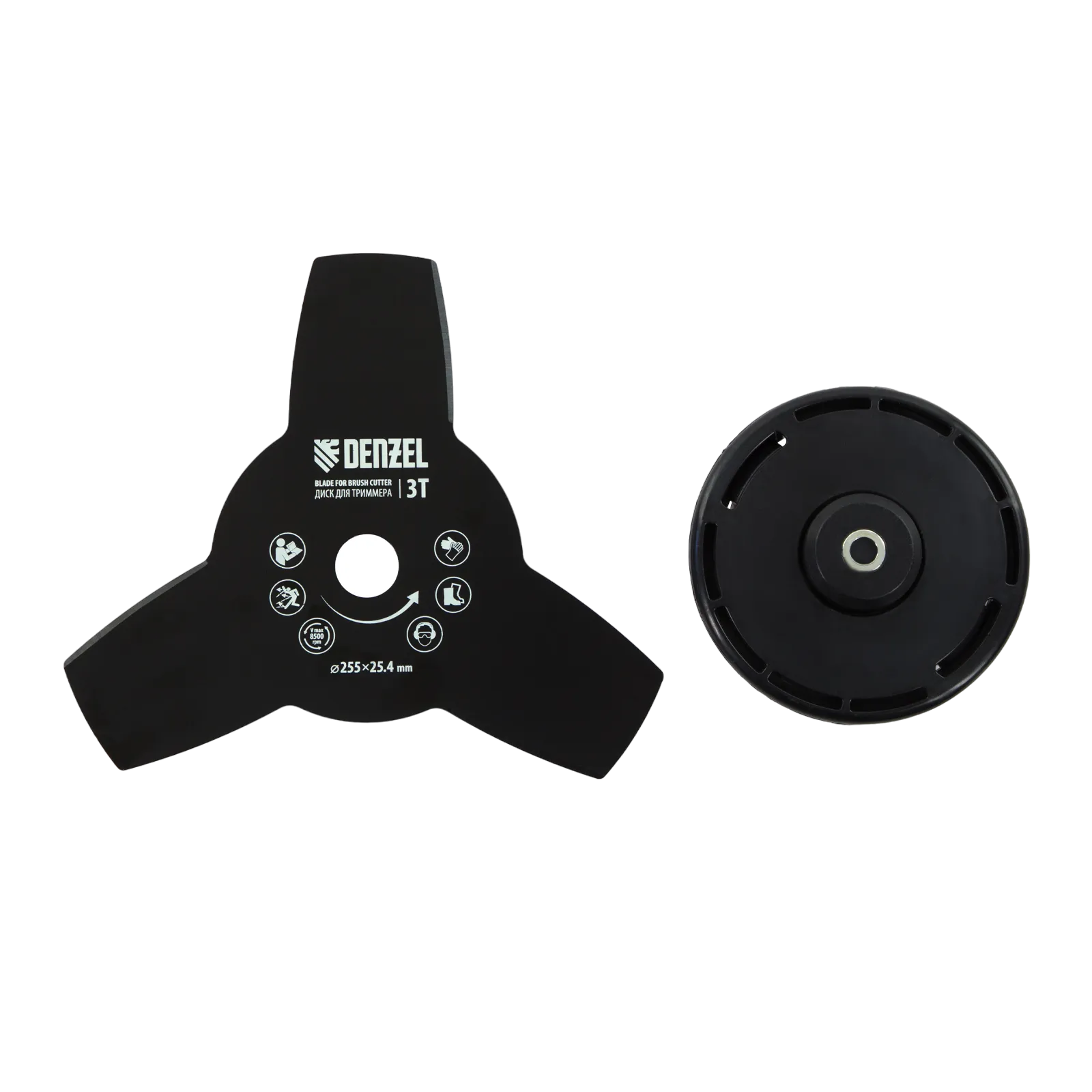 - Дополнительные возможности — можно приобрести диск Denzel 96323 с шириной скашивания 230 мм для быстрого удаления растительности с жесткими стеблями, 96328 для скашивания молодых побегов кустарника диаметром до 3 мм, 96340 для срезания борщевика, кустарника и молодых побегов деревьев с диаметром стволов до 10 мм.