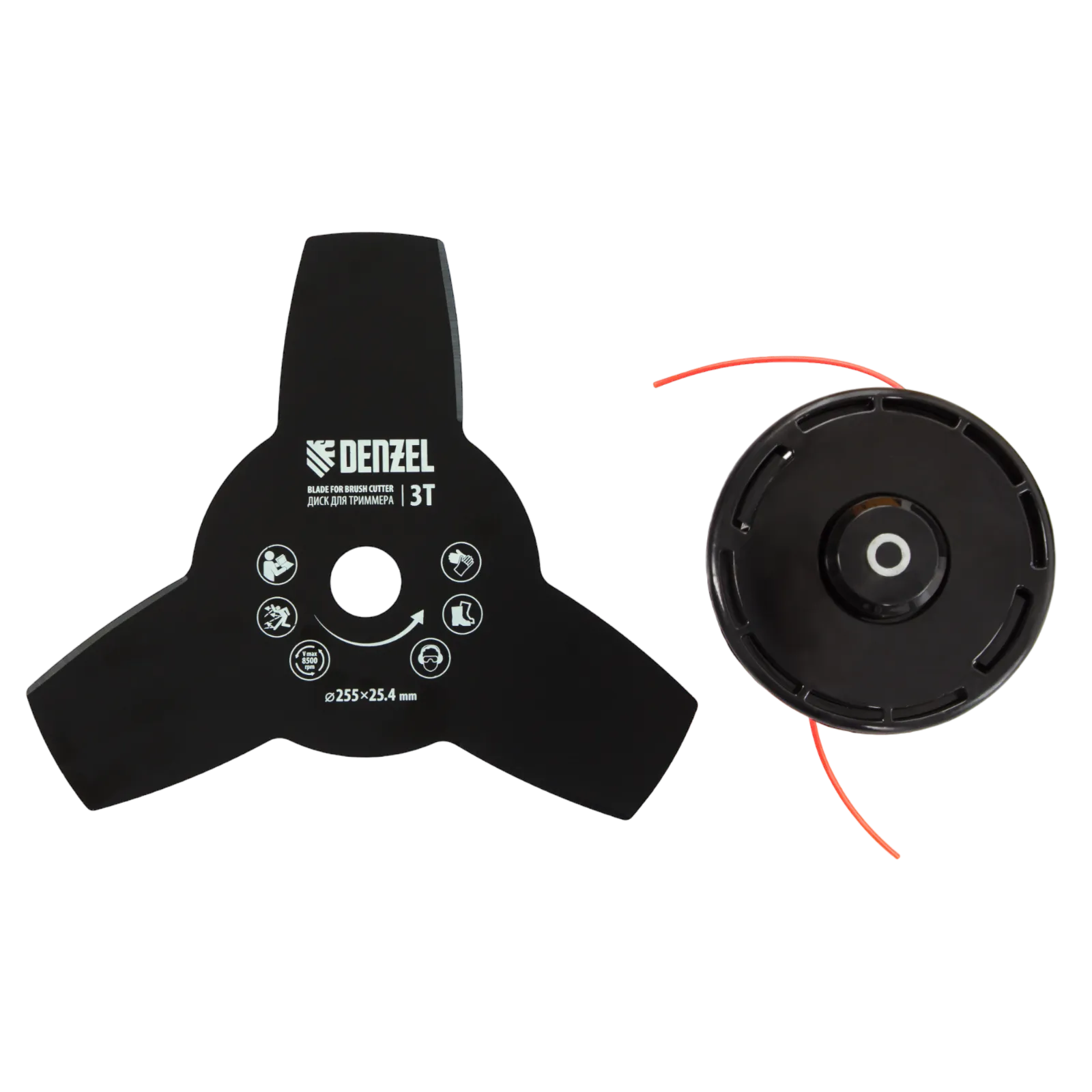 - Дополнительные возможности — можно приобрести диск Denzel 96323 с шириной скашивания 230 мм для быстрого удаления растительности с жесткими стеблями, 96328 для скашивания молодых побегов кустарника диаметром до 3 мм, 96340 для срезания борщевика, кустарника и молодых побегов деревьев с диаметром стволов до 10 мм.