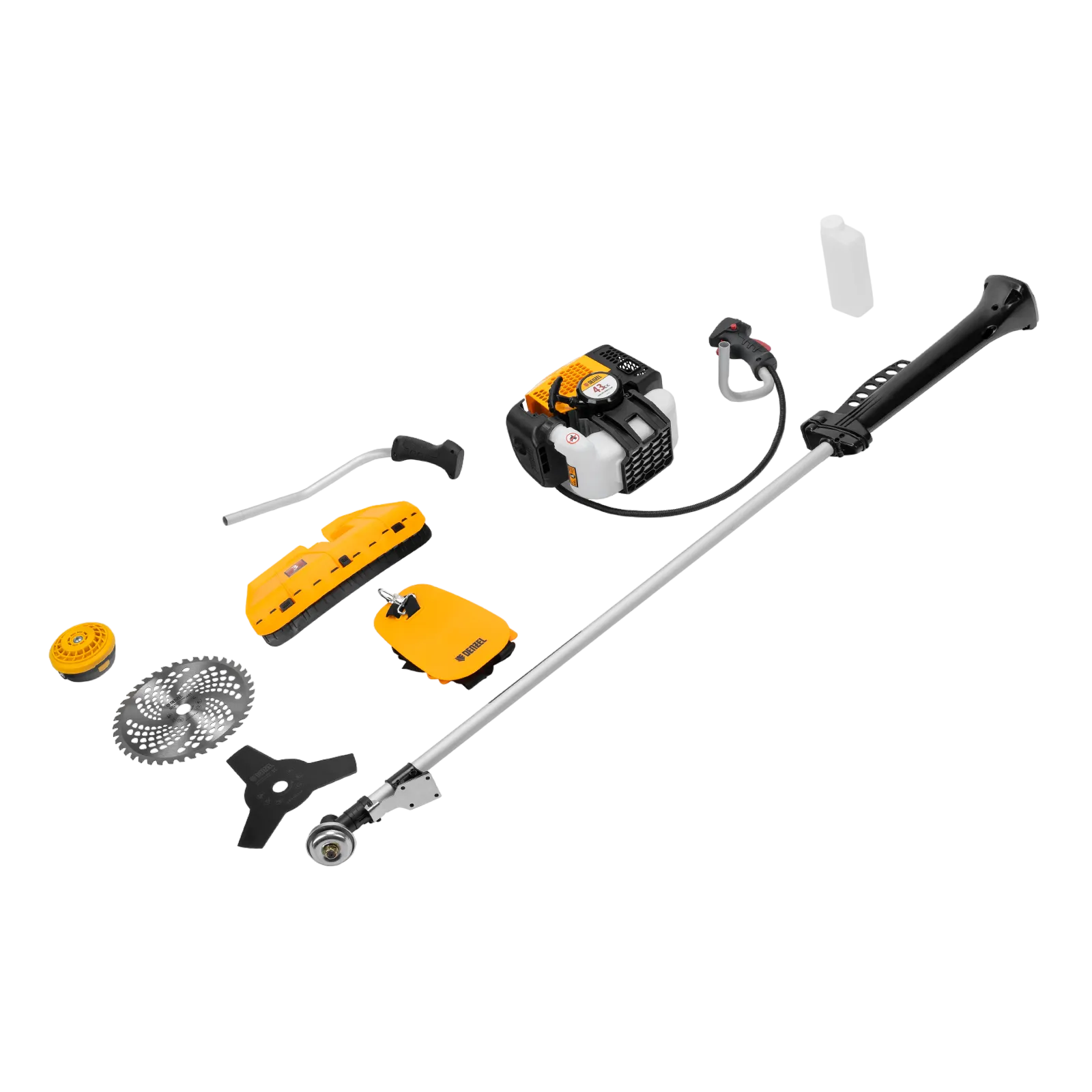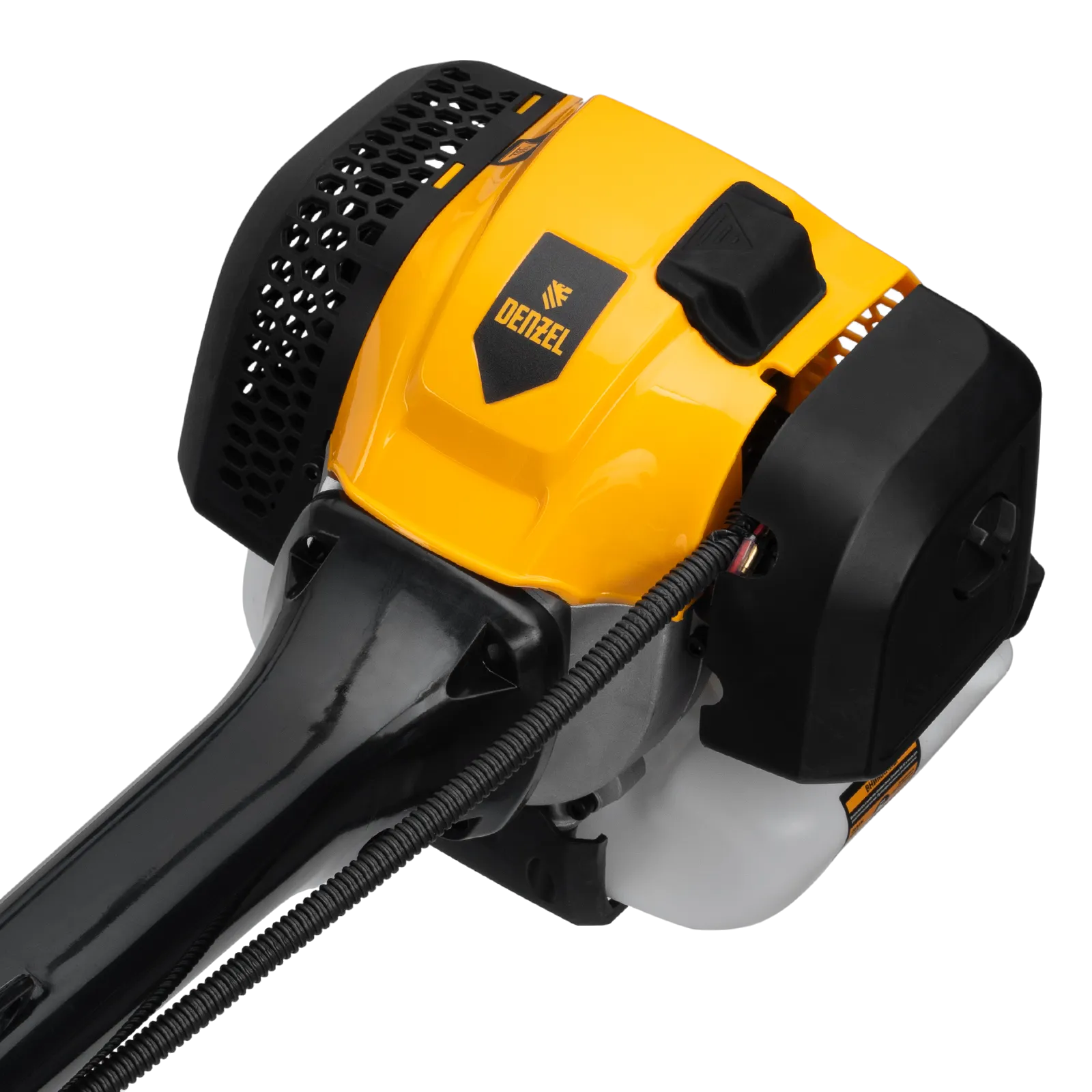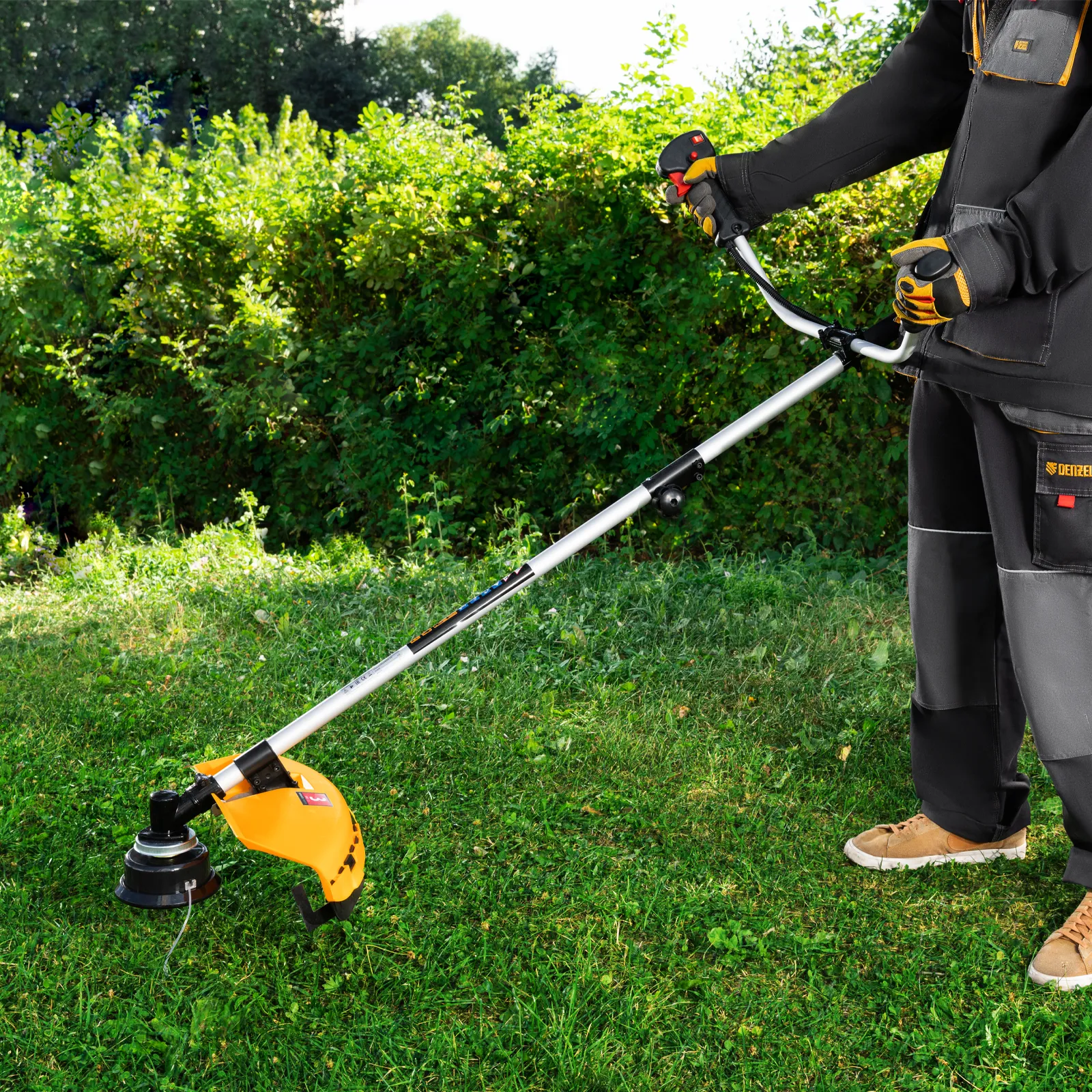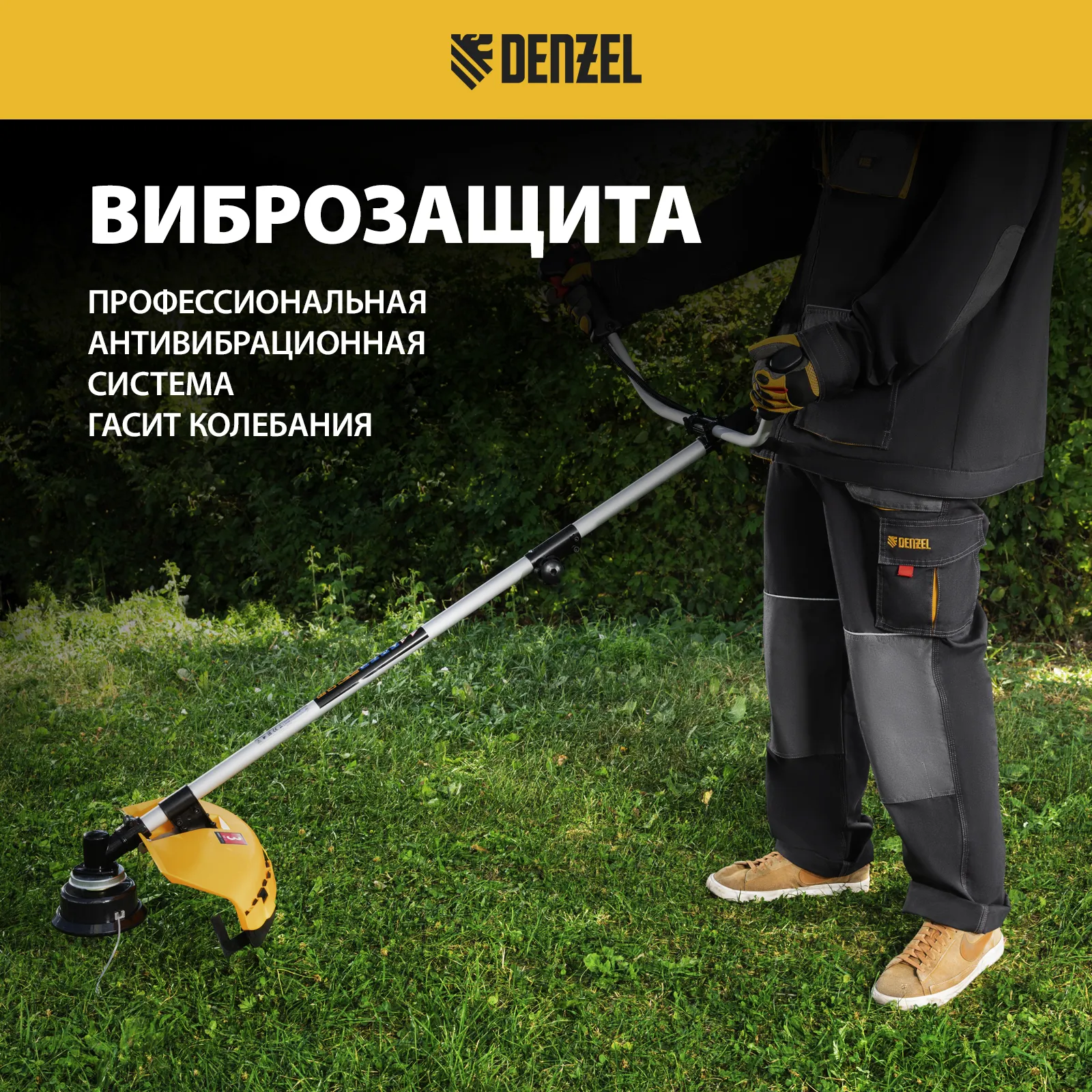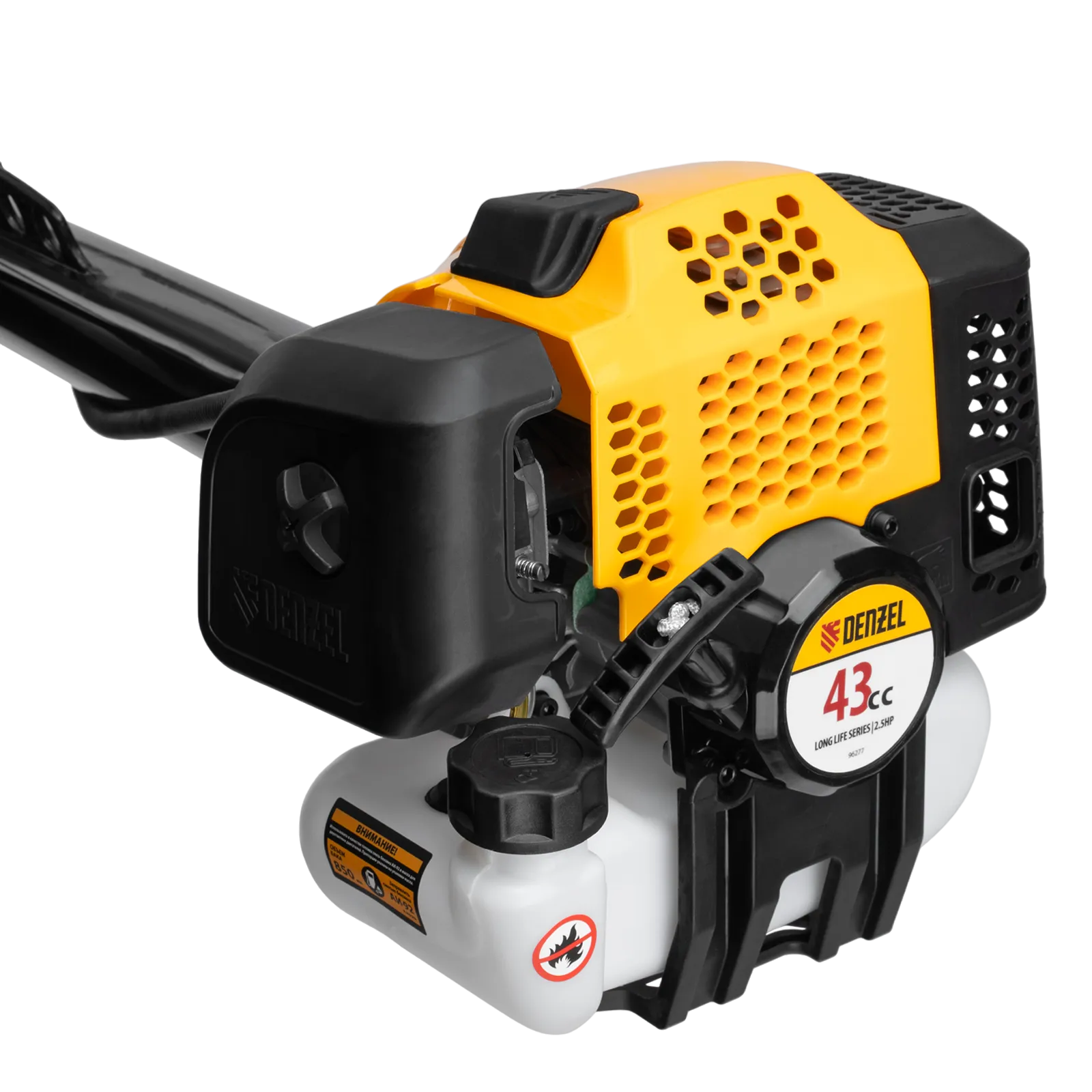 Бензиновый триммер Denzel DGT-43-PRO 96277 с системой анти-вибро и неразъемной штангой состоит из 2 частей и оснащен двигателем объемом 43 куб. см. Способен скашивать не только газонную траву, но и растительность с жесткими древовидными стеблями (полынь, крапиву, лебеду, борщевик), а также срезать кустарник и молодые побеги деревьев со стволами диаметром до 10 мм. Триммер эффективно справляется с поставленными задачами благодаря катушке с леской, трехлопастному ножу и пильному диску. За 1 час можно обработать участок площадью до 20 соток.
