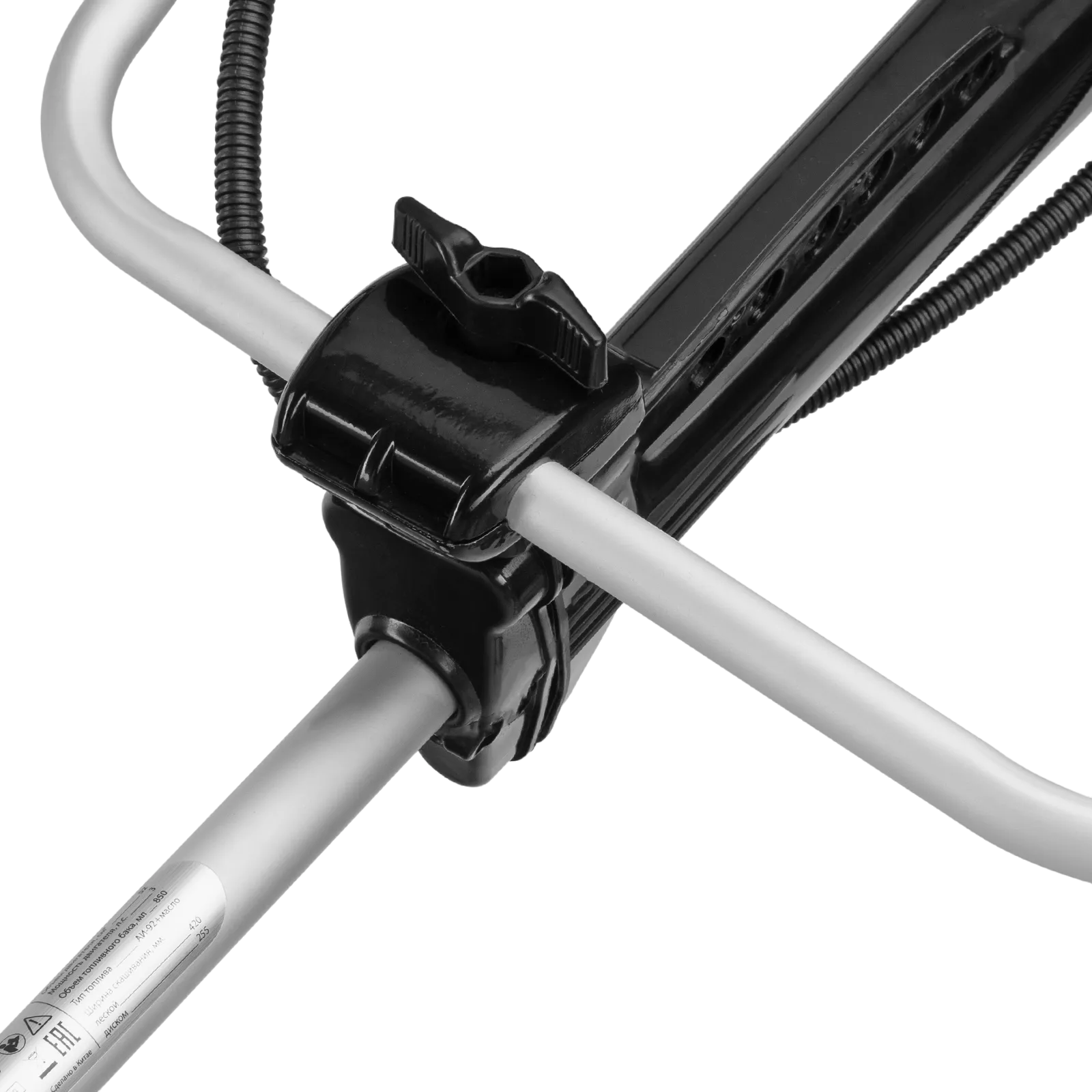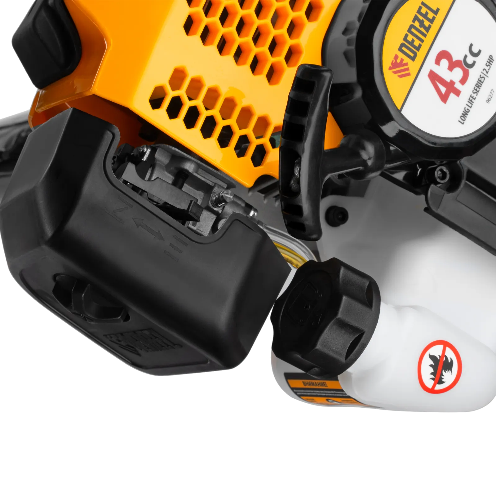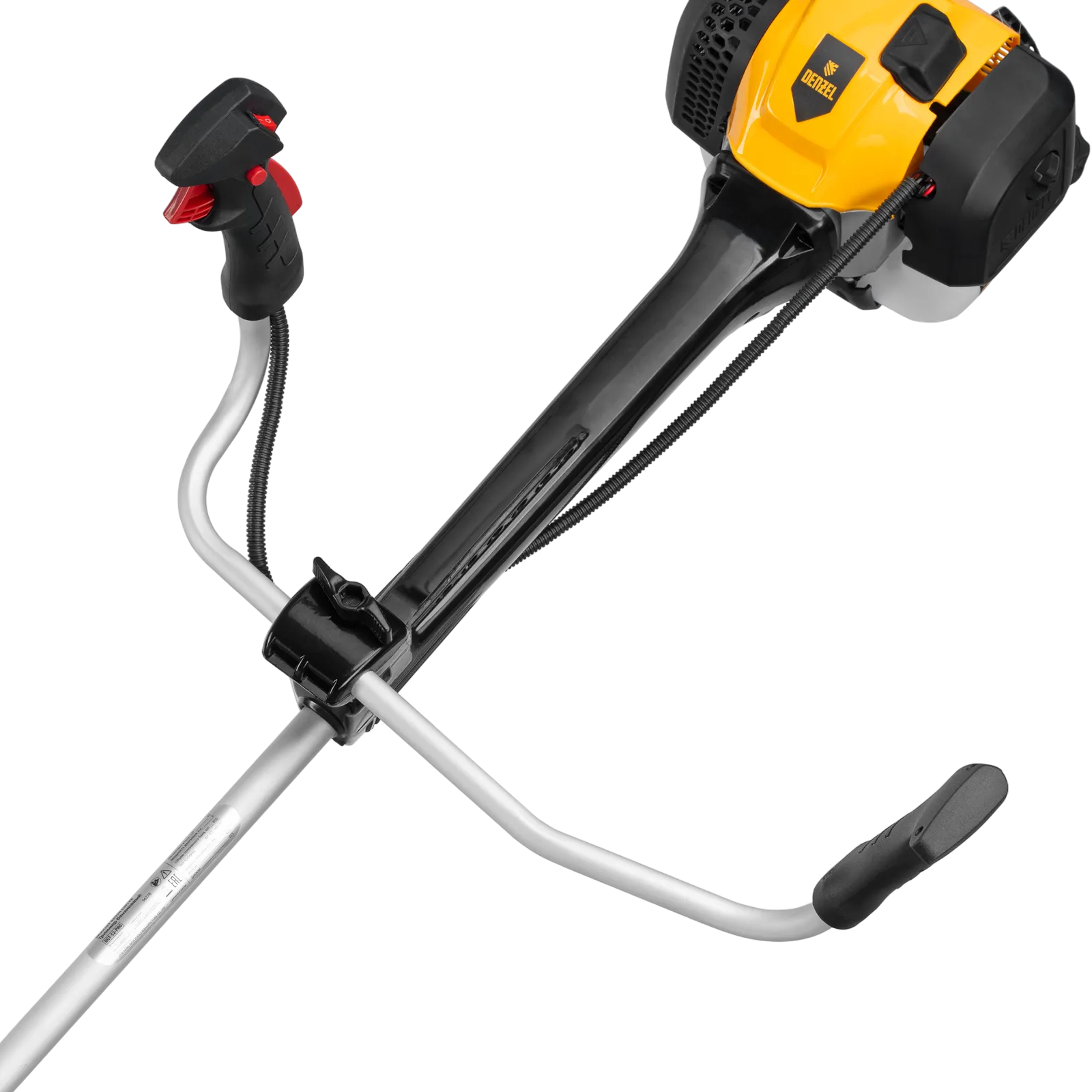 - Безопасность — защитный кожух из прочного пластика закрывает режущую часть, а блокиратор курка газа исключает случайный запуск двигателя.
