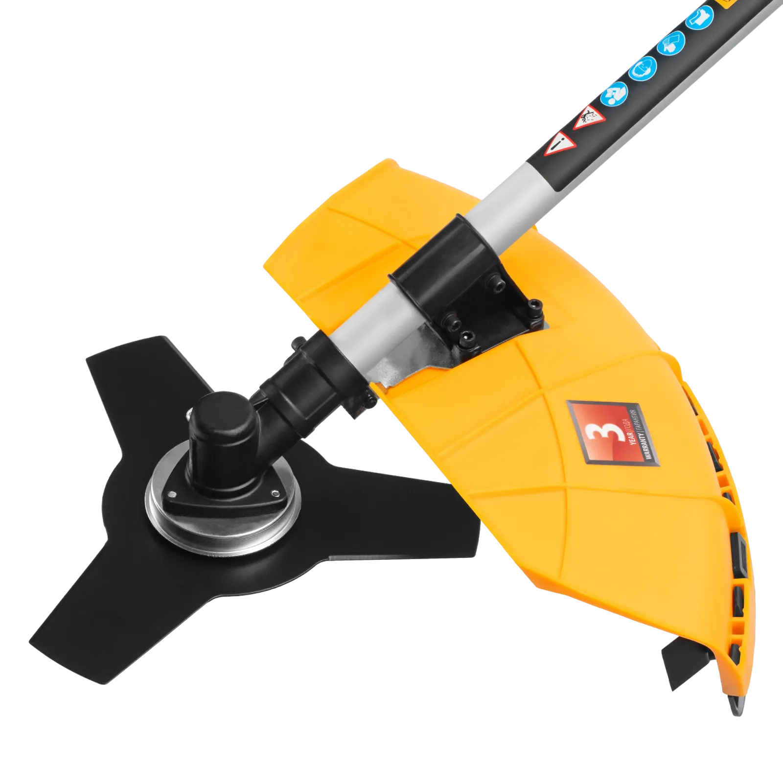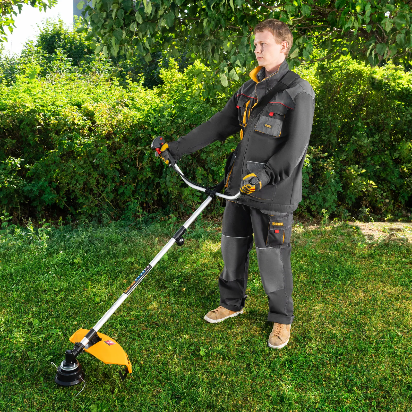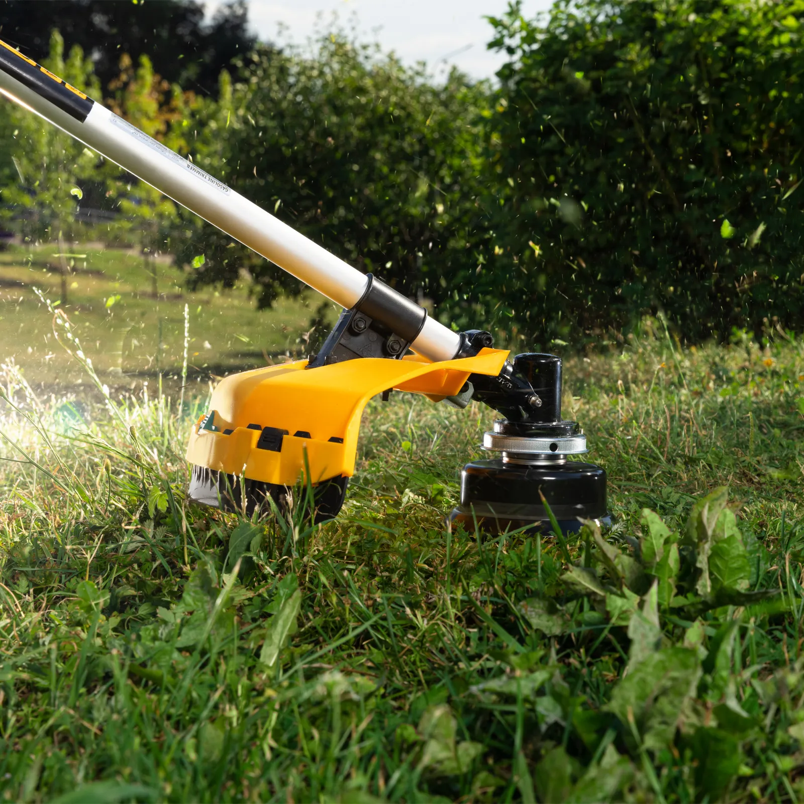 - Безопасность — защитный кожух из прочного пластика закрывает режущую часть, а блокиратор курка газа исключает случайный запуск двигателя.
