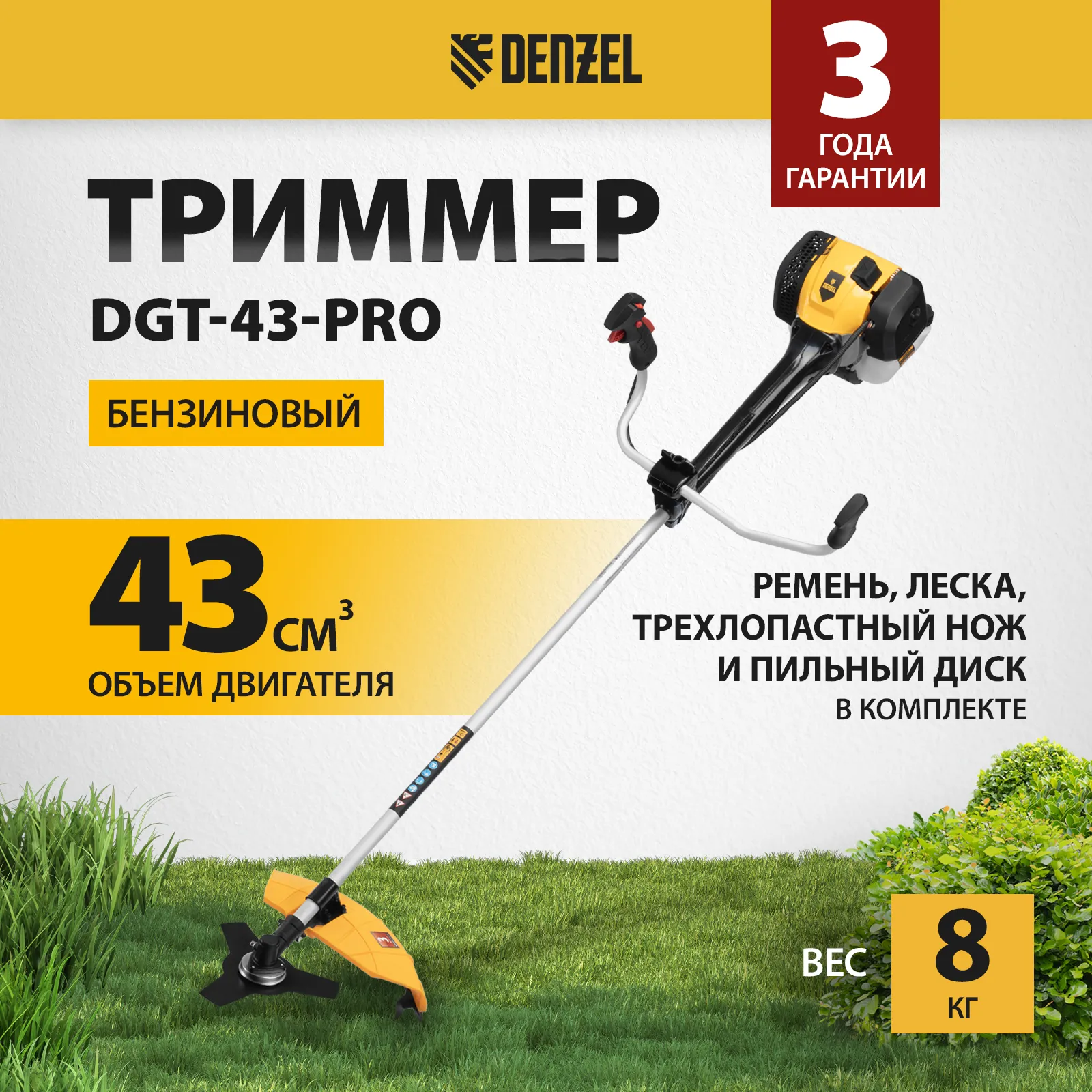 - Гарантия 3 года — надежность бензотриммера подтверждена производителем.