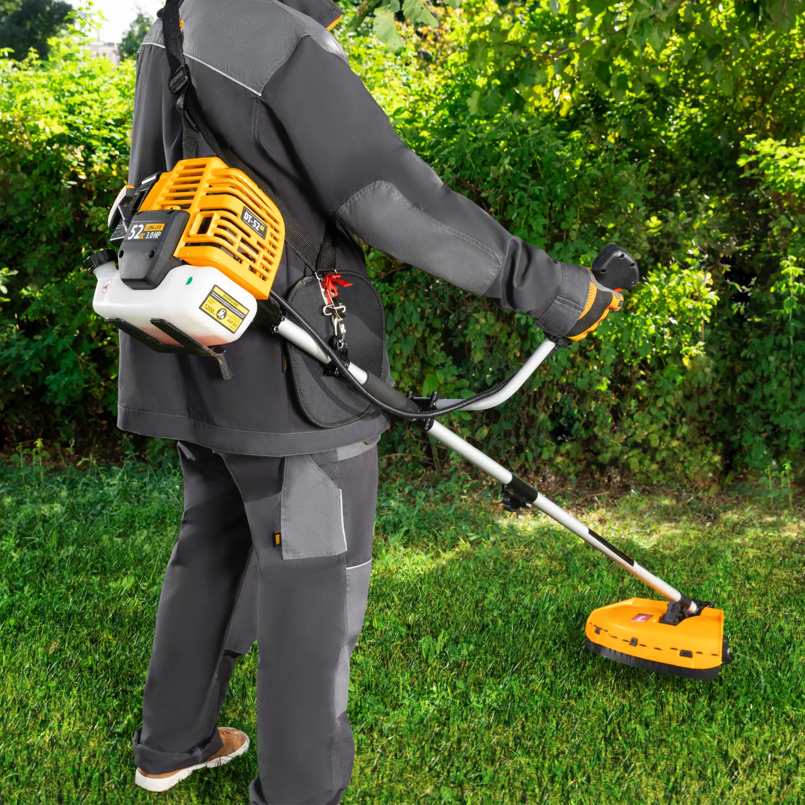 Надежный двухтактный двигатель мощностью 2,5 л.с. обеспечивает скорость вращения оснастки 9500 об/мин, благодаря чему триммер эффективно борется с густой травой. Редуктор и корпус сцепления поставляются уже установленными на штангу, что упрощает процесс финальной сборки инструмента.