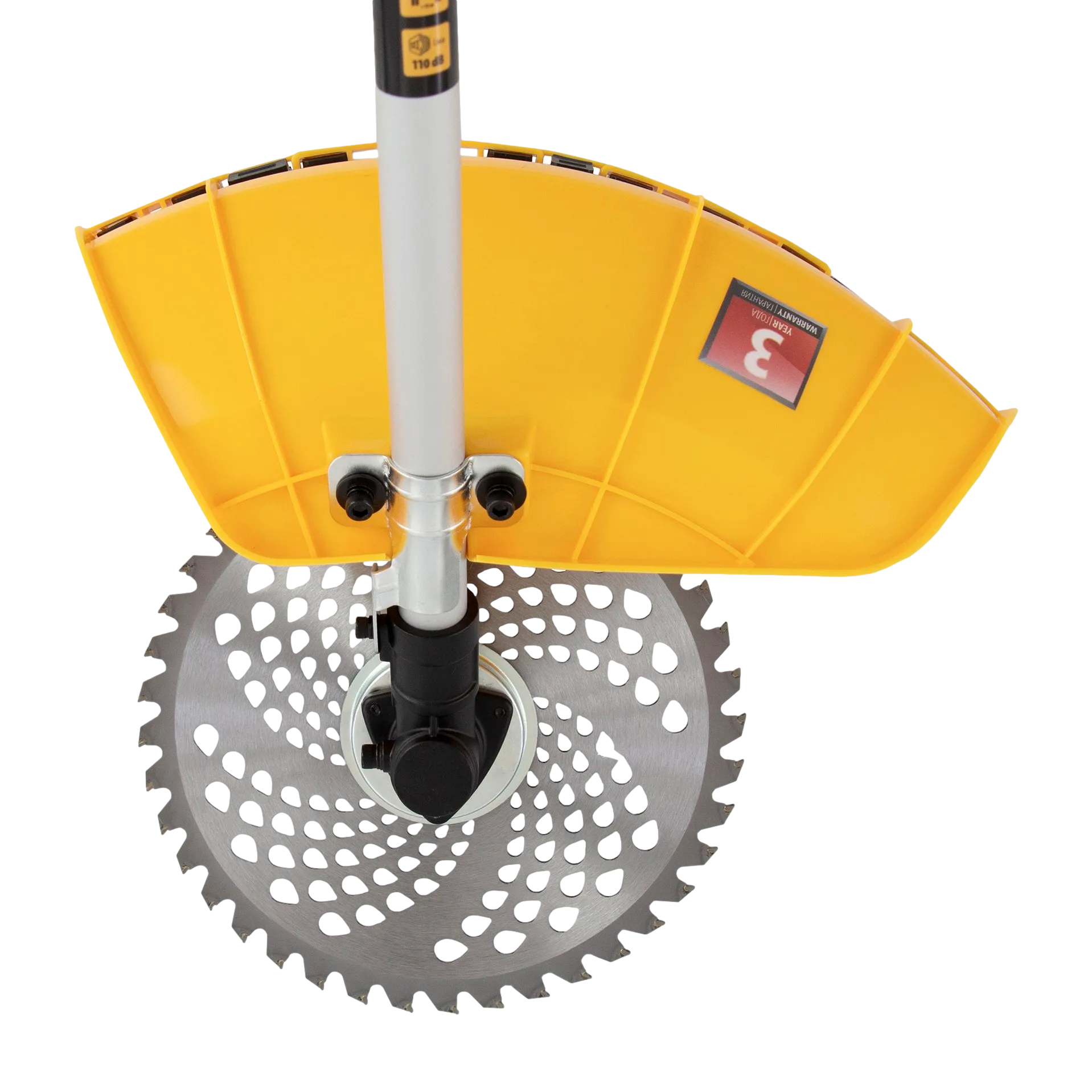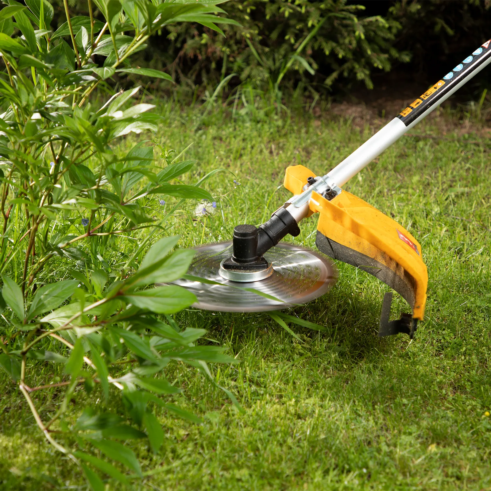 - Дополнительные возможности — можно приобрести диски Denzel 96323, 96325 для быстрого удаления растительности с жесткими стеблями, 96328 для скашивания молодых побегов кустарника диаметром до 3 мм.