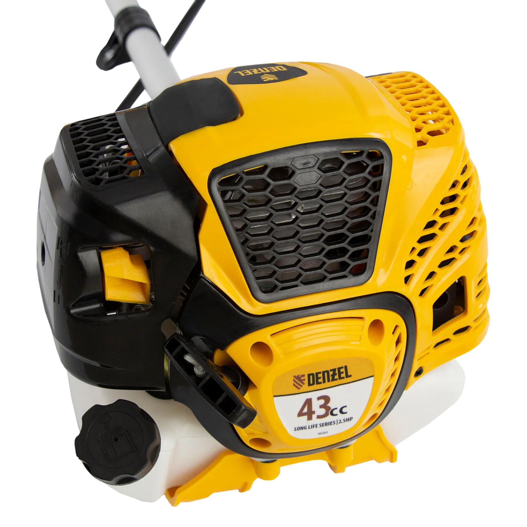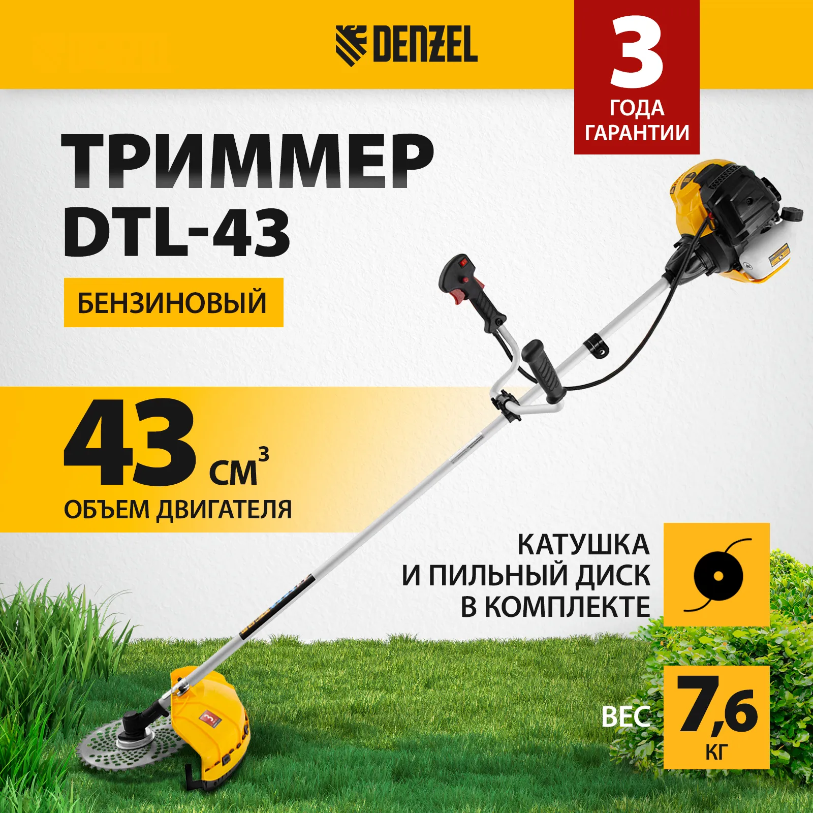 Бензиновый триммер Denzel DTL-43 96263 с двигателем объемом 43 см3, имеет неразъемную штангу и поставляется комплектом из 2 частей. Предназначен для скашивания травы всех типов, в том числе с жесткими древовидными стеблями (полыни, крапивы, лебеды, борщевика), а также срезания кустарника и молодых побегов деревьев с диаметром стволов до 10 мм. Двигатель мощностью 2,5 л.с. обеспечивает скорость вращения насадок 9500 об/мин. В комплект входят 2 оснастки: катушка с леской (обеспечивает ширину скашивания 42 см) и остро заточенный пильный диск (25,5 см). Триммер не зависит от наличия электросети, поэтому его можно использовать вдали от дома. Эргономичная конструкция обеспечивает маневренность даже на труднодоступных участках.