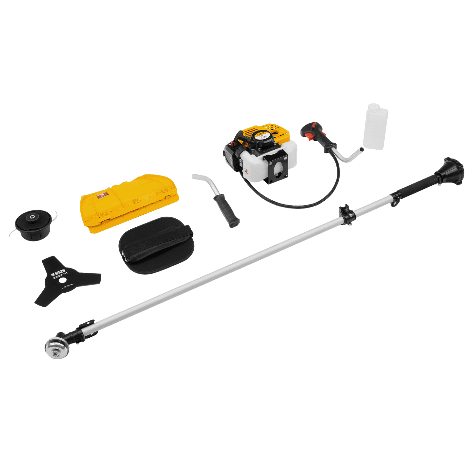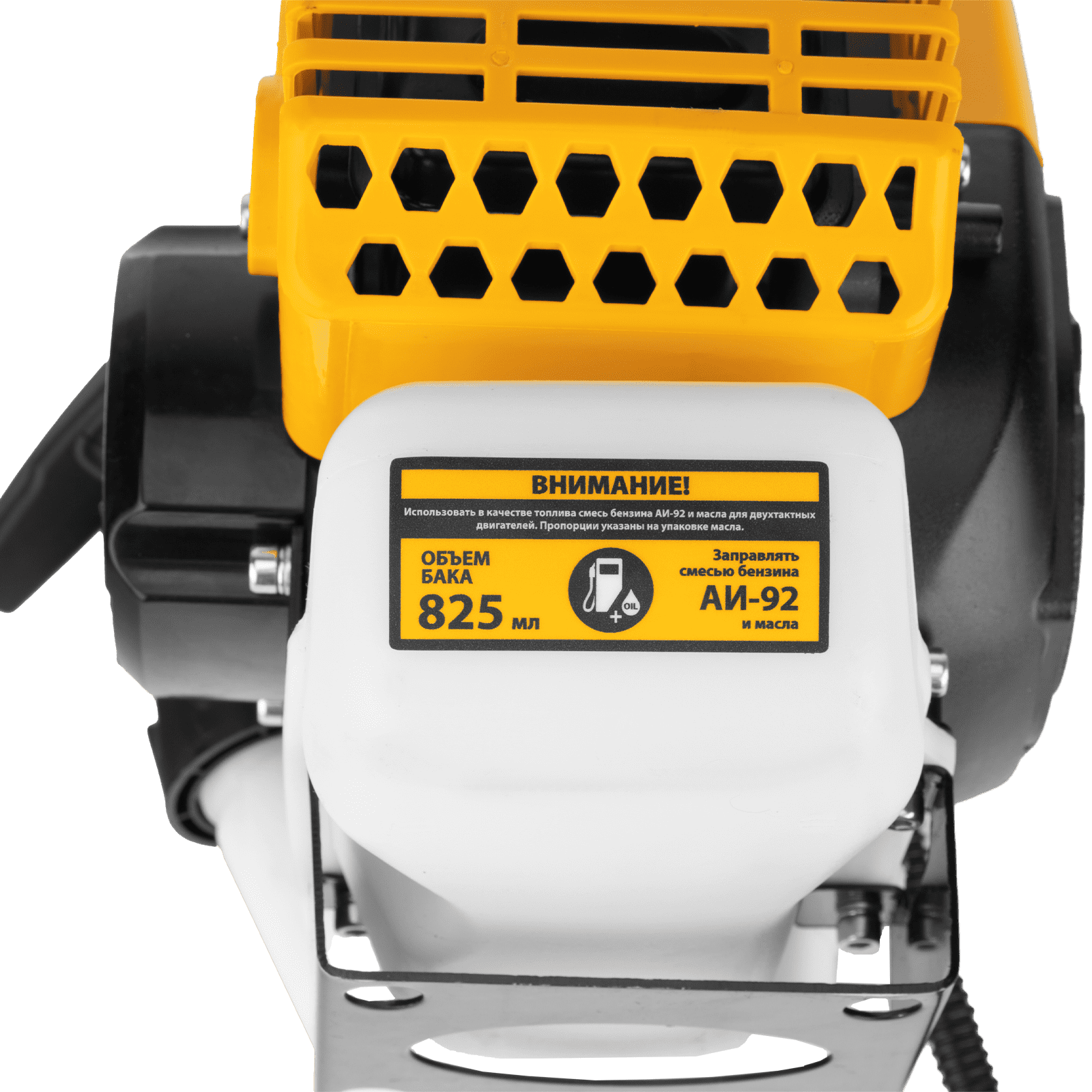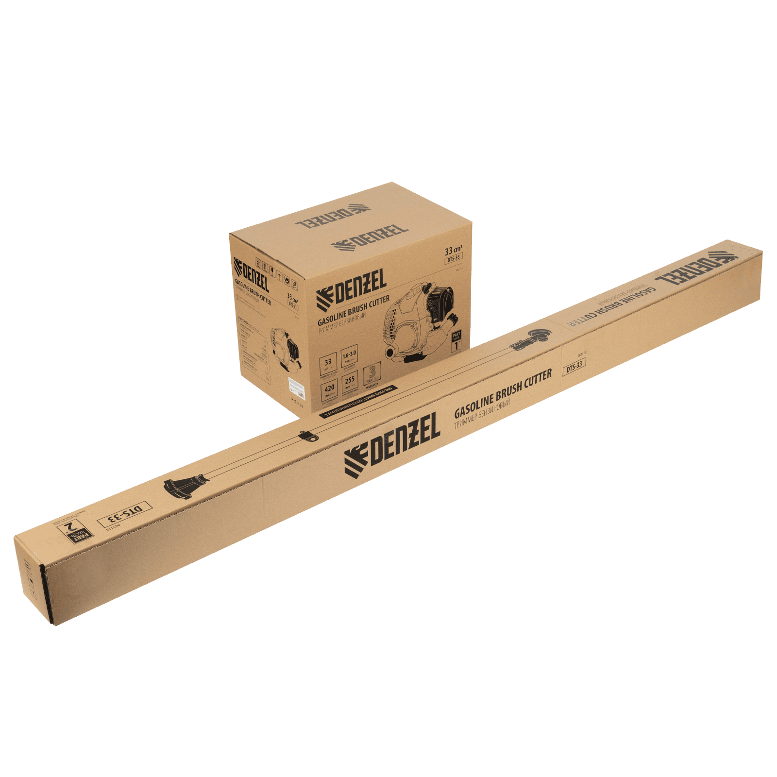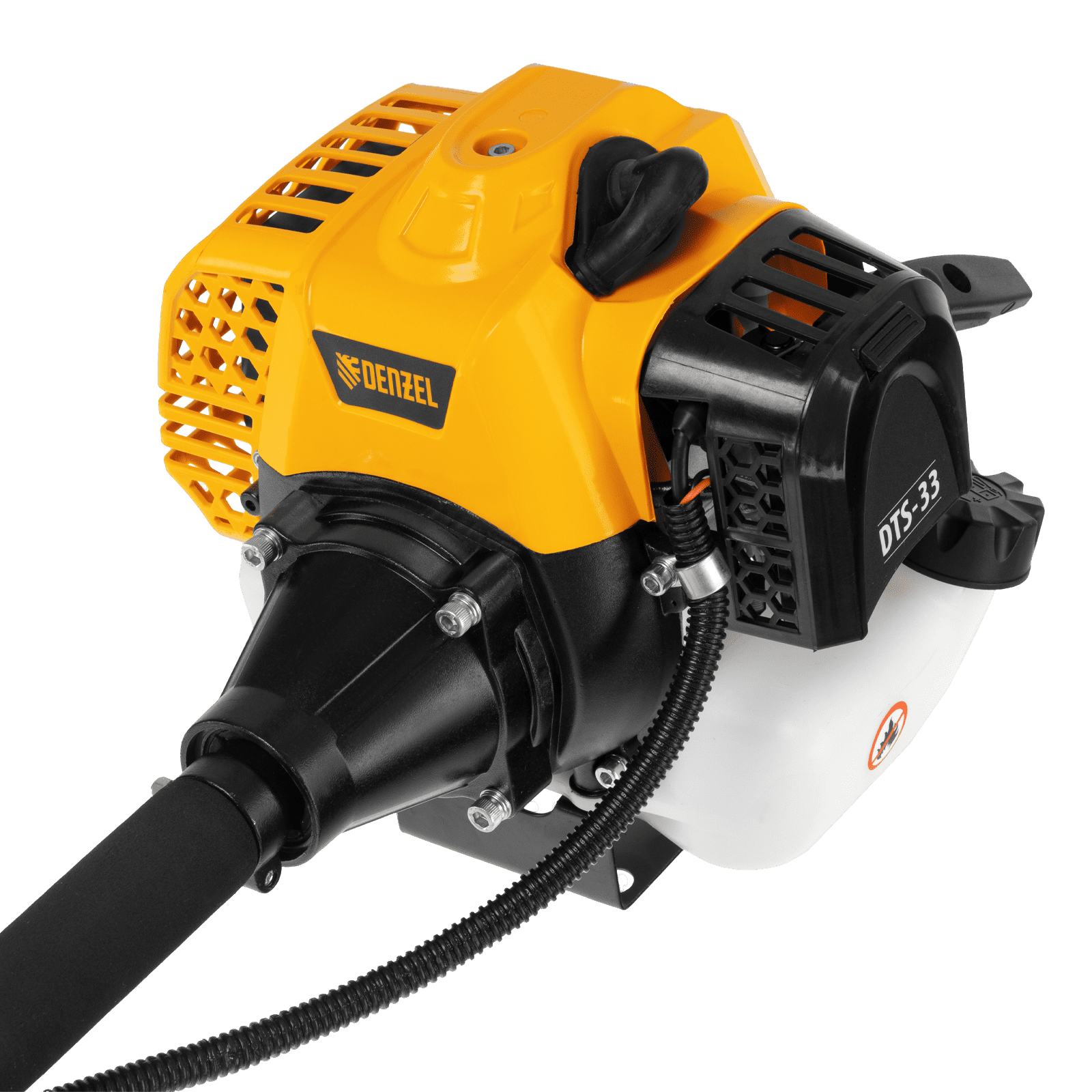 Бензиновый триммер Denzel DTS-33 962115 с двигателем объемом 33 куб. см и неразъемной штангой поставляется комплектом из 2 частей. Усиленная катушка с леской предназначена для скашивания мягкой травы, а трехлопастный нож — для скашивания травы различных типов, в том числе с жесткими стеблями (полыни, крапивы, лебеды). Ширина скашивания леской составляет 42 см, ножом — 25,5 см.;Двухтактный бензиновый двигатель мощностью 1,8 л.с. обеспечивает эффективное решение поставленных задач и полную автономность. Работать можно даже в самых отдаленных участках сада, не заботясь о наличии сети электропитания.