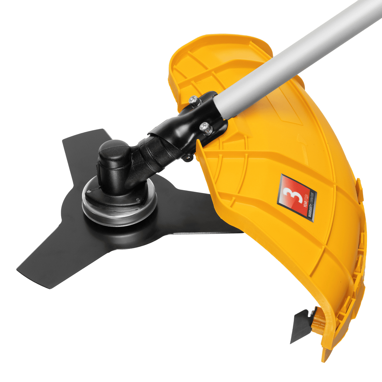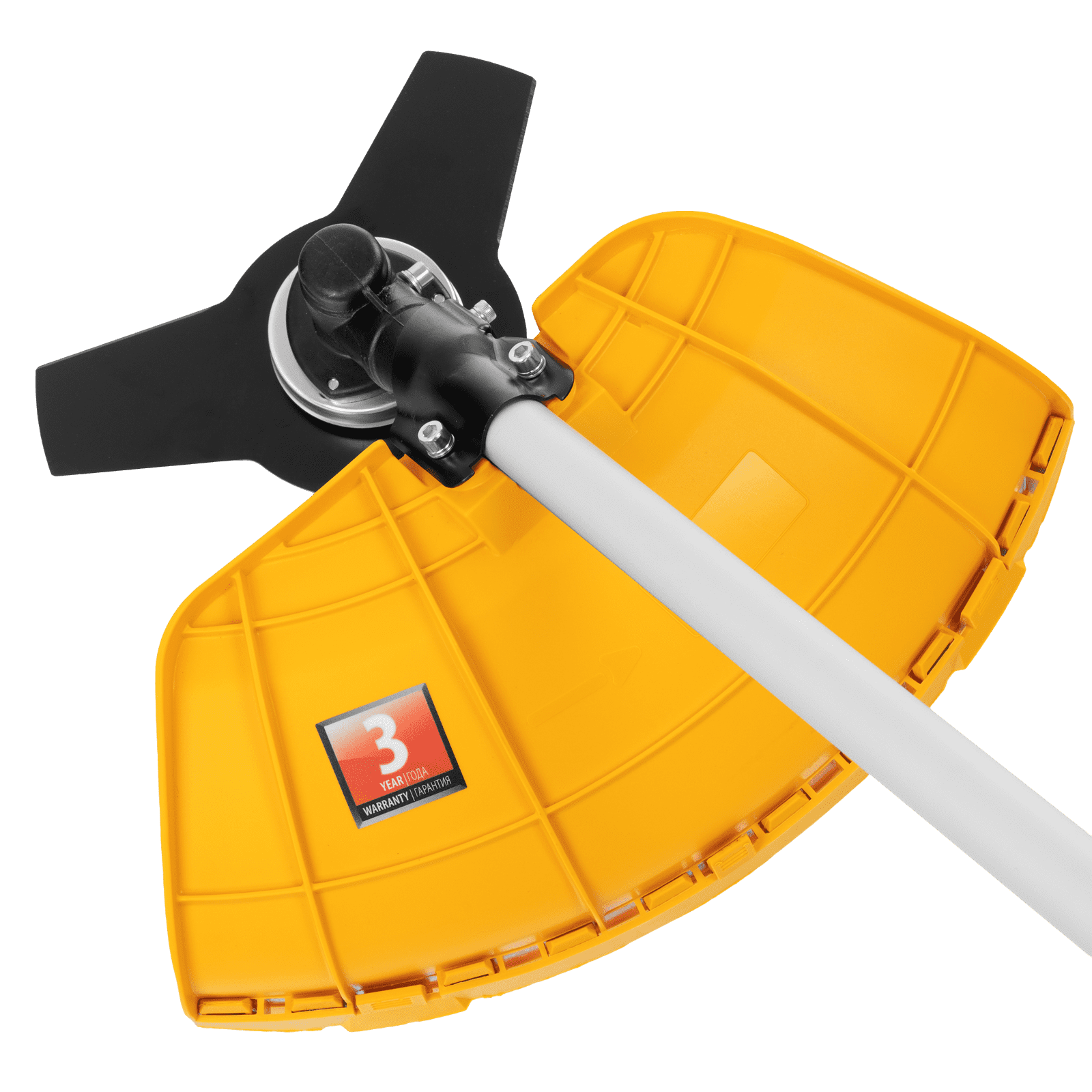 - Безопасная эксплуатация — прочный кожух, закрывающий оснастку, защищает пользователя от летящей травы, грязи и мелких камней.
