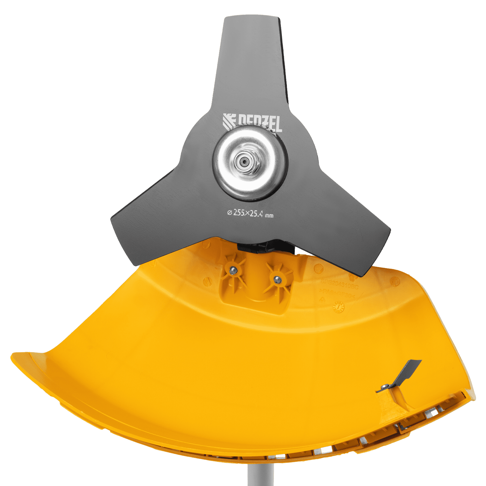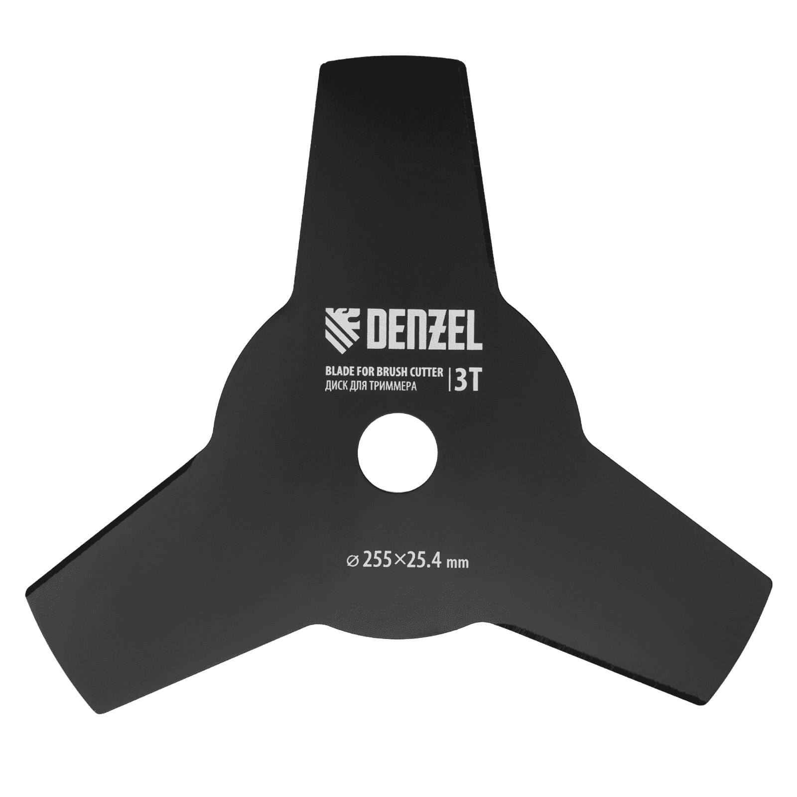 - Дополнительные возможности — можно приобрести диск Denzel 96323 с шириной скашивания 230 мм для быстрого удаления растительности с жесткими стеблями, 96328 для скашивания молодых побегов кустарника диаметром до 3 мм, 96340 для срезания борщевика, кустарника и молодых побегов деревьев с диаметром стволов до 10 мм.