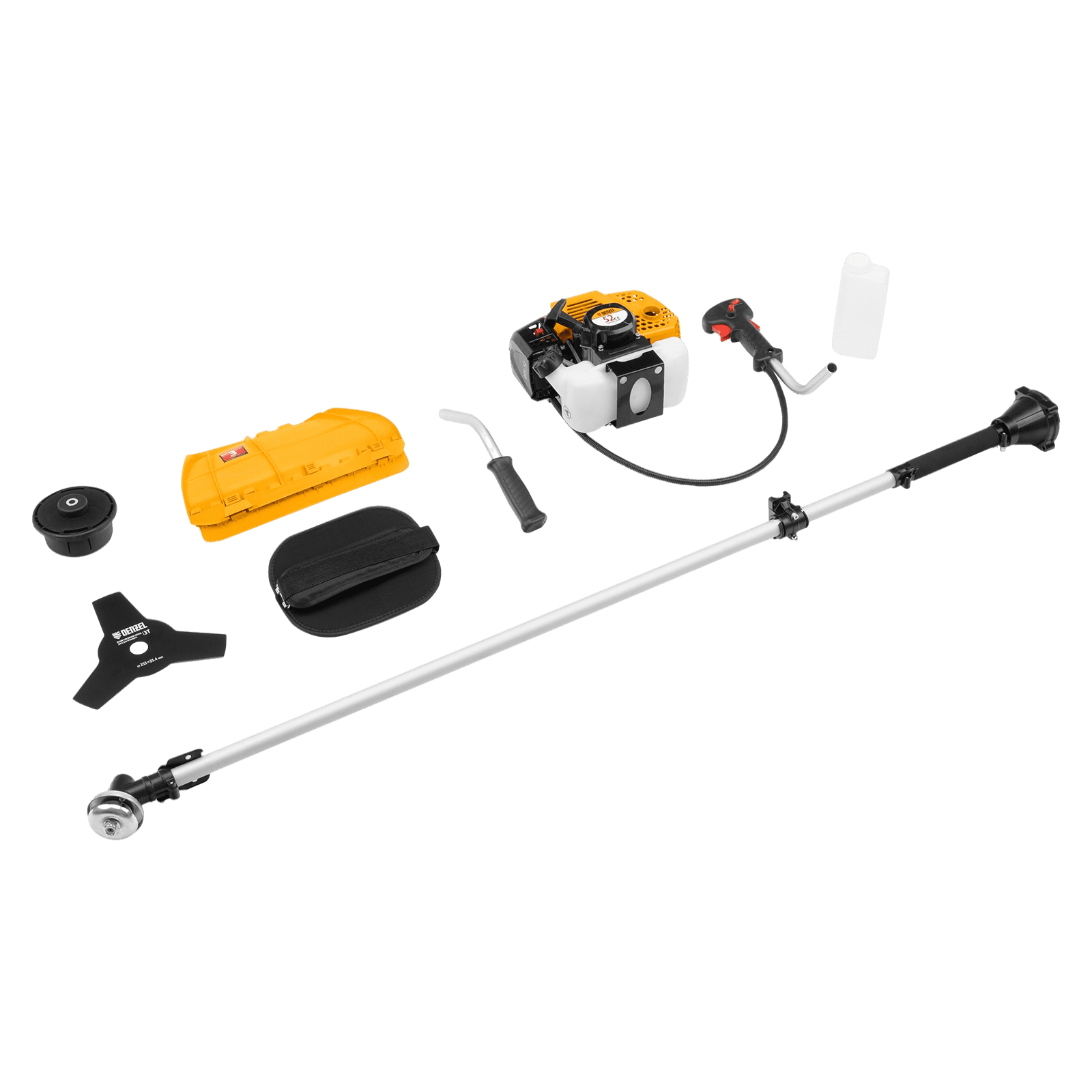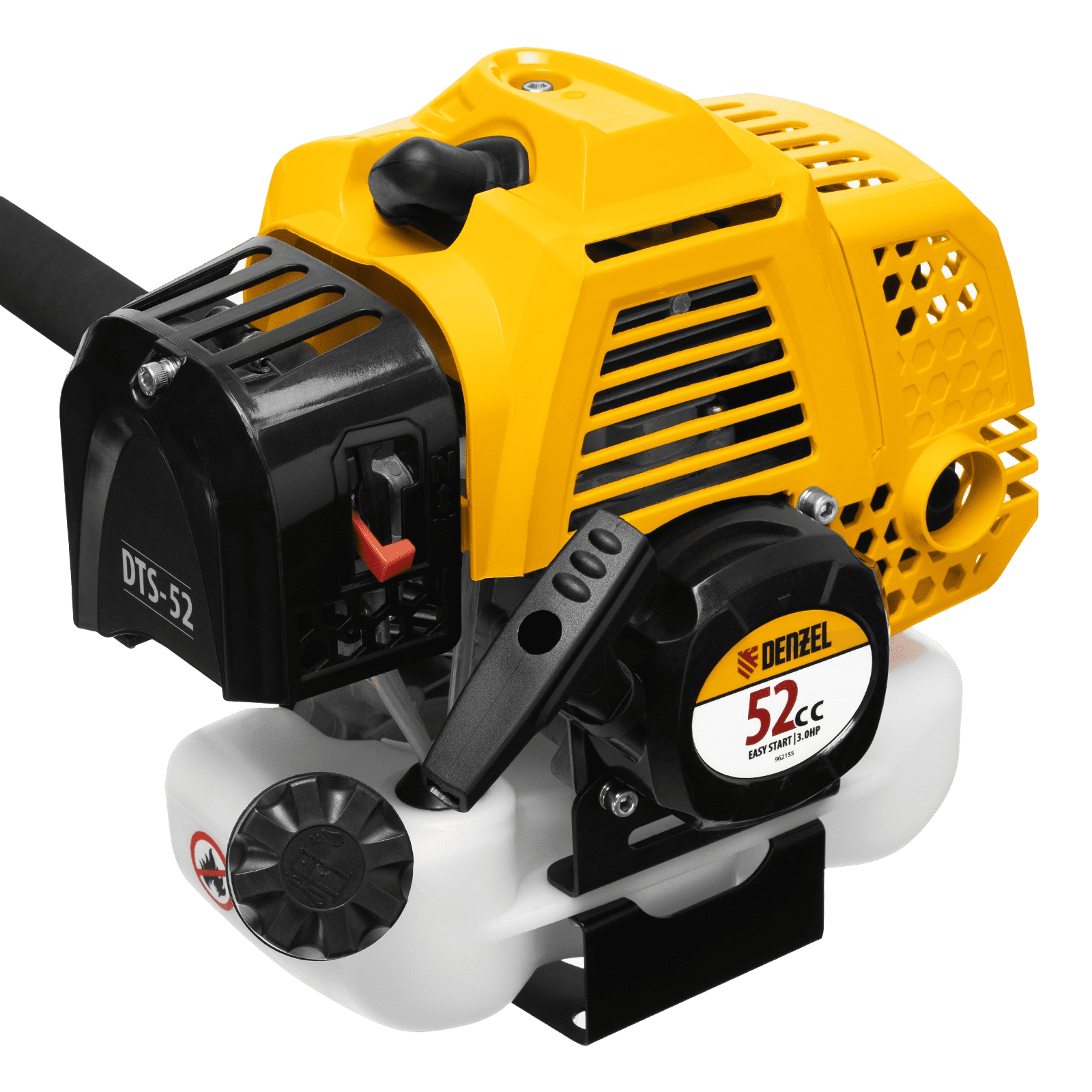 Бензиновый триммер Denzel DTS-52 962155 с двигателем объемом 52 куб. см и неразъемной штангой поставляется комплектом из 2 частей. Усиленная катушка с леской предназначена для скашивания мягкой травы, а трехлопастный нож — для скашивания травы различных типов, в том числе с жесткими стеблями (полыни, крапивы, лебеды). Ширина скашивания леской составляет 42 см, ножом — 25,5 см.;Двухтактный бензиновый двигатель мощностью 3 л.с. обеспечивает эффективное решение поставленных задач и полную автономность. Работать можно даже в самых отдаленных участках сада, не заботясь о наличии сети электропитания.