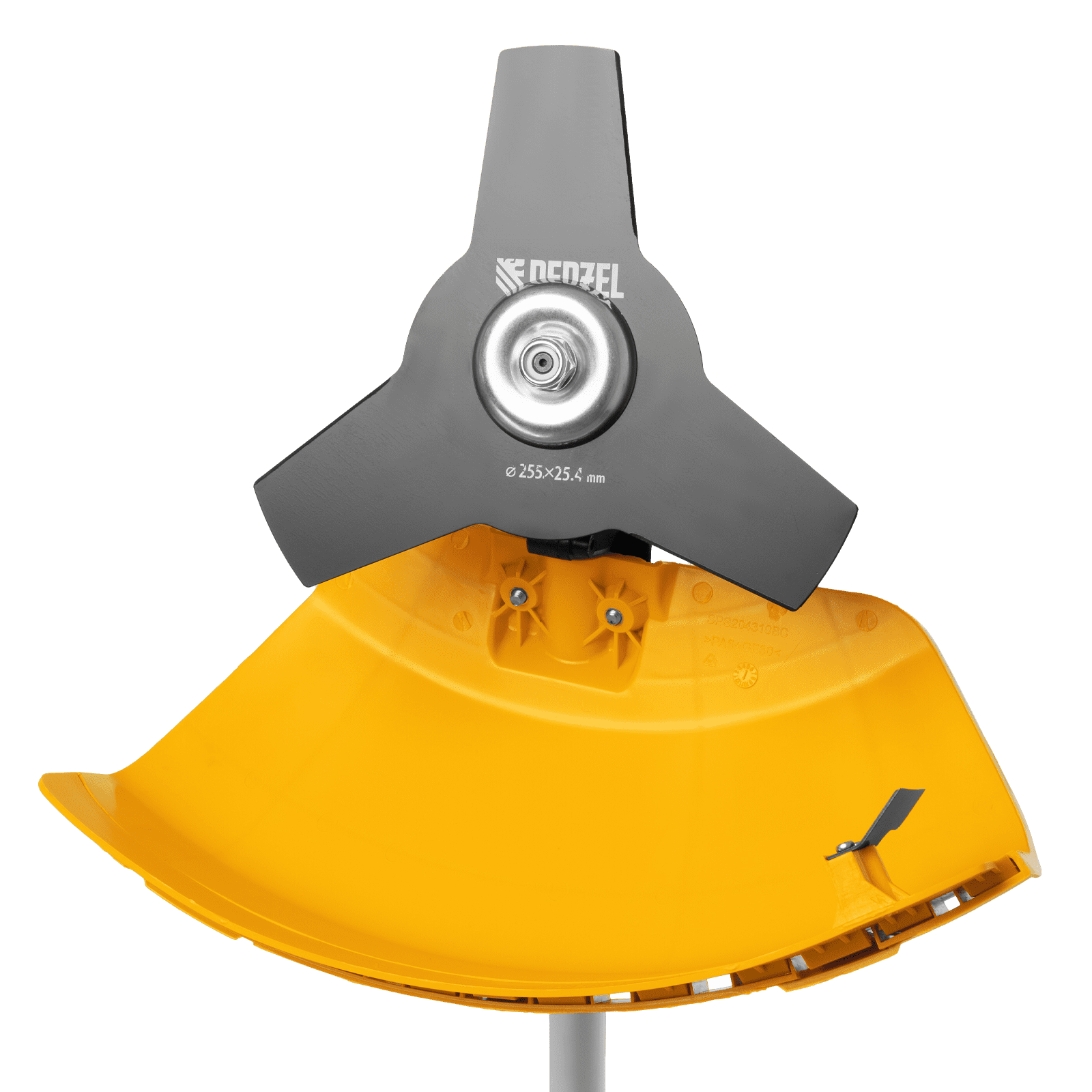 - Дополнительные возможности — можно приобрести диск Denzel 96323 с шириной скашивания 230 мм для быстрого удаления растительности с жесткими стеблями, 96328 для скашивания молодых побегов кустарника диаметром до 3 мм, 96340 для срезания борщевика, кустарника и молодых побегов деревьев с диаметром стволов до 10 мм.