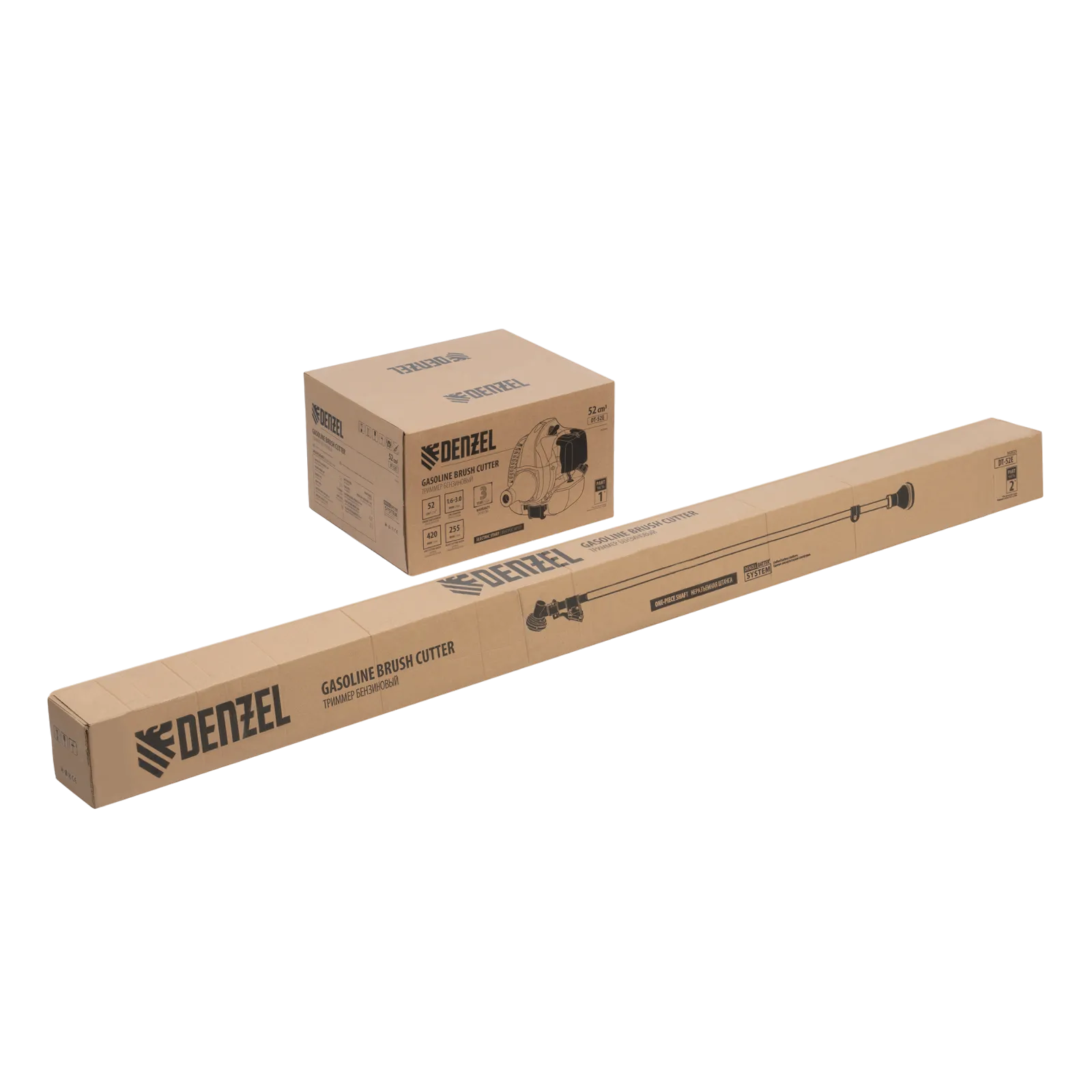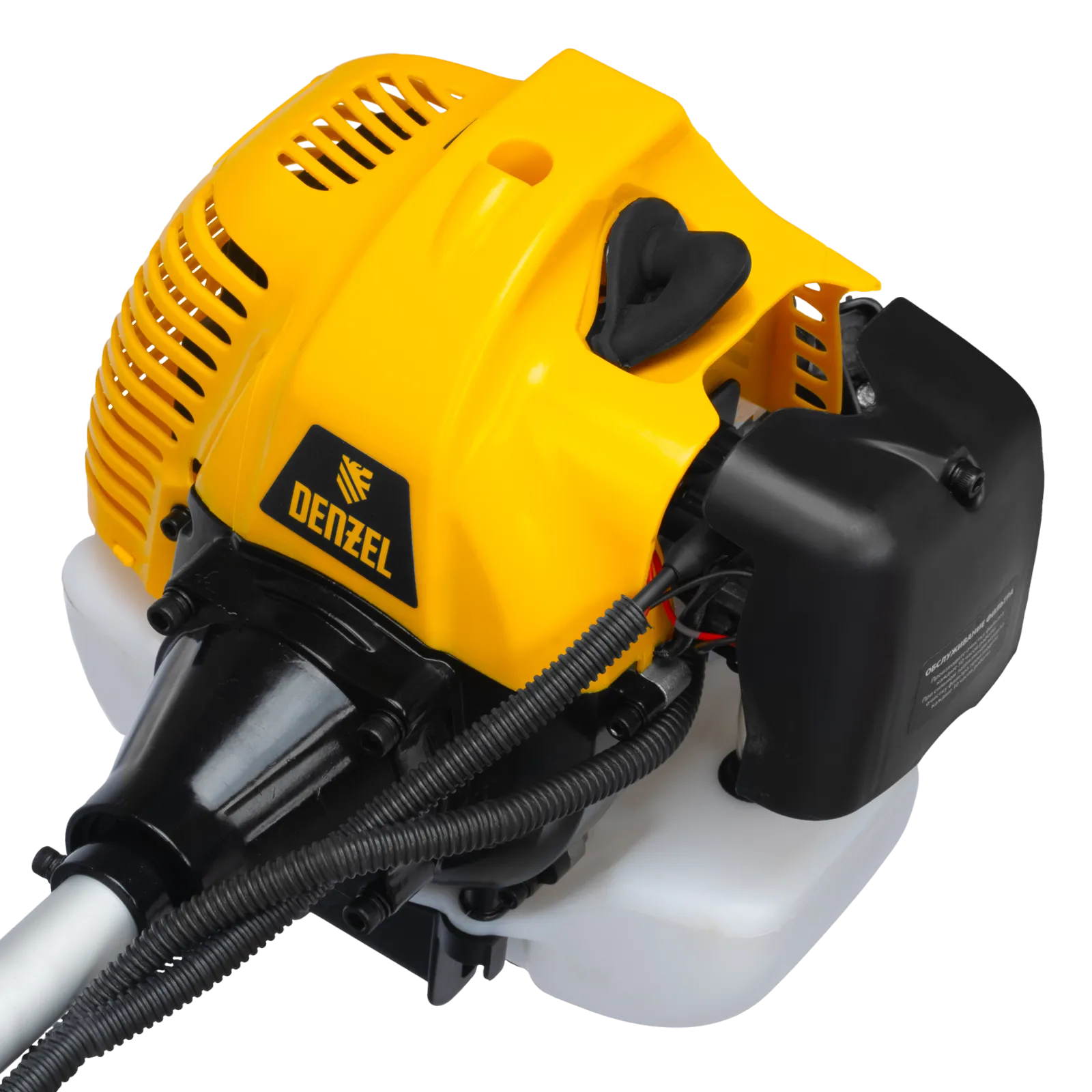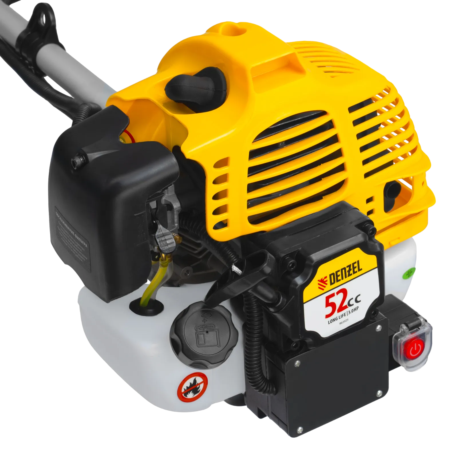 Бензиновый триммер Denzel DT-52E 962025 с двигателем объемом 52 куб. см, с неразъемной штангой и электростартером, поставляется комплектом из 2 частей и используется для ухода за дачным участком. С его помощью можно подравнять газон, скосить траву любого типа, в том числе с жесткими древовидными стеблями (полынь, крапива, лебеда, борщевик), а также срезать кустарник и молодые побеги деревьев с диаметром стволов до 10 мм. Триммер успешно справляется с этими задачами благодаря входящим в комплект катушке с леской и пильному диску с шириной скашивания 42 и 25,5 см соответственно. На штангу уже установлен редуктор и корпус сцепления, что упрощает подготовку инструмента к работе.