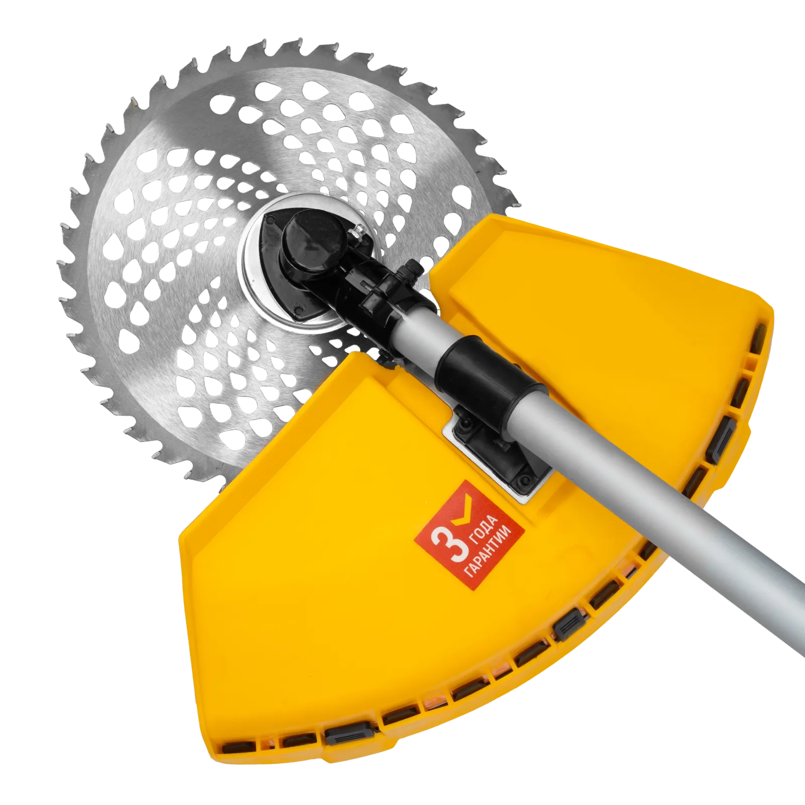 - Дополнительные возможности — можно приобрести и установить на триммер диски Denzel 96323, 96325 для быстрого удаления растительности с жесткими стеблями (полыни, крапивы, лебеды), 96328 для скашивания молодых побегов кустарника диаметром до 3 мм.
