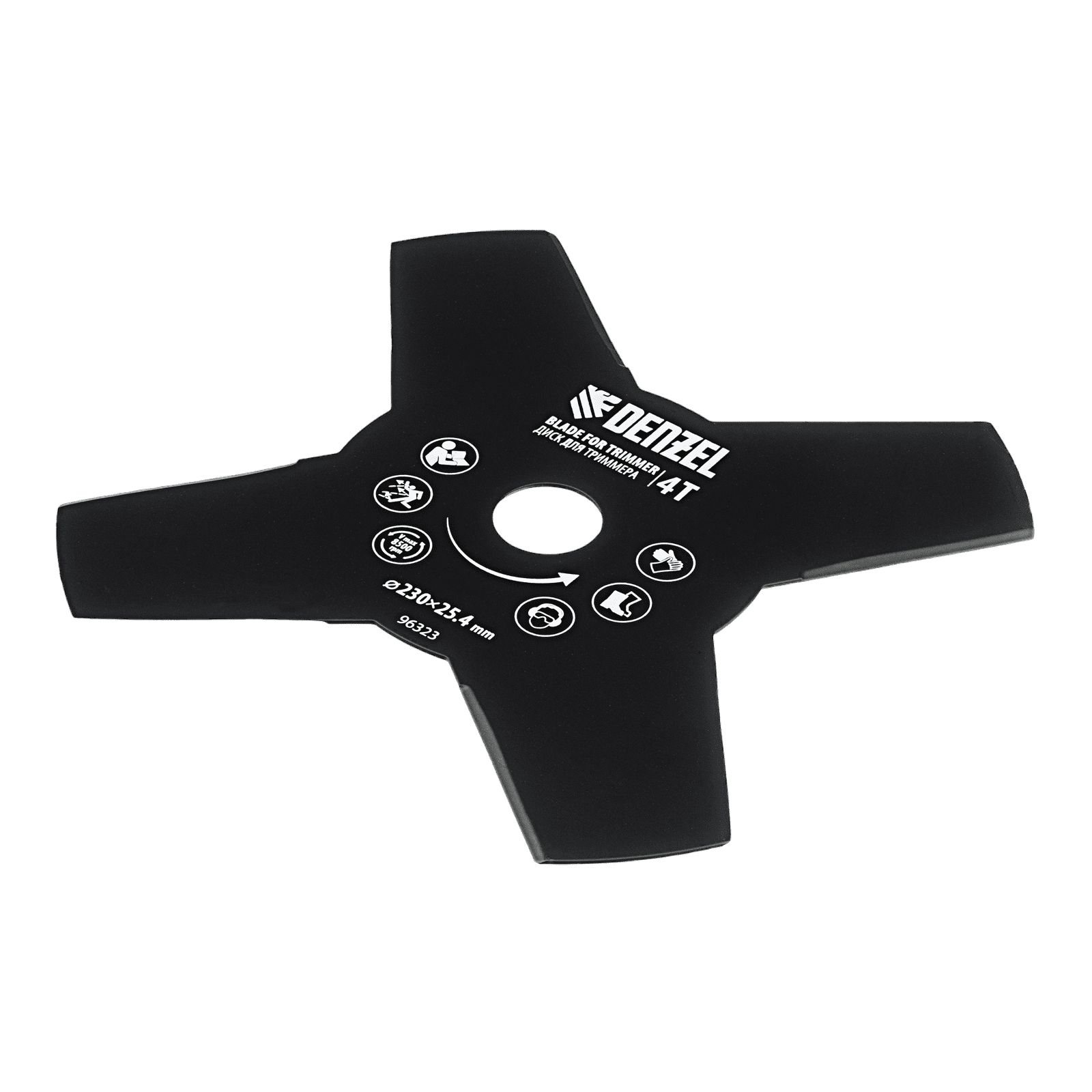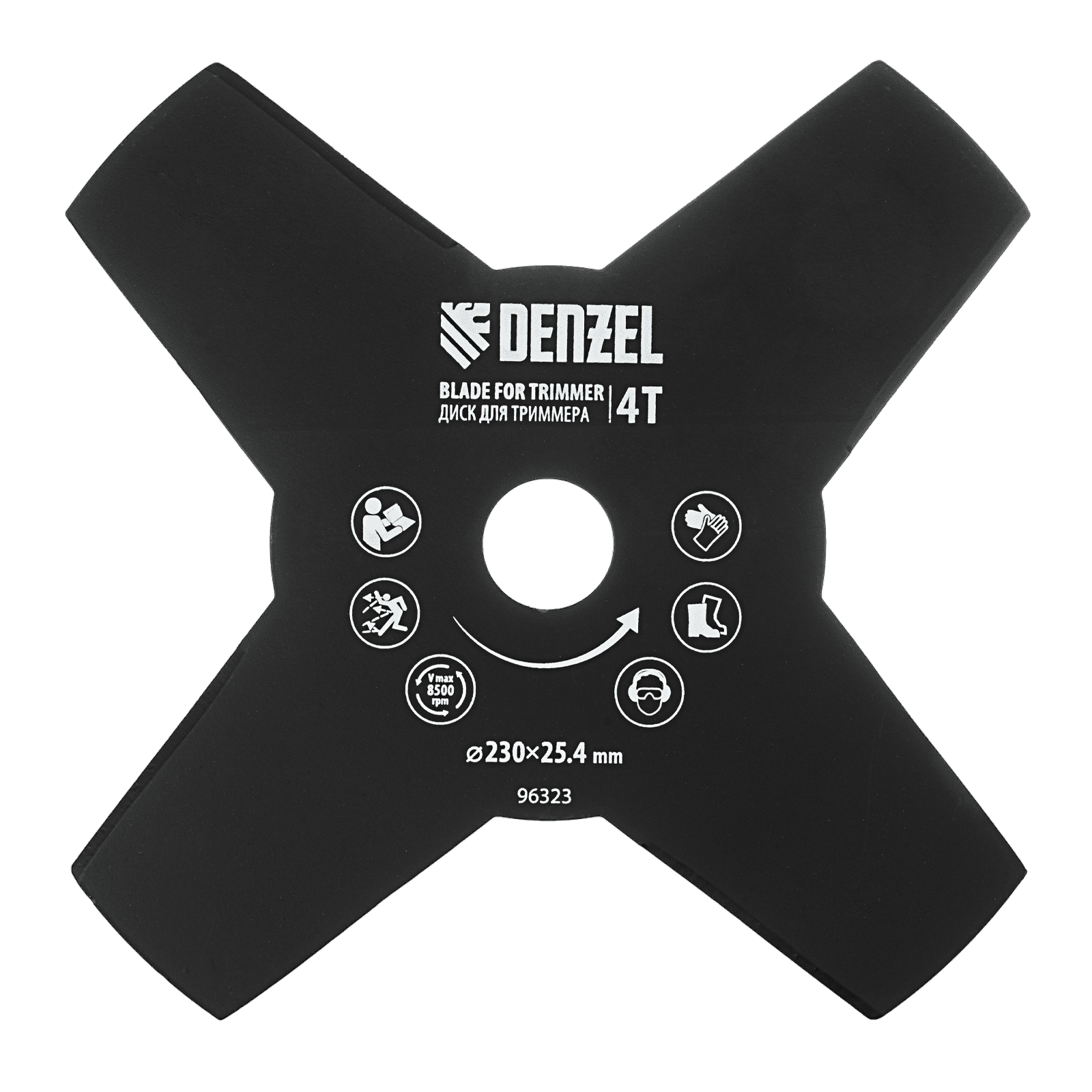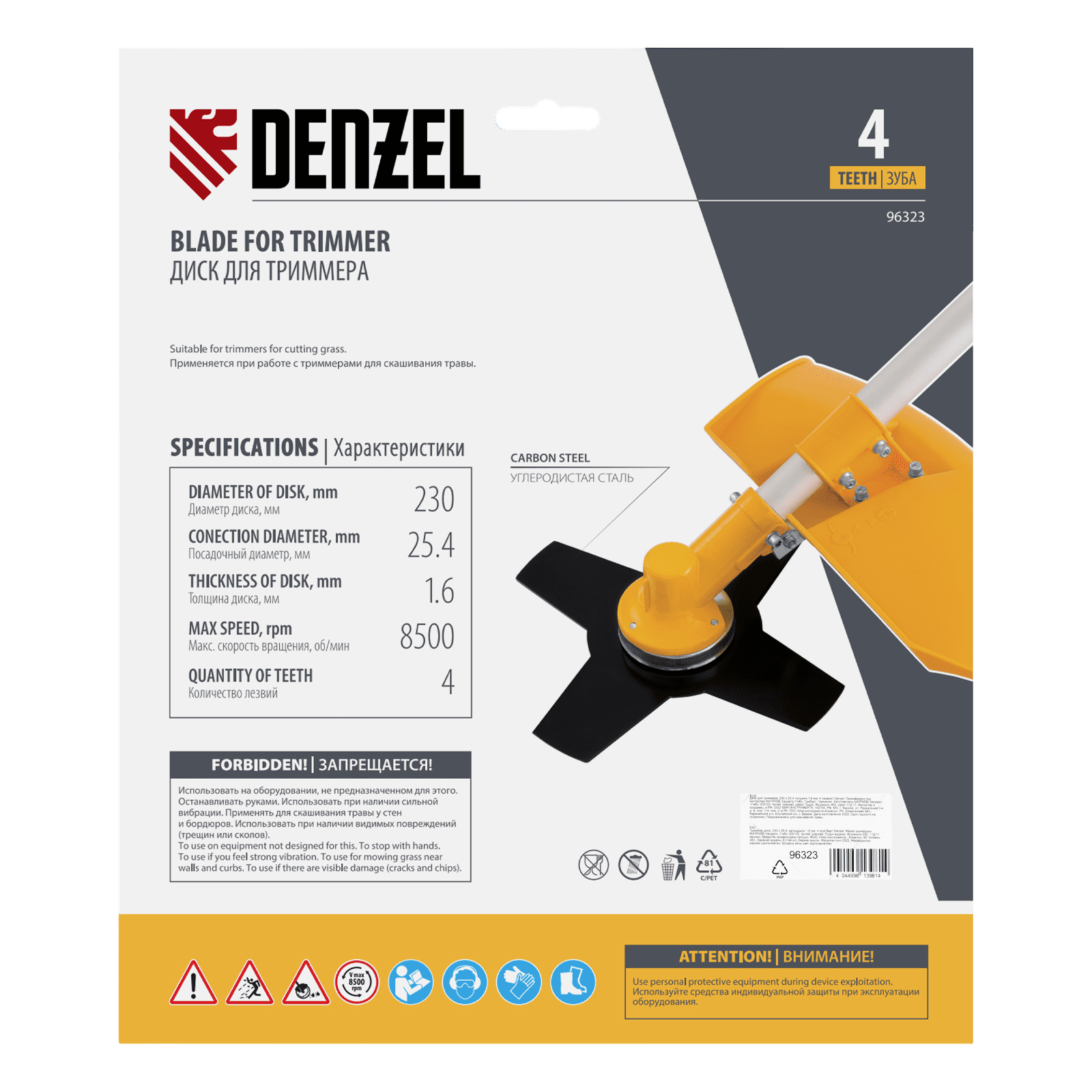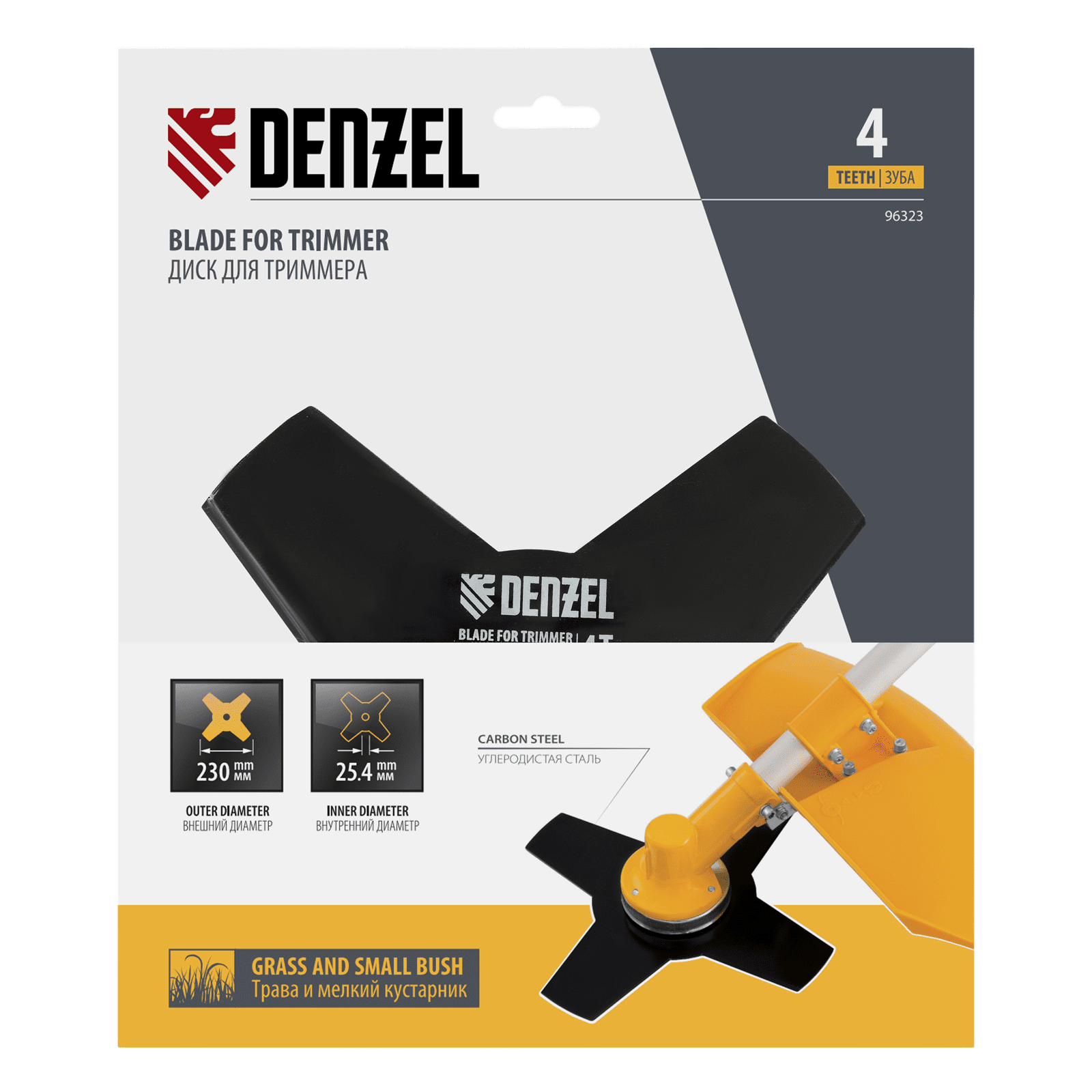 Диск для триммера Denzel 96323 размером 230 х 25,4 мм, толщиной 1,6 мм, с 4 лезвиями, предназначен для скашивания травы различных типов, в том числе с жесткими стеблями (полыни, крапивы, лебеды). Рекомендован к использованию со всеми типами бензиновых триммеров, а также с электрическими триммерами мощностью не менее 1,0 кВт, например Denzel 96611 и 96612.