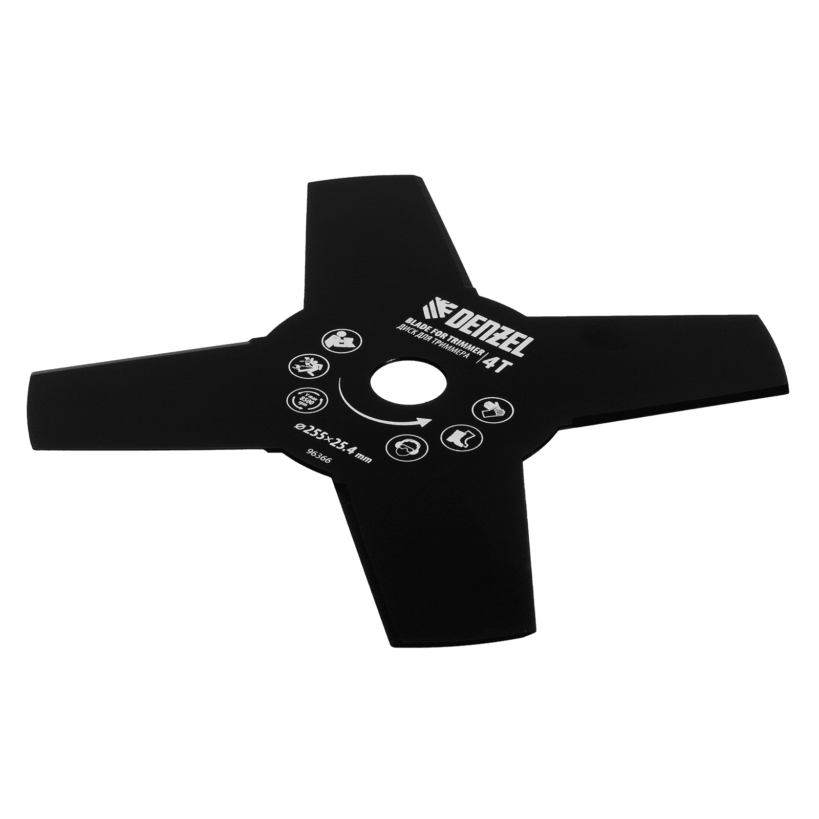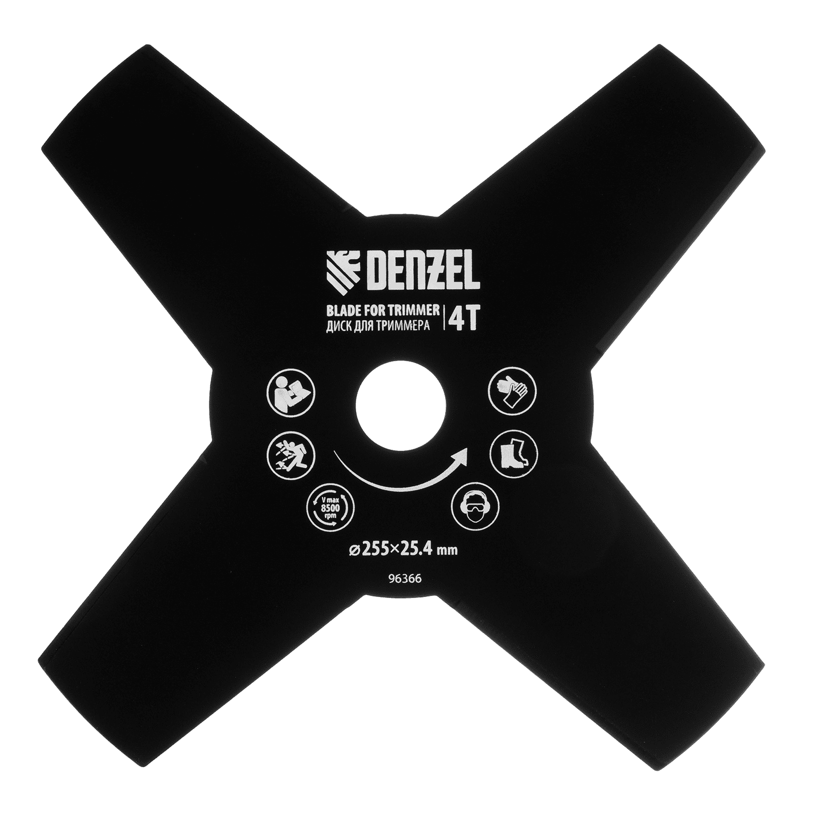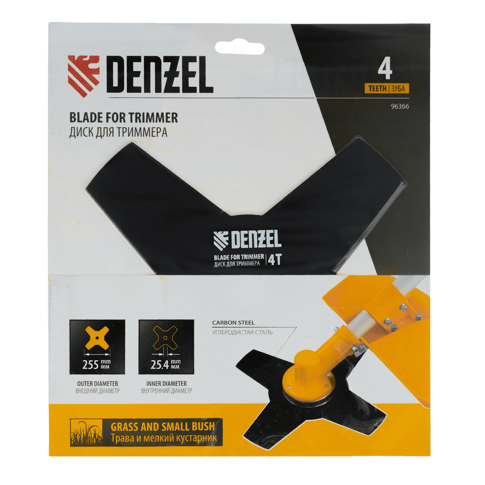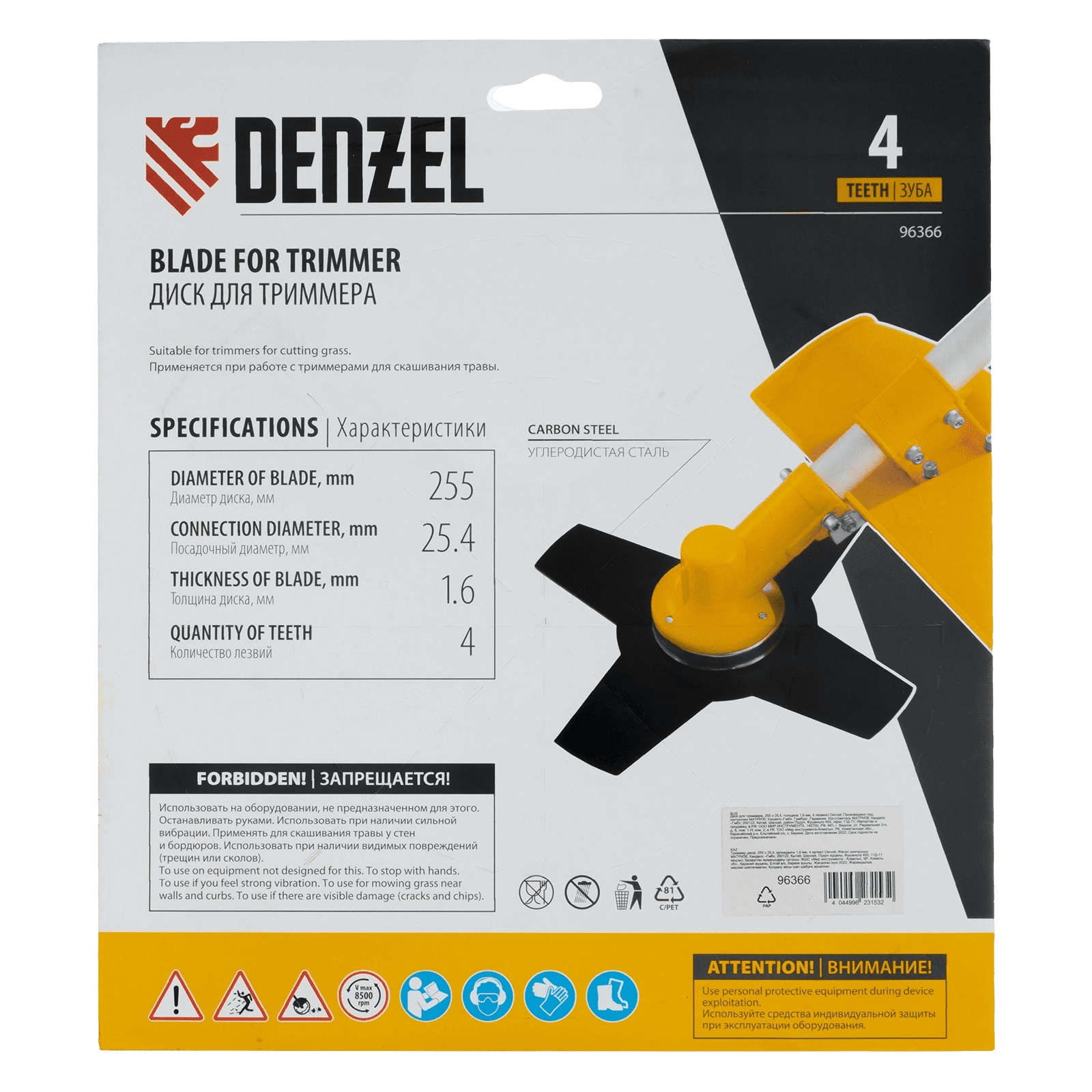 Диск для триммера Denzel 96366 диаметром 255 мм и толщиной 1,6 мм, с 4 лезвиями, имеет посадочный диаметр 25,4 мм и предназначен для удаления сорной травы на загородном участке. Устанавливается на бензиновый триммер или электротриммер с верхним расположением двигателя и прямой штангой.