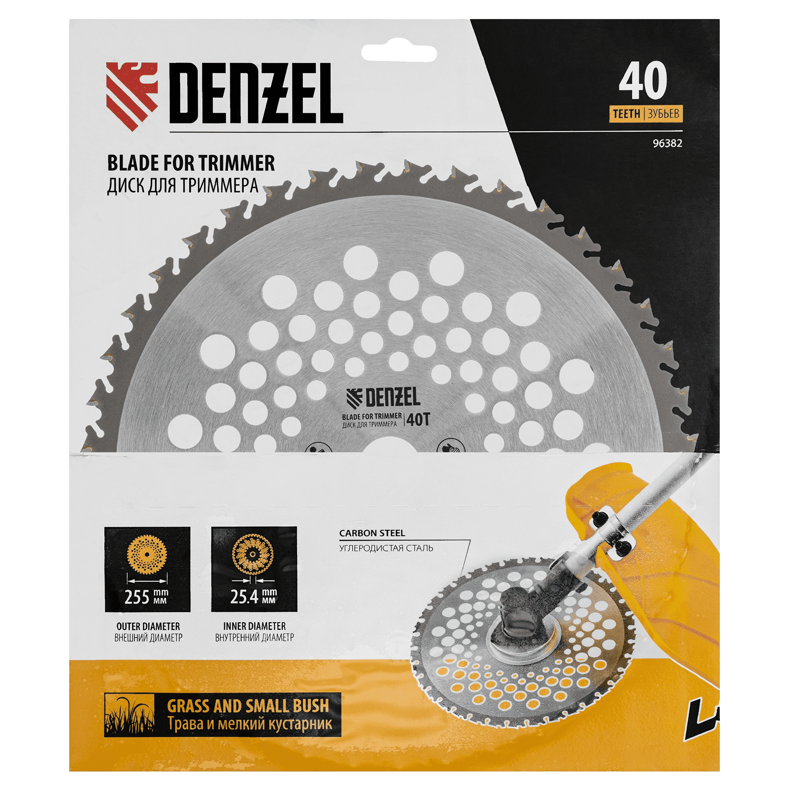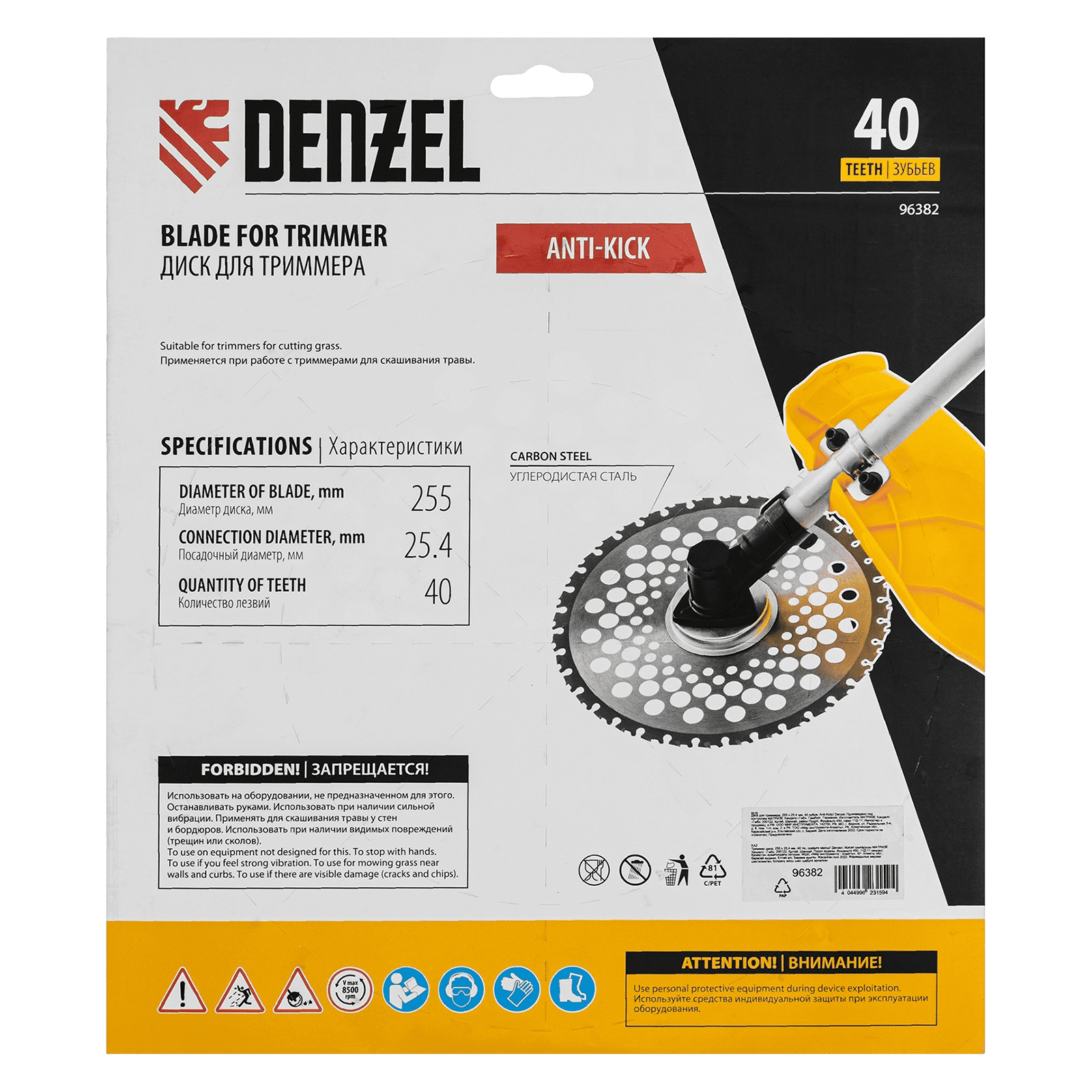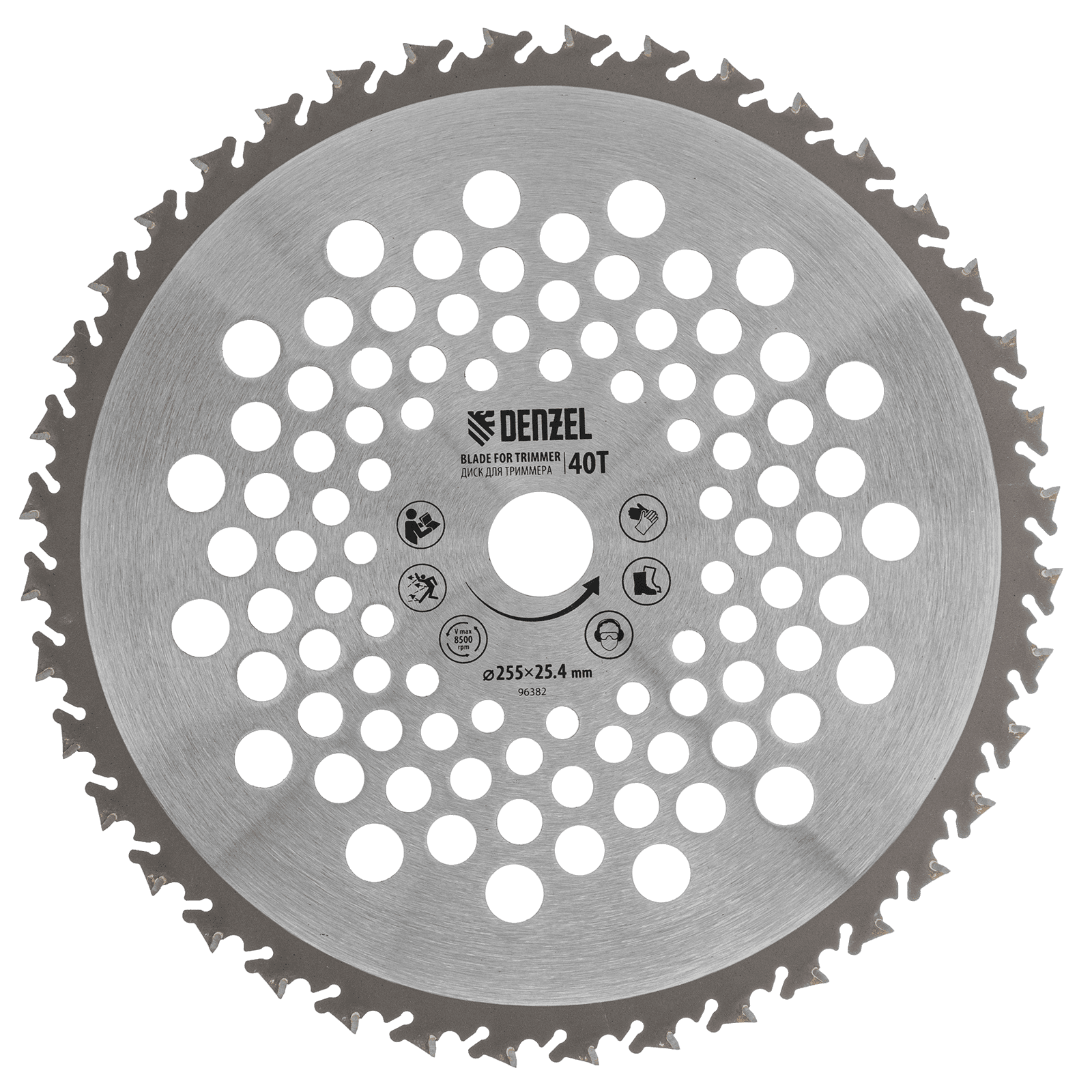 Диск для триммера Denzel 96382 с внешним диаметром 255 мм и посадочным — 25,4 мм, с 40 зубьями Anti-Kick, используется для скашивания жесткой травы, борщевика и других сорняков с толстыми стеблями, а также подпиливания кустарников и тонких деревьев. Оптимален для работы с мощными бензотриммерами. Будет полезен для расчистки территории и подготовки участка к вспашке и застройке.