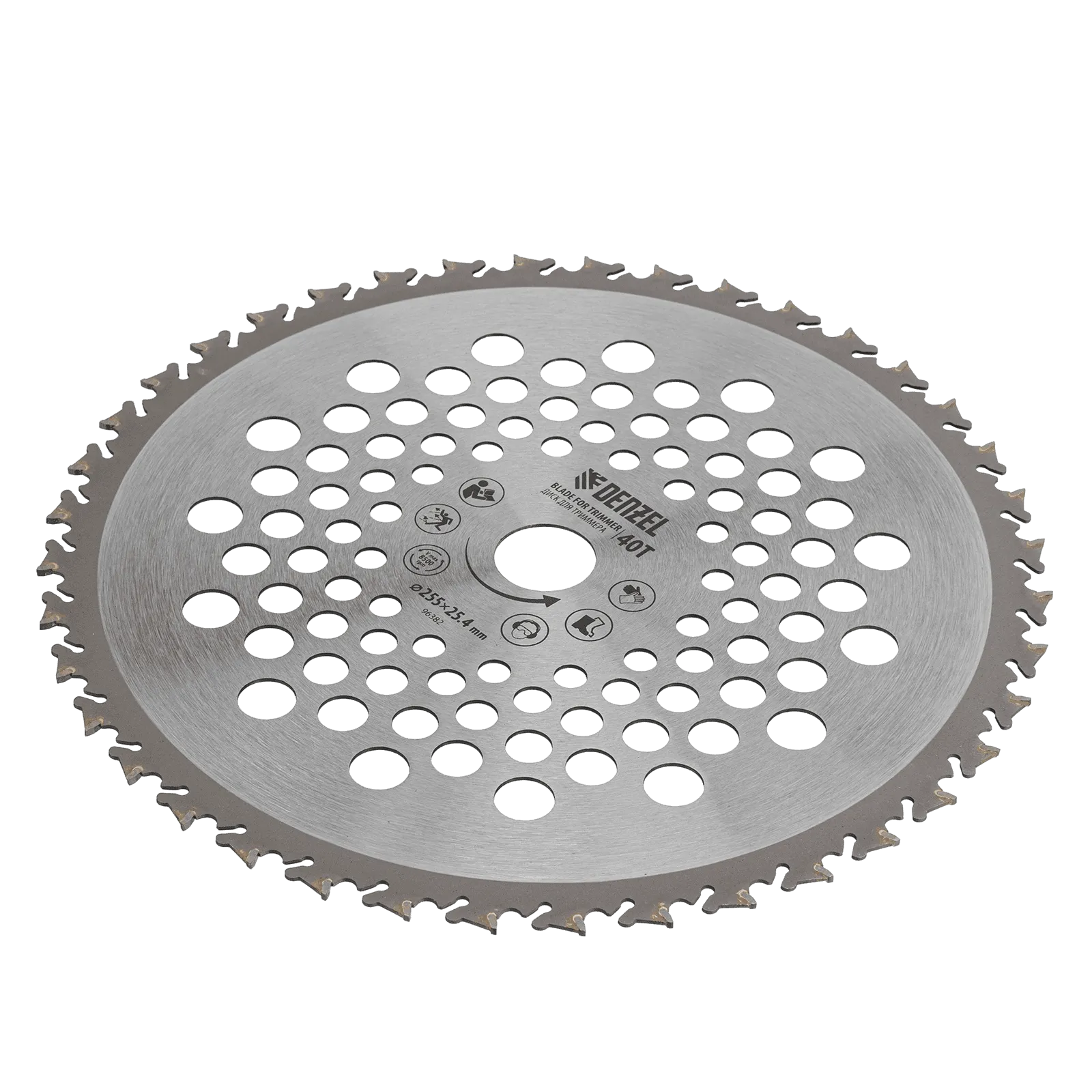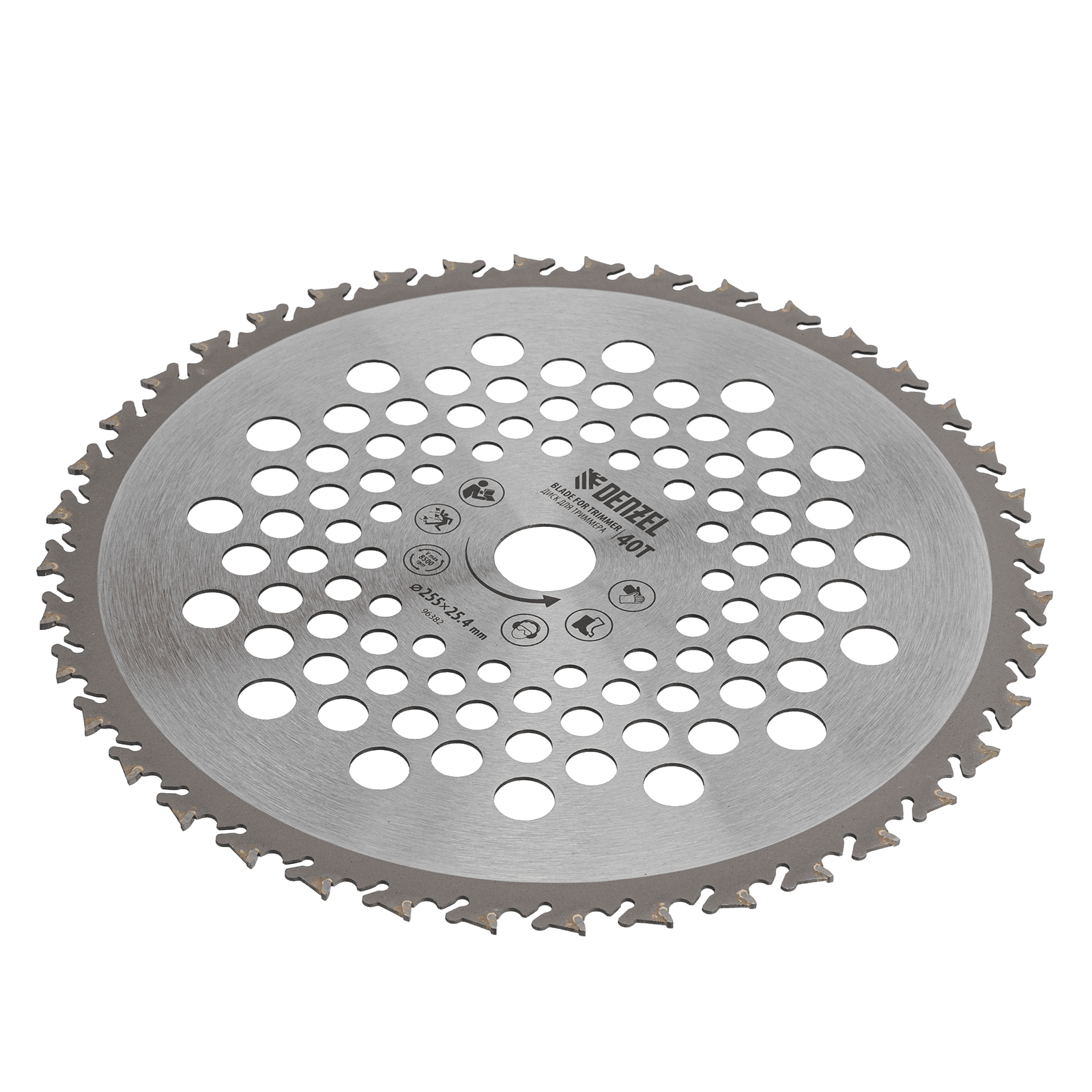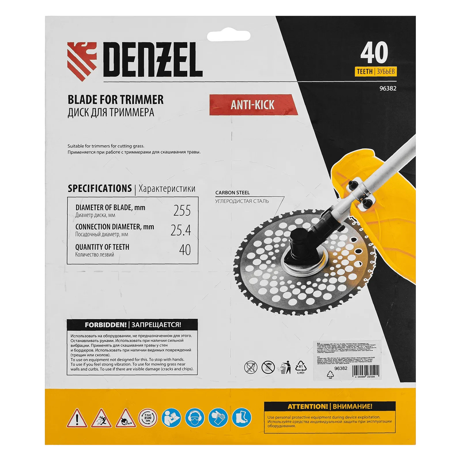 Диск для триммера Denzel 96382 с внешним диаметром 255 мм и посадочным — 25,4 мм, с 40 зубьями Anti-Kick, используется для скашивания жесткой травы, борщевика и других сорняков с толстыми стеблями, а также подпиливания кустарников и тонких деревьев. Оптимален для работы с мощными бензотриммерами. Будет полезен для расчистки территории и подготовки участка к вспашке и застройке.