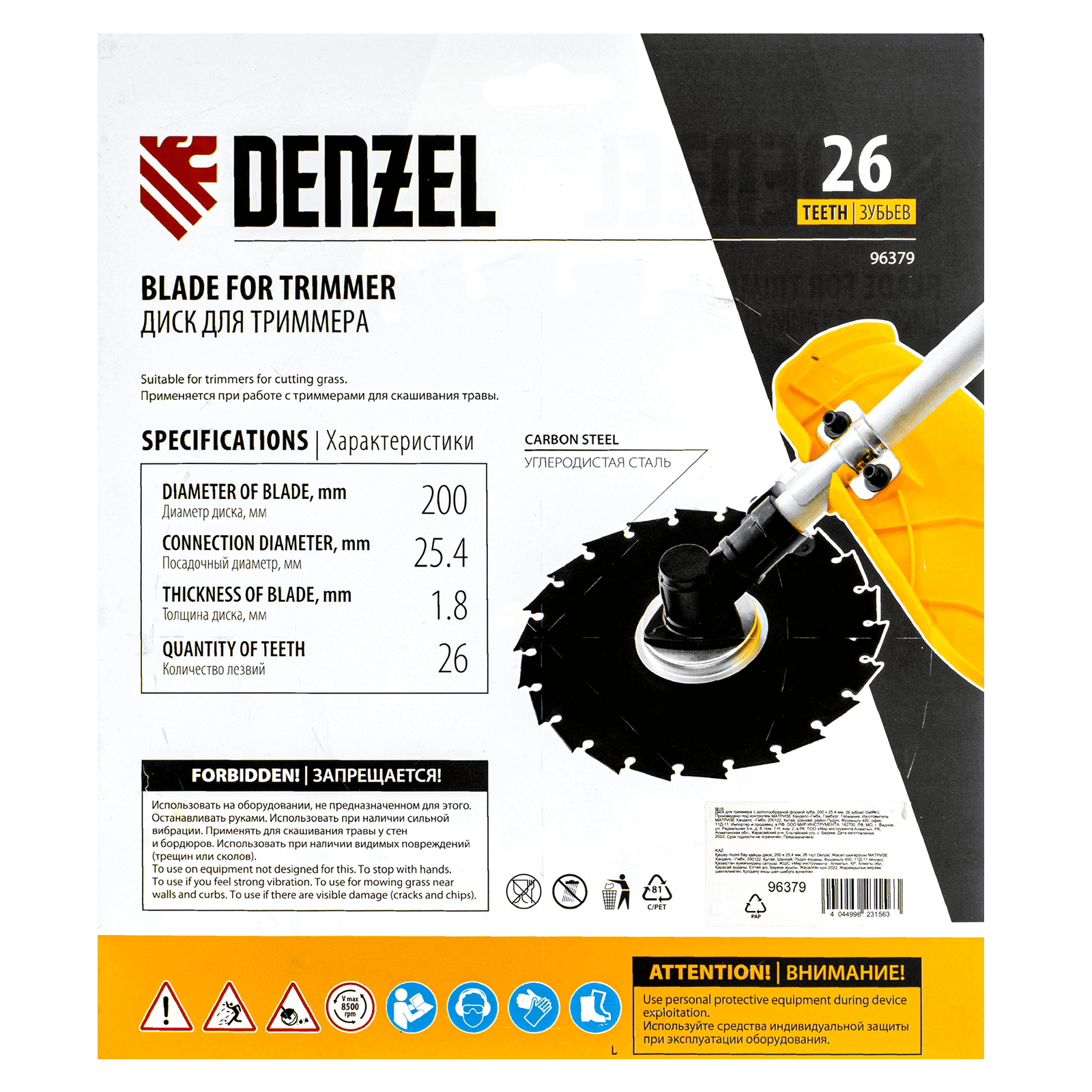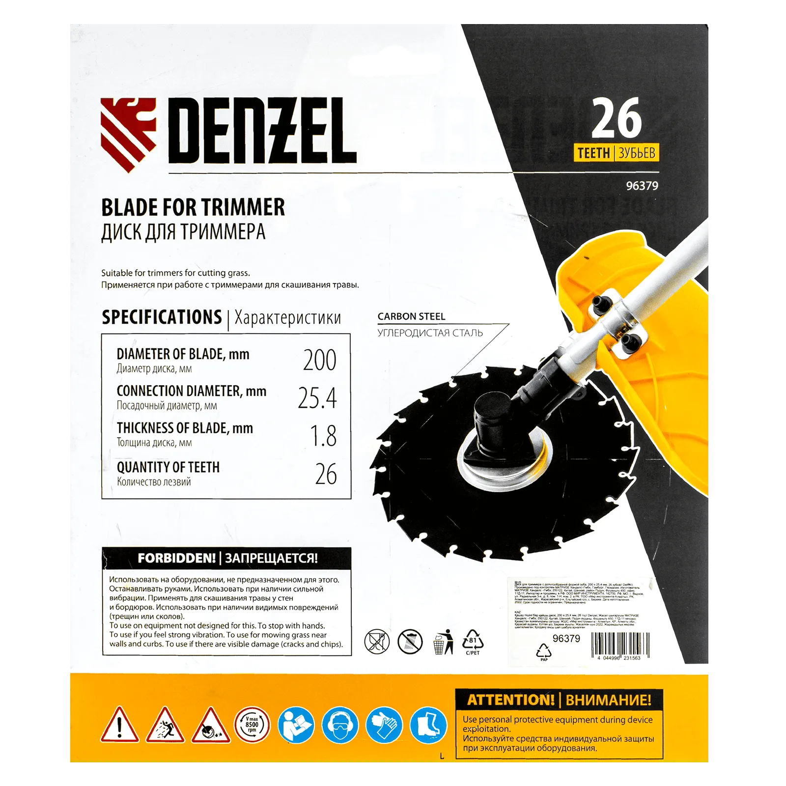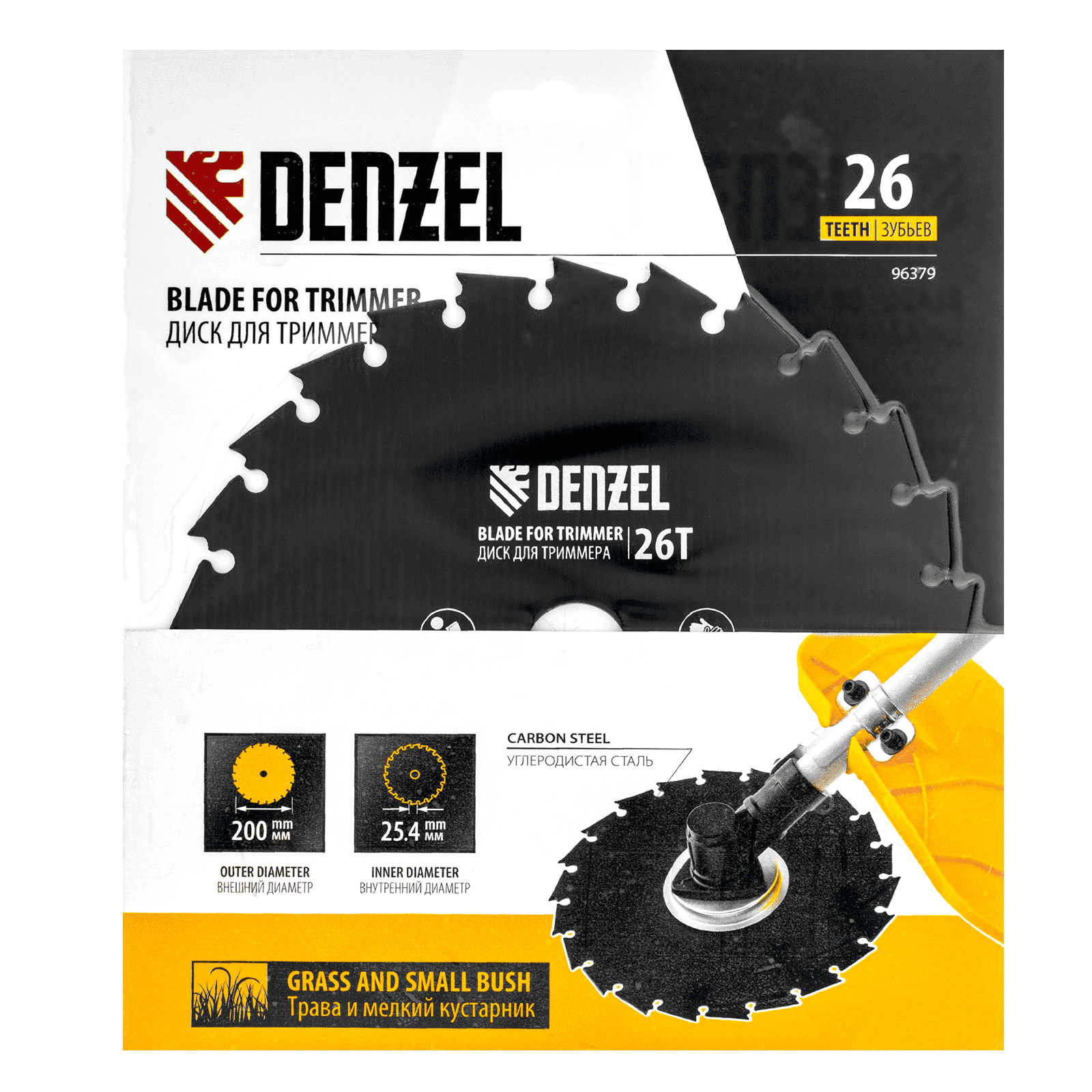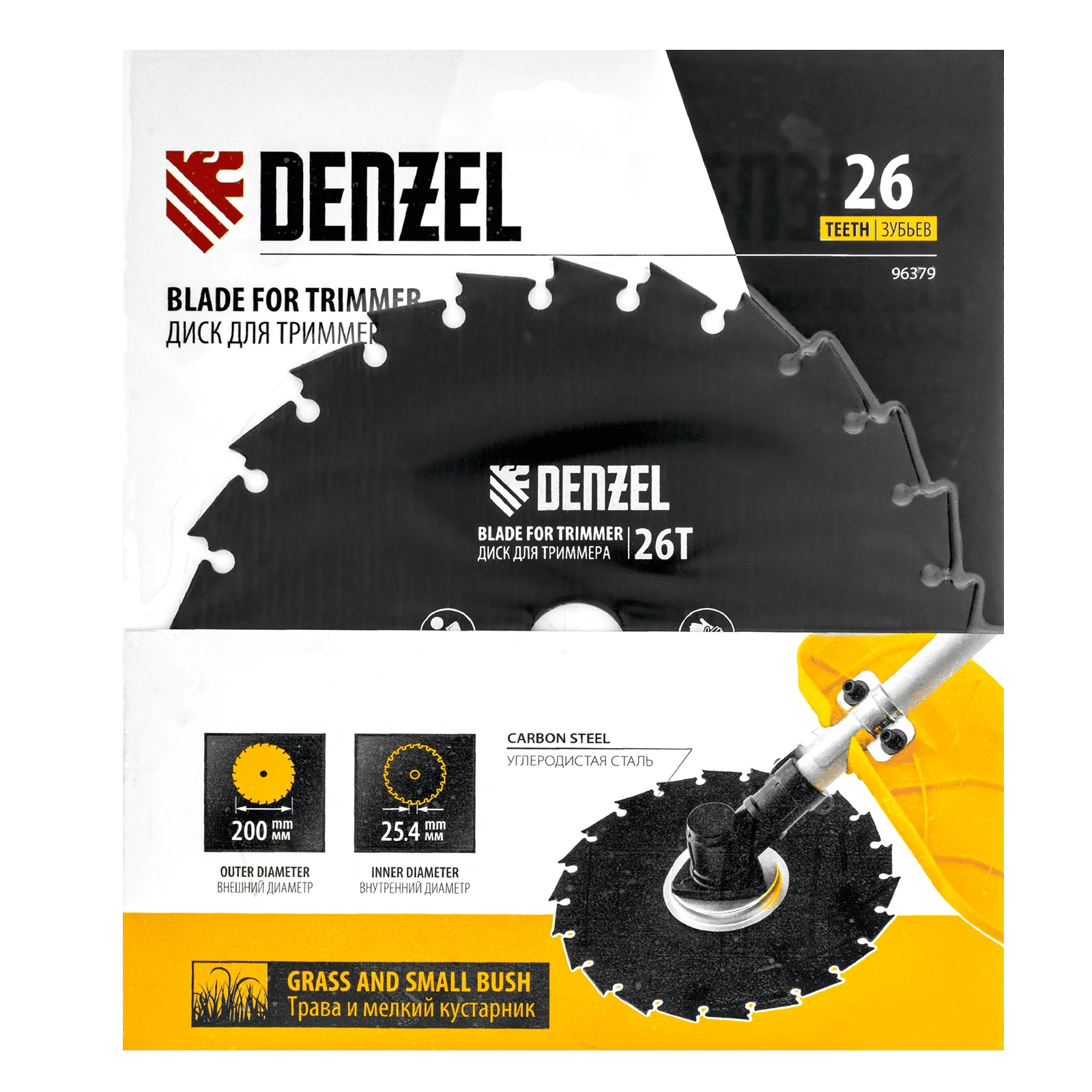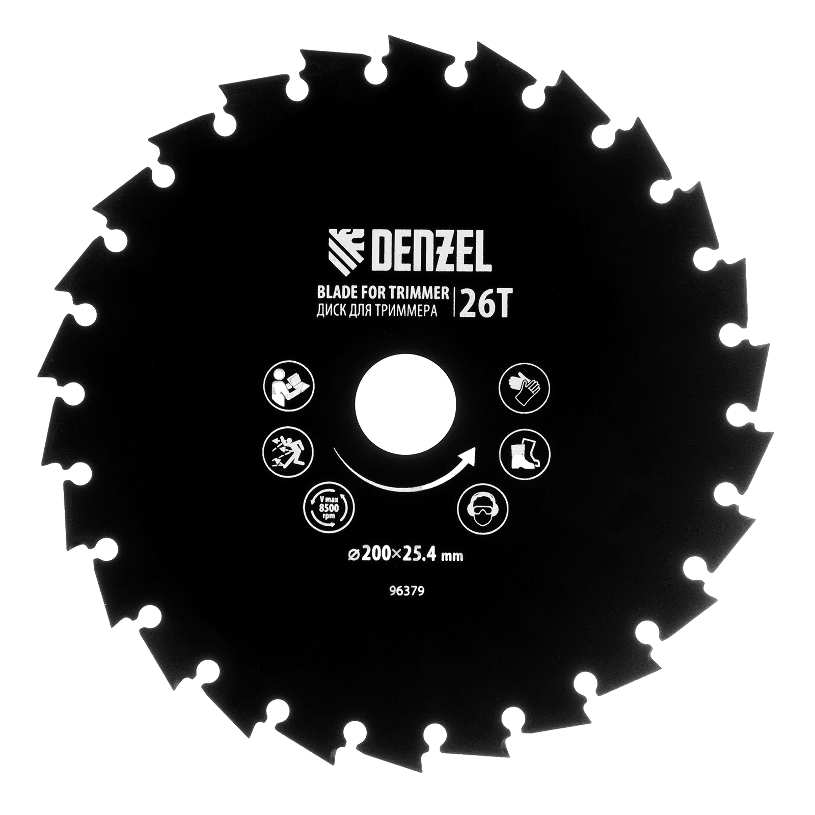 Диск для триммера Denzel 96379 с внешним диаметром 200 мм и посадочным — 25,4 мм, с 26 зубьями долотообразной формы, предназначен для скашивания травы и мелкого кустарника. Устанавливается на вал триммера с бензиновым двигателем. Диск пригодится для ухода за дачным участком.