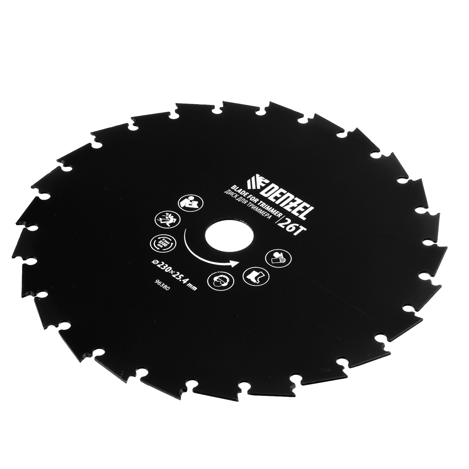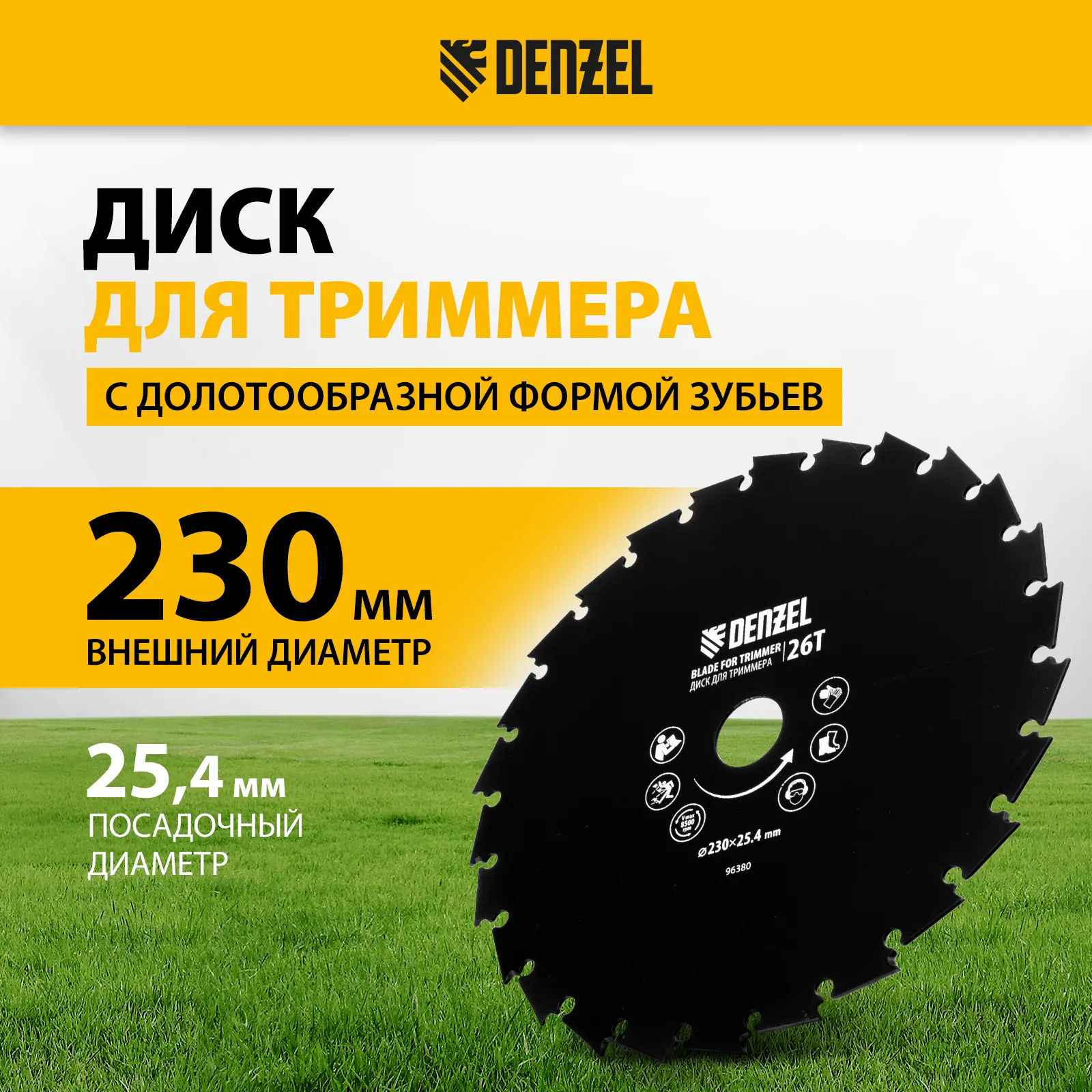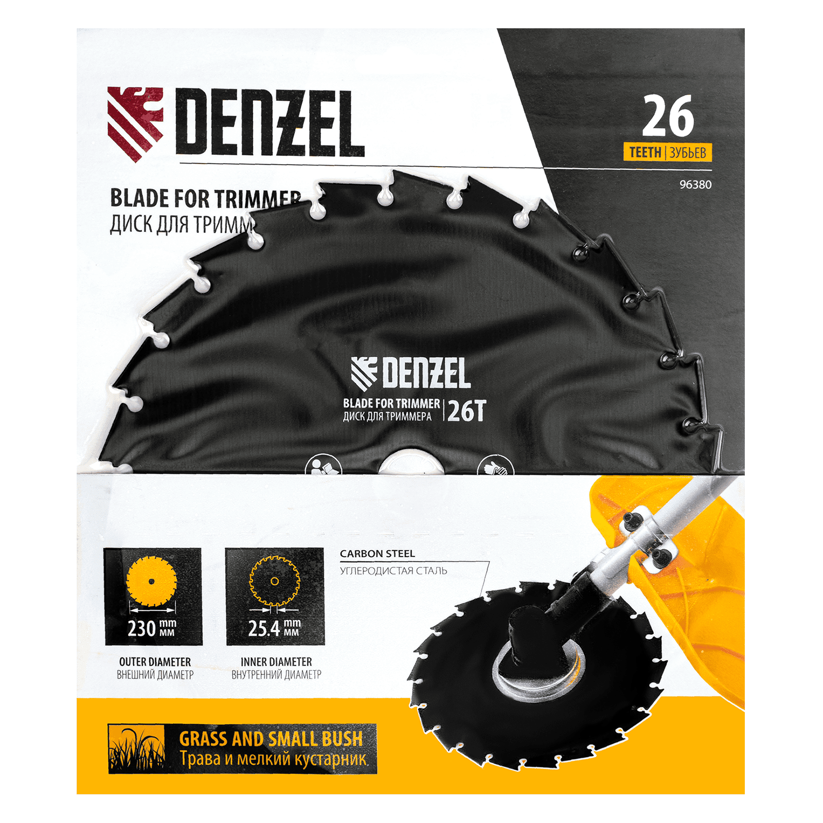 Диск для триммера Denzel 96380 с внешним диаметром 230 мм и посадочным — 25,4 мм, с 26 зубьями долотообразной формы, предназначен для скашивания травы и мелкого кустарника. Устанавливается на вал триммера с бензиновым двигателем. Диск пригодится для ухода за дачным участком.