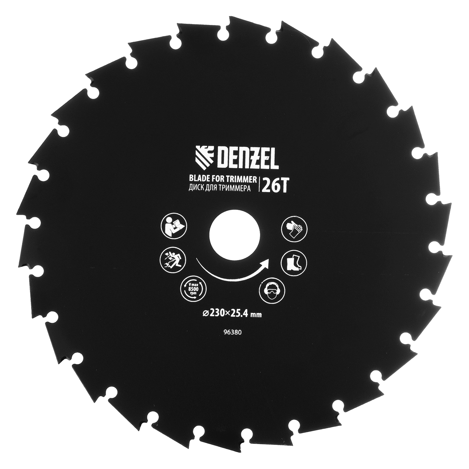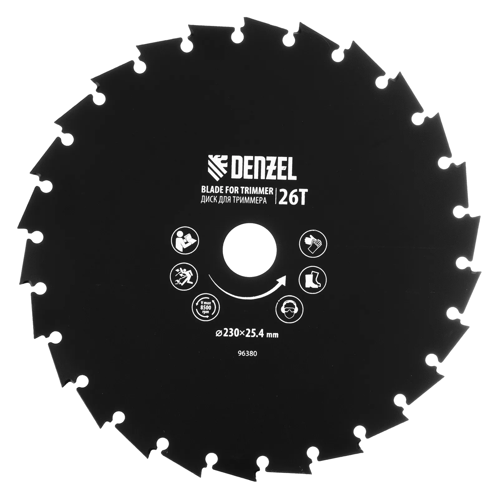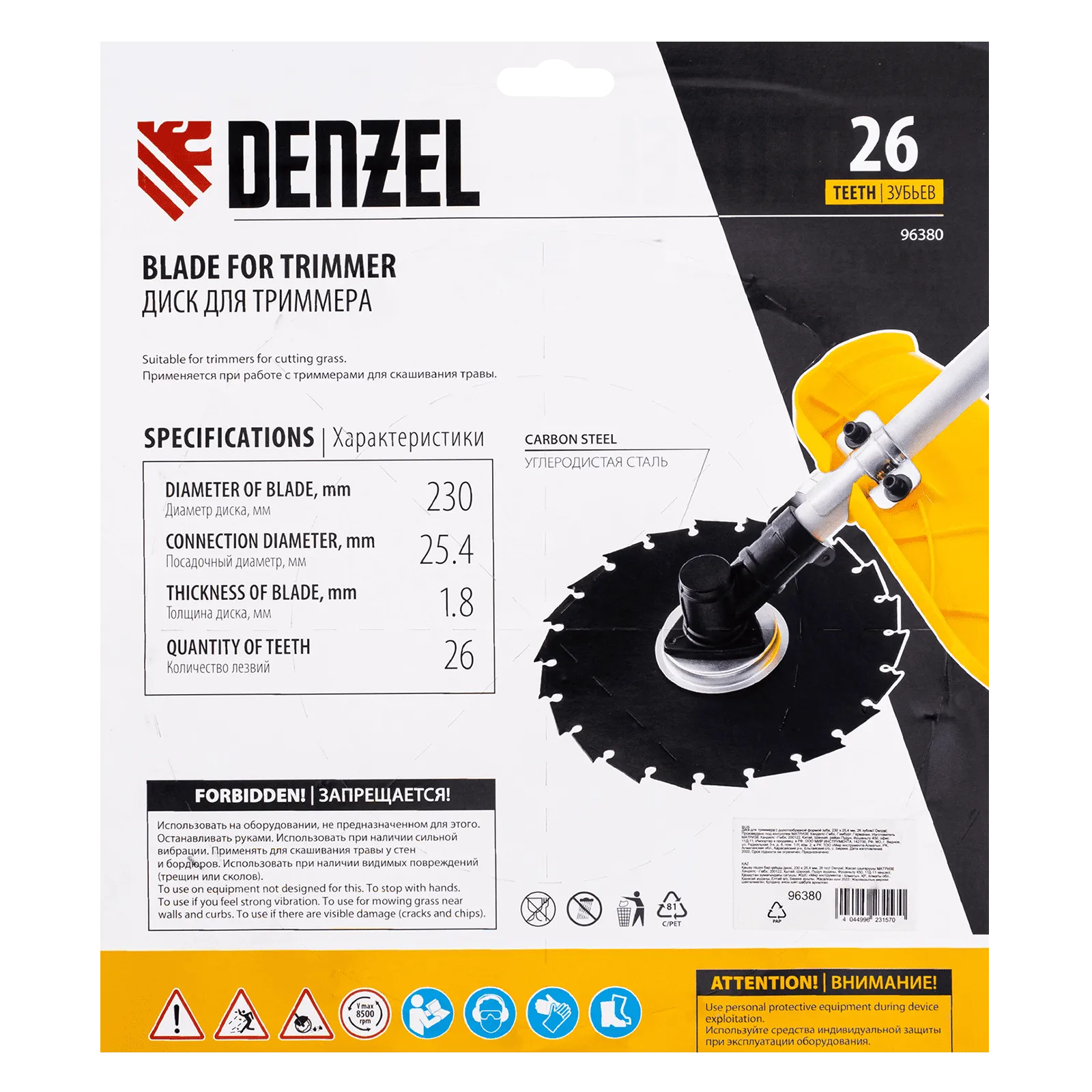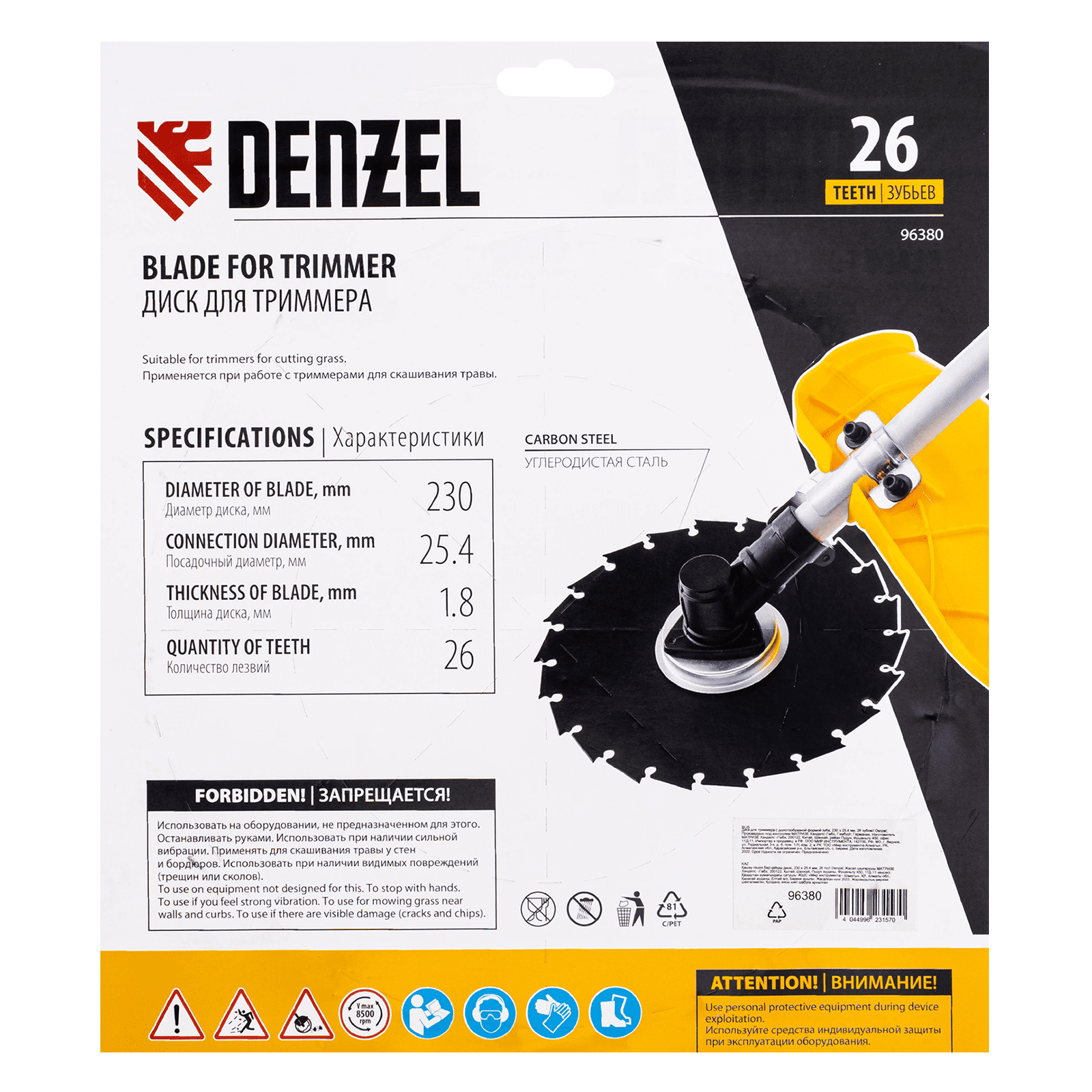 Диск для триммера Denzel 96380 с внешним диаметром 230 мм и посадочным — 25,4 мм, с 26 зубьями долотообразной формы, предназначен для скашивания травы и мелкого кустарника. Устанавливается на вал триммера с бензиновым двигателем. Диск пригодится для ухода за дачным участком.