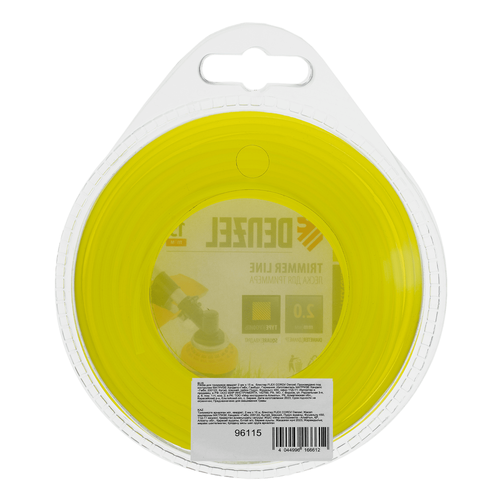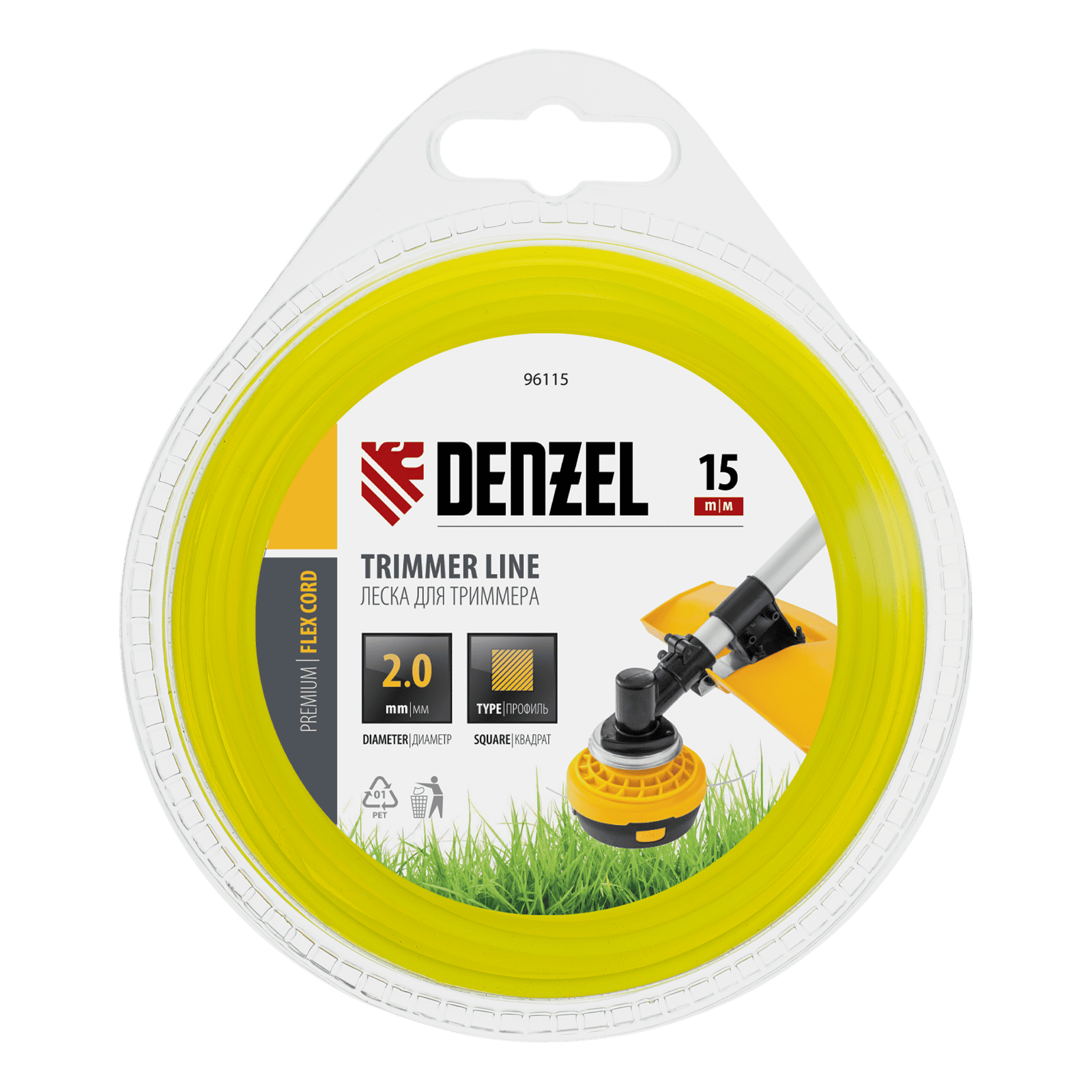 Леска для триммера Denzel FLEX CORD 96115 с квадратным сечением, диаметром 2 мм и длиной 15 м, поставляется в блистере и рассчитана на скашивание сорняков и густых зарослей травы. Используется с бензо- и электротриммерами мощностью от 1000 Вт.