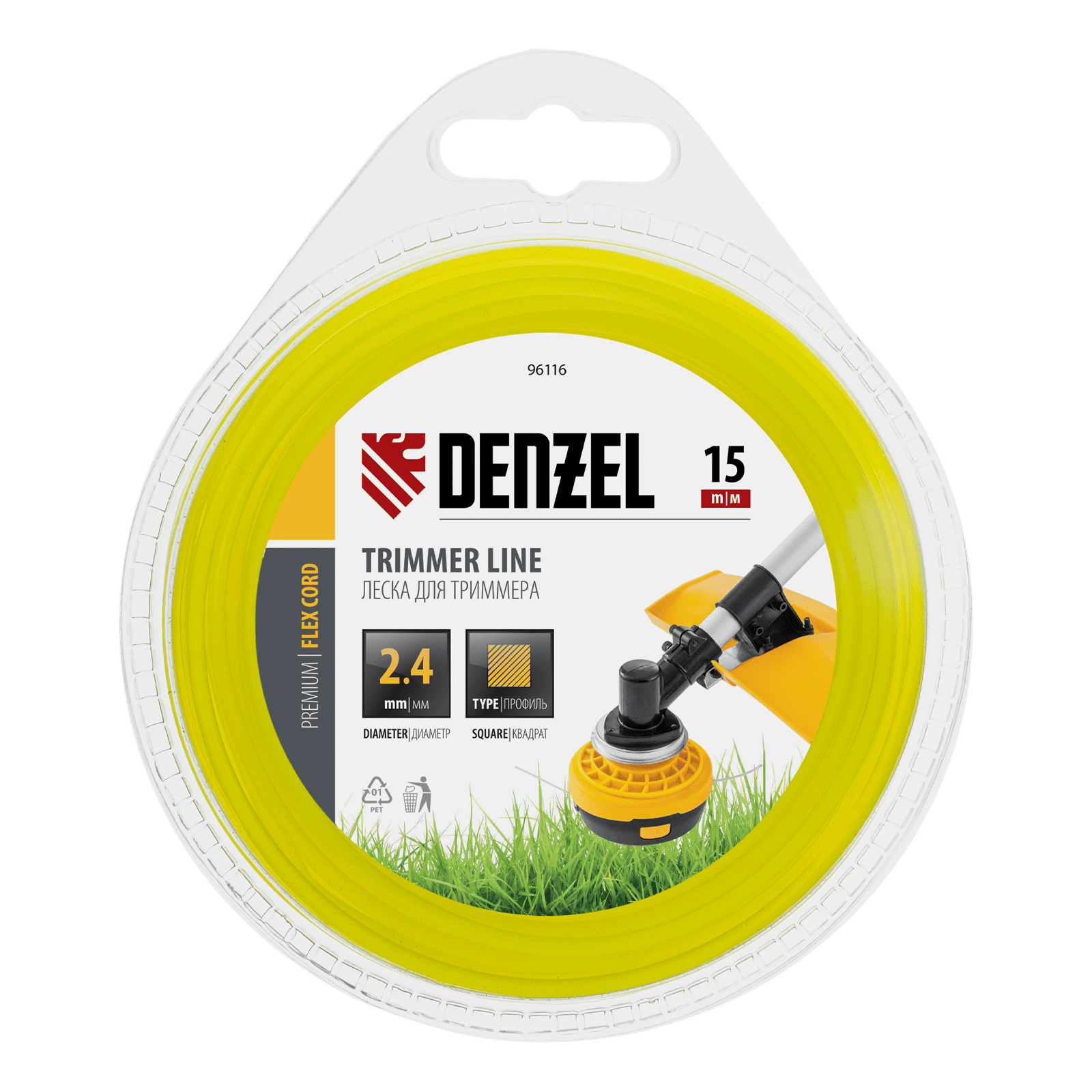 Леска для триммера Denzel FLEX CORD 96116 с квадратным сечением, диаметром 2,4 мм и длиной 15 м, поставляется в блистере и рассчитана на скашивание газонной, жесткой и сухой травы, сорняков с толстыми стеблями, бурьяна и лопухов. Используется с электротриммерами мощностью 1-1,4 кВт, а также совместима с бензиновыми триммерами.