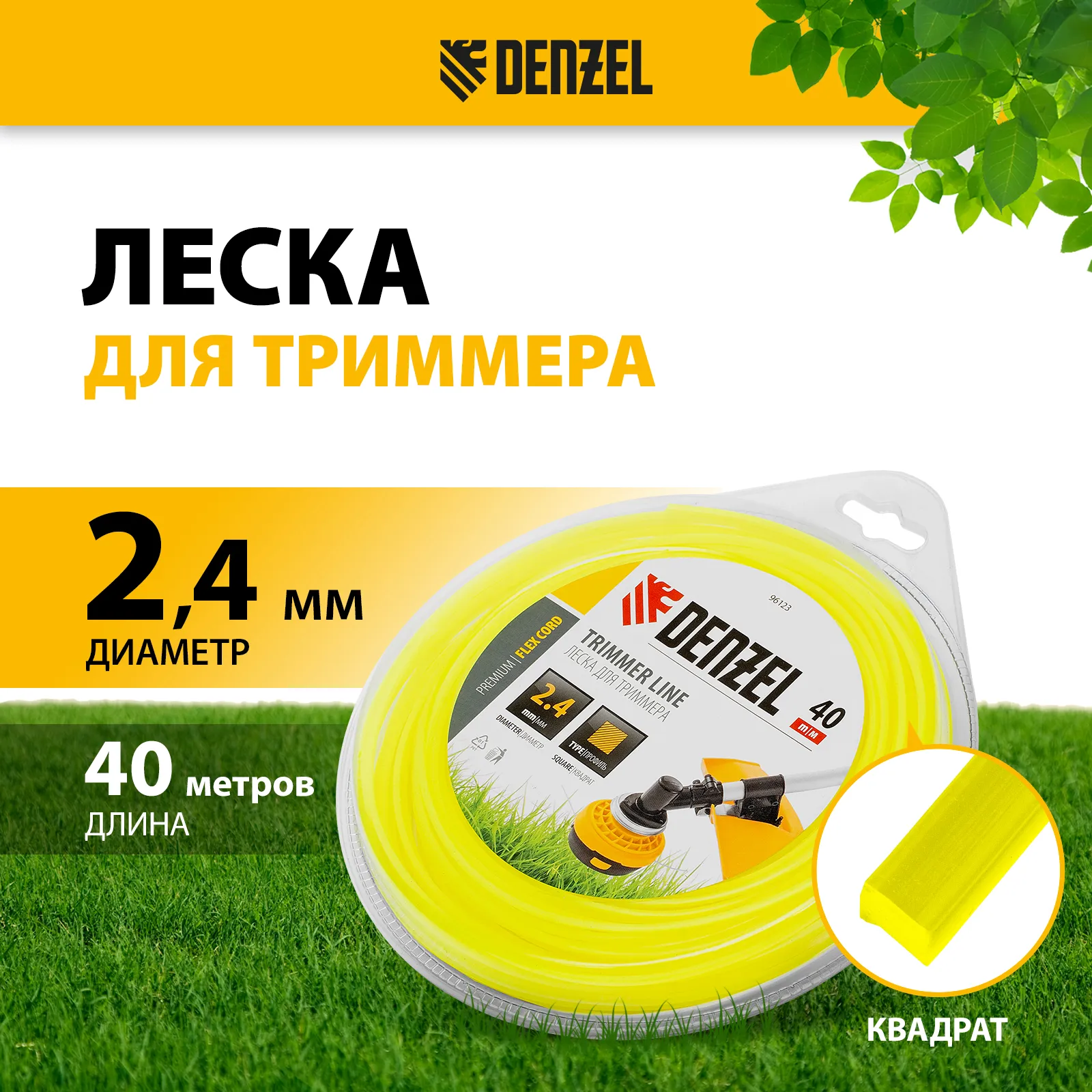 Леска Denzel FLEX CORD 96123 размером 2,4 х 40 м, с сечением «квадрат», заправляется в электро- и бензотриммеры средней или высокой мощности. Оптимальна для срезания не только зеленой травы, но и высокой, сухой растительности, сорняков, репейника, бурьяна и лопухов. Триммеры с такой леской могут использоваться на загородном участке, в городских скверах, на улицах и т.д.