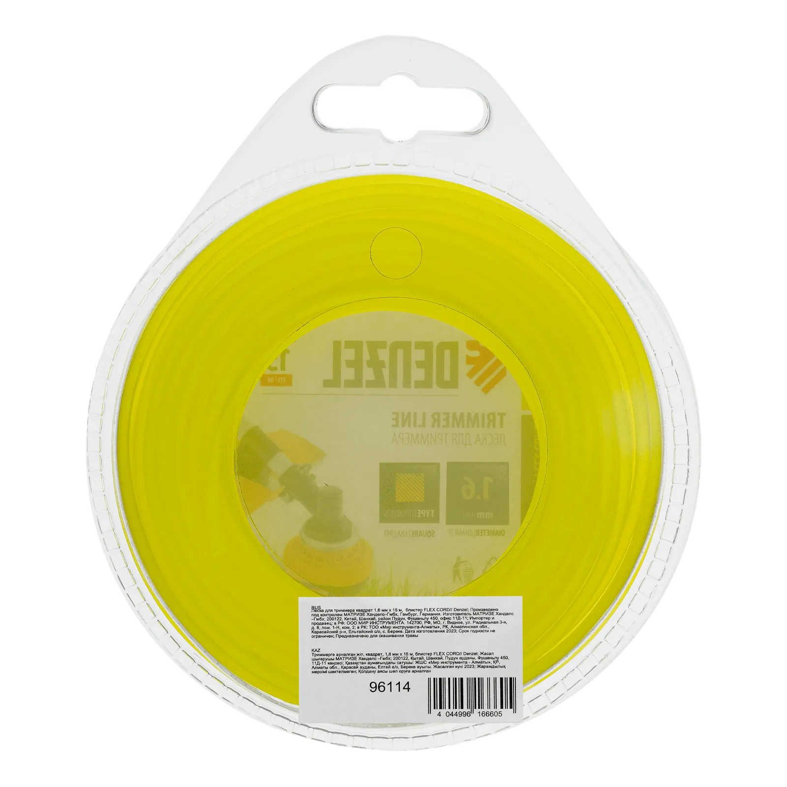 Леска для триммера Denzel FLEX CORD 96114 с квадратным сечением, диаметром 1,6 мм и длиной 15 м, поставляется в блистере и рассчитана на скашивание газонной, высокой или сухой травы. Используется с электротриммерами малой мощности (300-600 Вт) с нижним расположением двигателя.