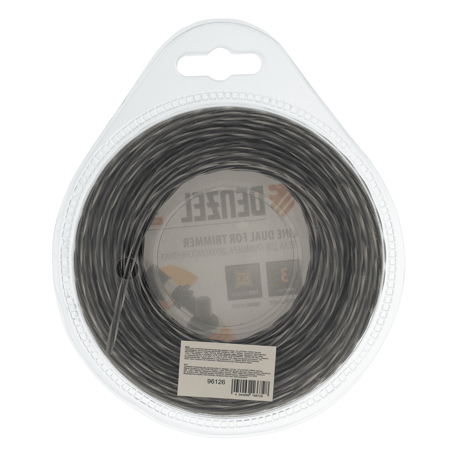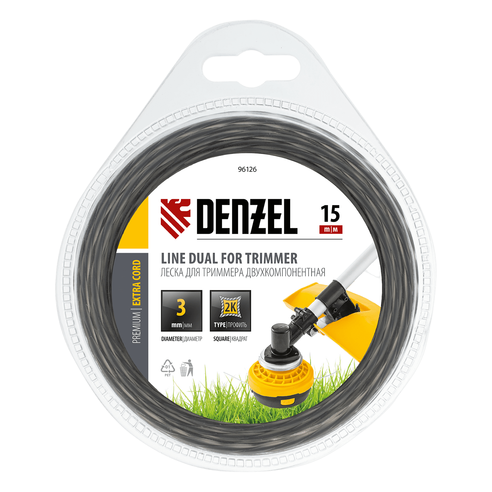 Двухкомпонентная леска Denzel Extra cord 96126 размером 3 мм х 15 м, с квадратным сечением, предназначена для использования с высокопроизводительными бензотриммерами мощностью не менее 1500 Вт. Благодаря наличию высокопрочного сердечника рабочий ресурс корда увеличен на 40% по сравнению с однокомпонентными лесками. Леска идеально подходит для срезания сухостоя, травы любой жесткости, небольших кустарников и бурьяна на участках любой сложности.
