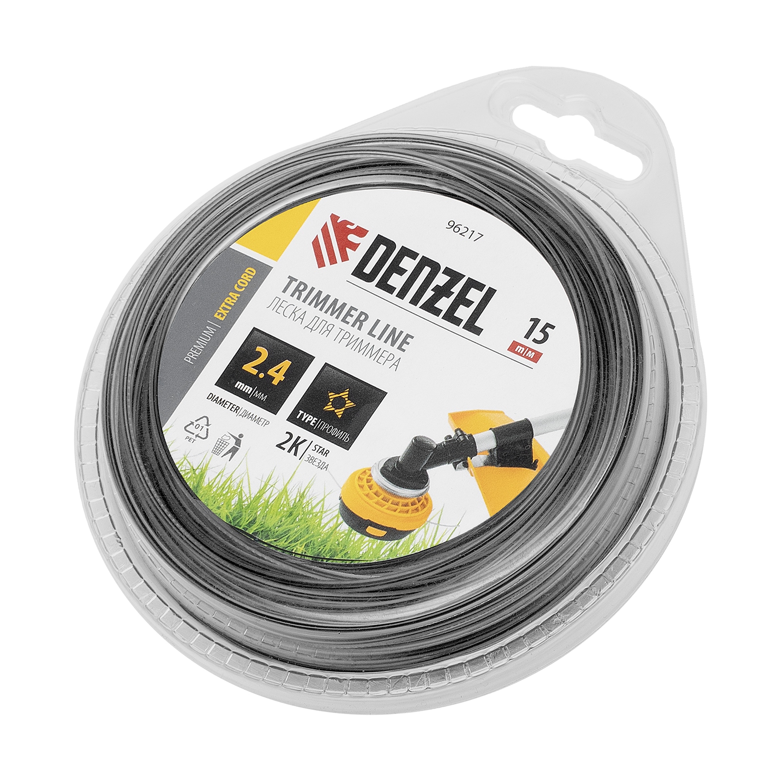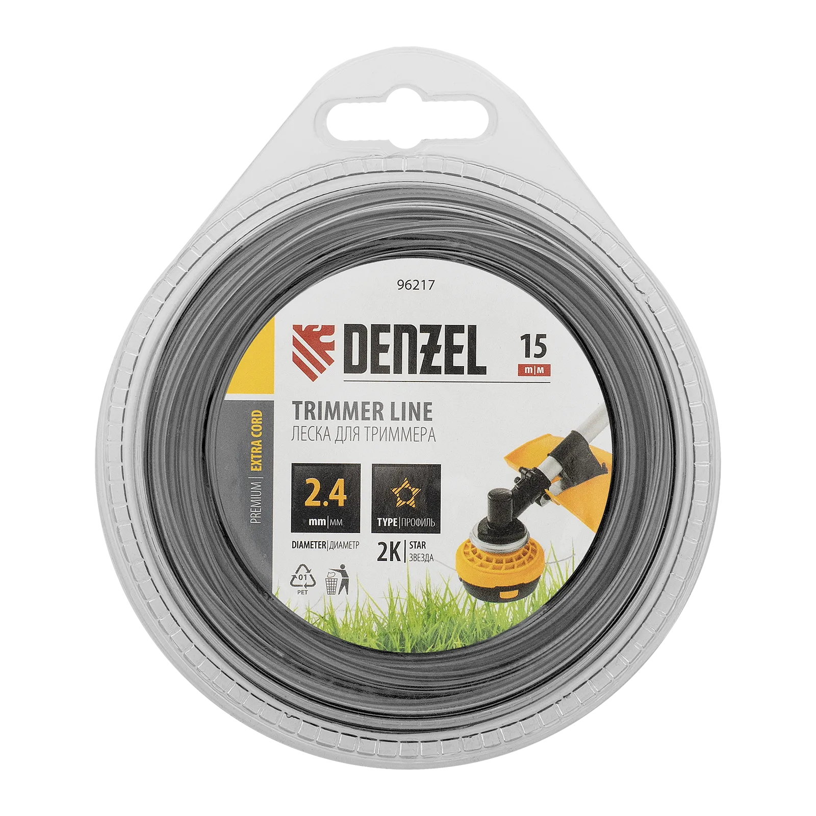 Двухкомпонентная леска для триммера Denzel EXTRA CORD 96217 с сечением «звезда», диаметром 2,4 мм и длиной 15 м, в блистере, предназначена для скашивания крупностеблевой растительности. Позволяет эффективно справляться с работой даже на замусоренной территории. Используется на бензиновых триммерах с объемом двигателя 25-52 см3 и электрических триммерах мощностью от 1 до 1,5 кВт.