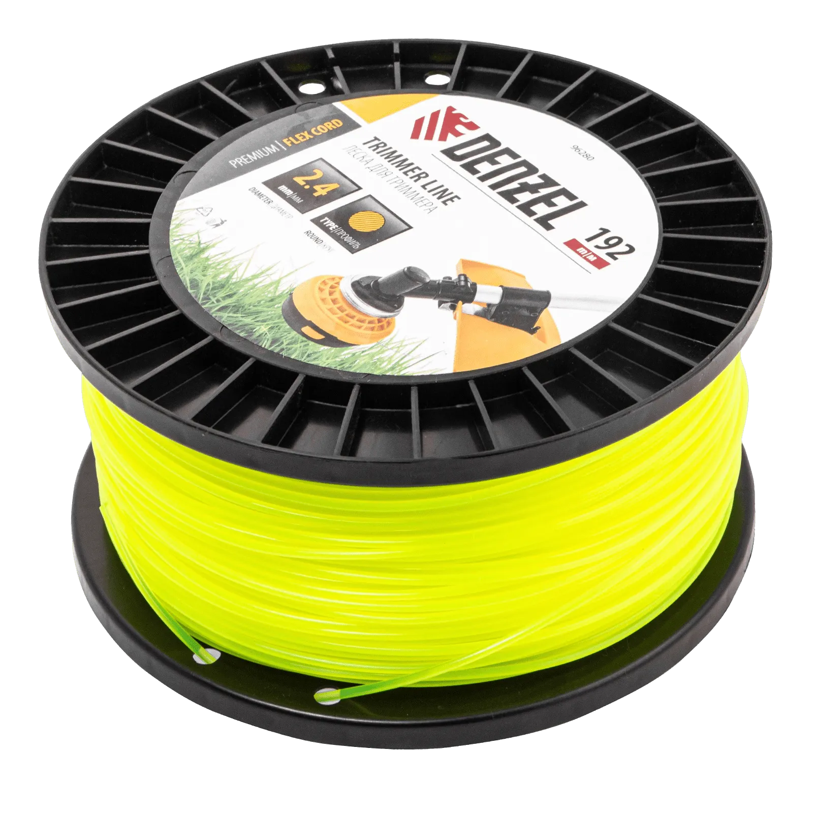 Леска для триммера Denzel FLEX CORD 96280 круглого сечения, диаметром 2,4 мм и длиной 192 м, на DIN-катушке, предназначена для скашивания как мягкой, молодой травы, так и более густой растительности. Подходит для бензиновых триммеров с объемом двигателя 25-52 см3 и электрических триммеров мощностью от 1 до 1,5 кВт.