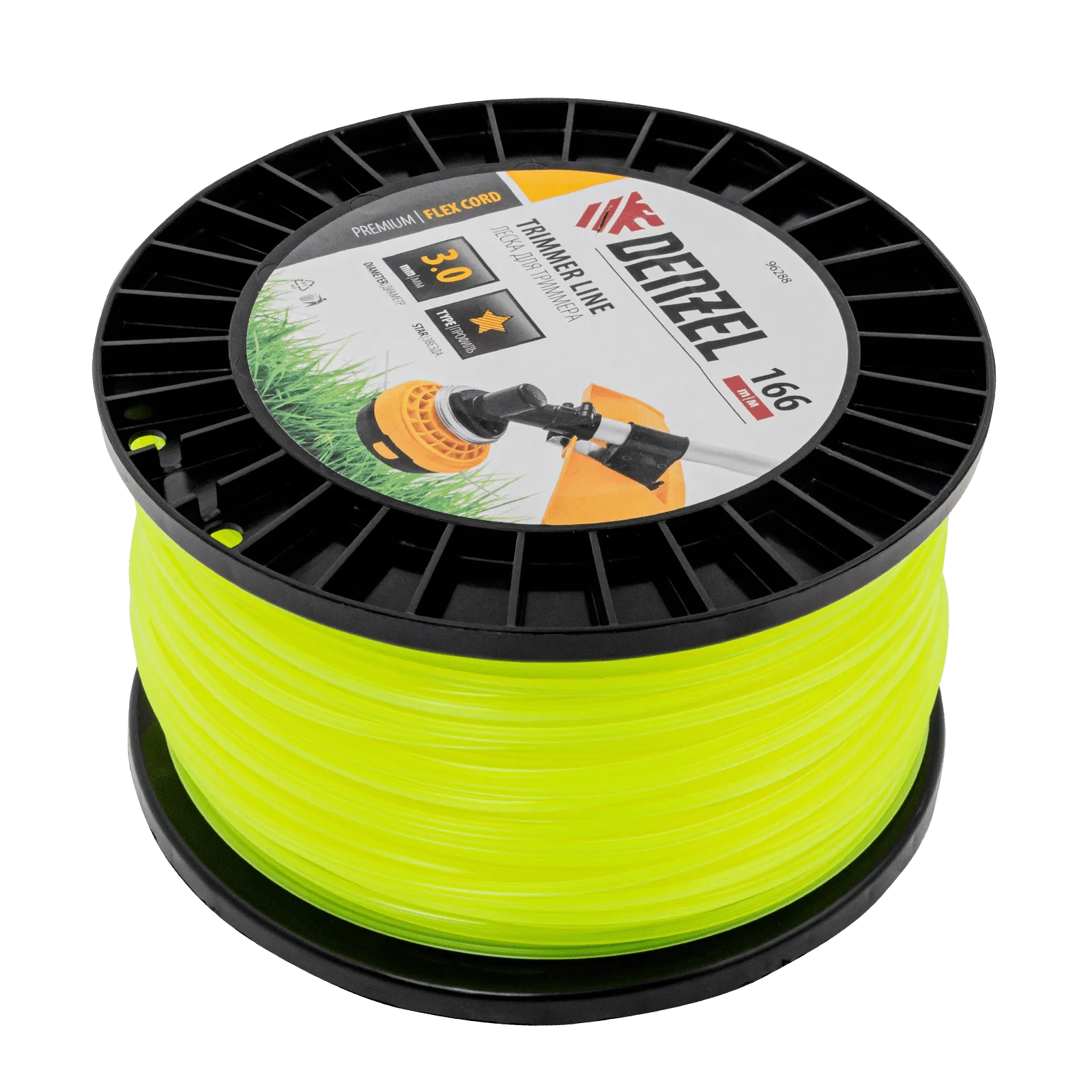 Леска Denzel FLEX CORD 96288 с сечением «звезда», диаметром 3,0 мм и длиной 166 м, на DIN-катушке, предназначена к использованию в бензиновых триммерах с объемом двигателя 25-52 см3. Применяется для ухода за газоном, скашивает даже растительность с жесткими и толстыми стеблями. Пригодится владельцам дачных участков, а также работникам коммунальных служб.