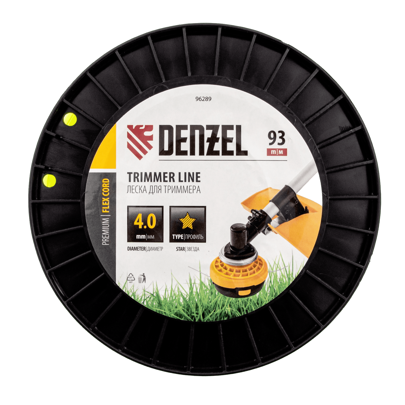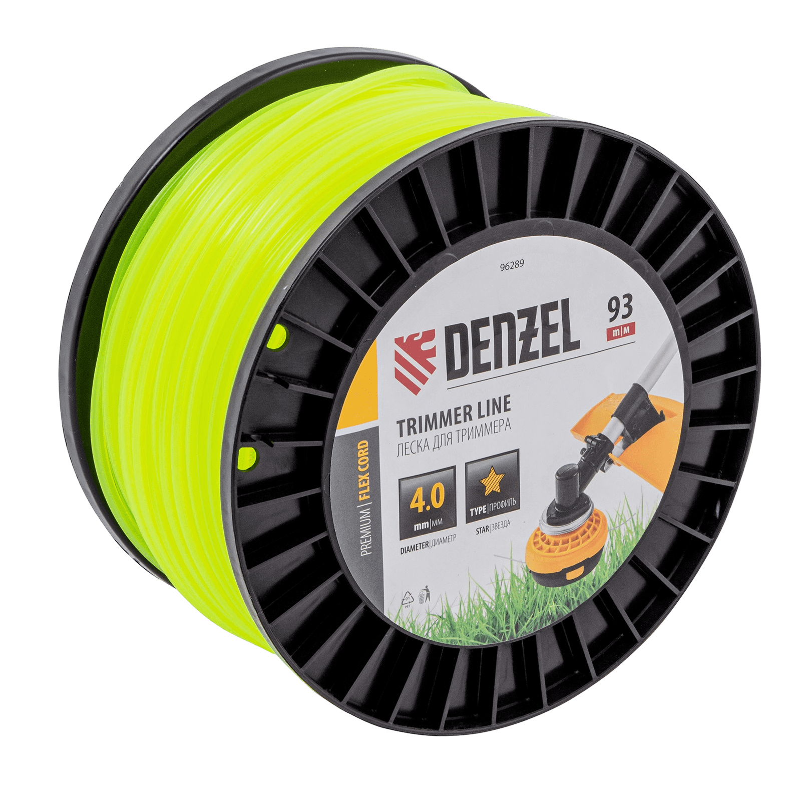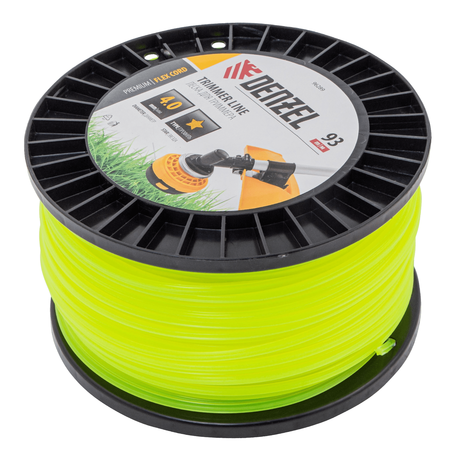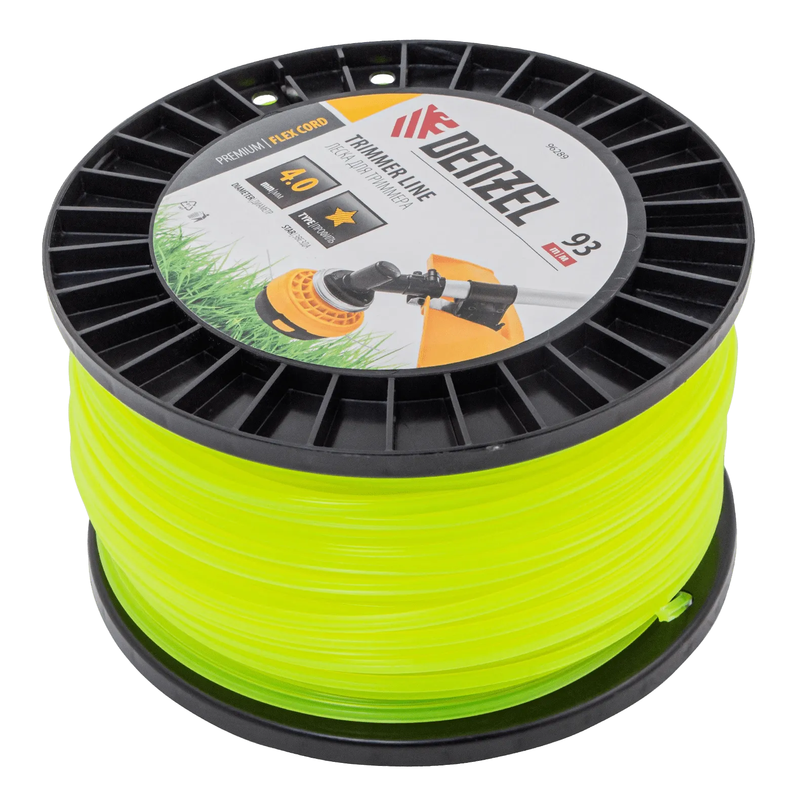 Леска Denzel FLEX CORD 96289 с сечением «звезда», диаметром 4,0 мм и длиной 93 м, на DIN-катушке, устанавливается на мощные бензиновые триммеры. Используется для ухода за газоном, скашивает даже растительность с жесткими и толстыми стеблями. Пригодится владельцам дачных участков, а также работникам коммунальных служб.