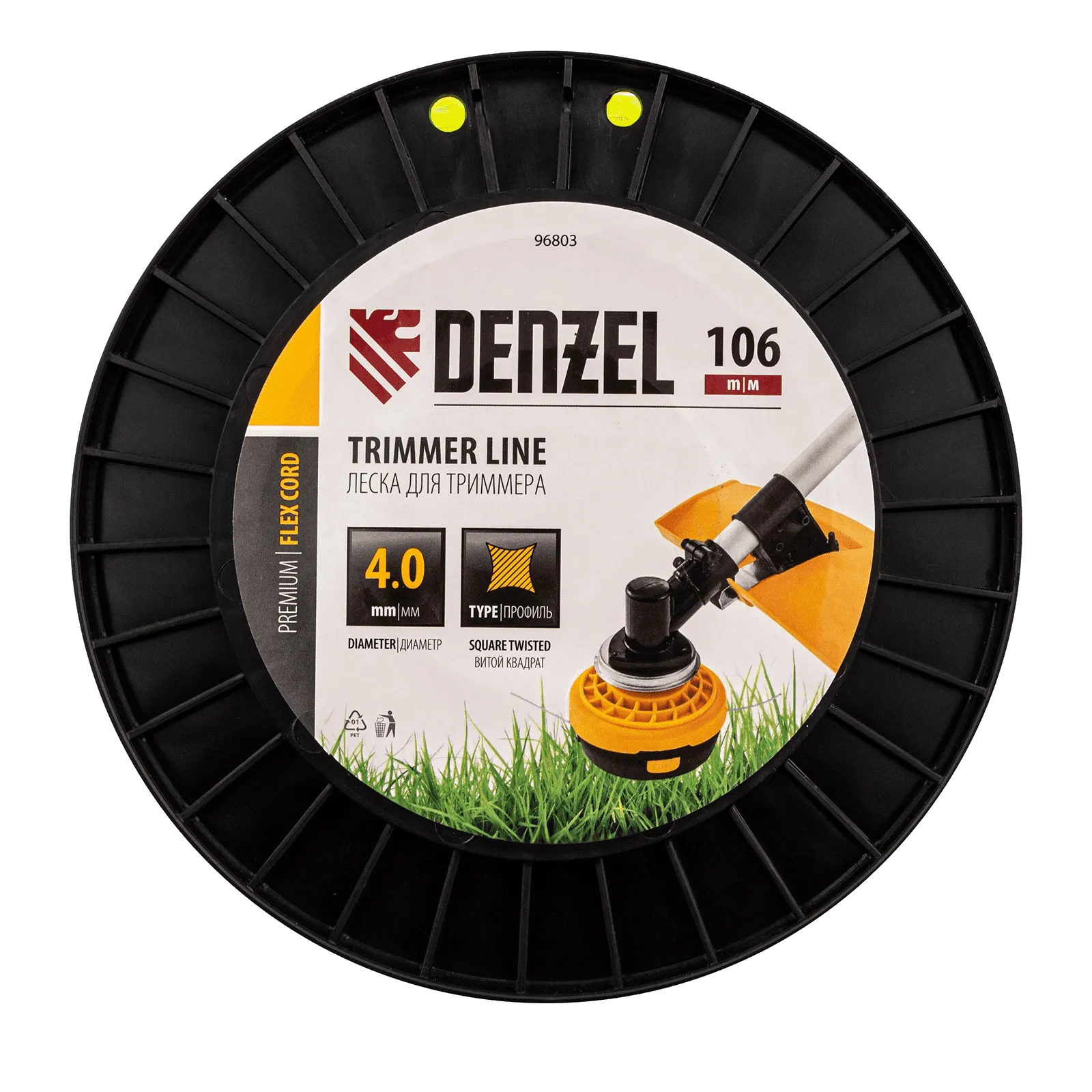 Леска для триммера Denzel FLEX CORD 96803 с сечением «витой квадрат», толщиной 4,0 мм и длиной 106 м, на DIN-катушке, предназначена для скашивания крупностеблевой растительности, сорняков, борщевика. Используется на бензиновых триммерах с объемом двигателя более 52 см3.