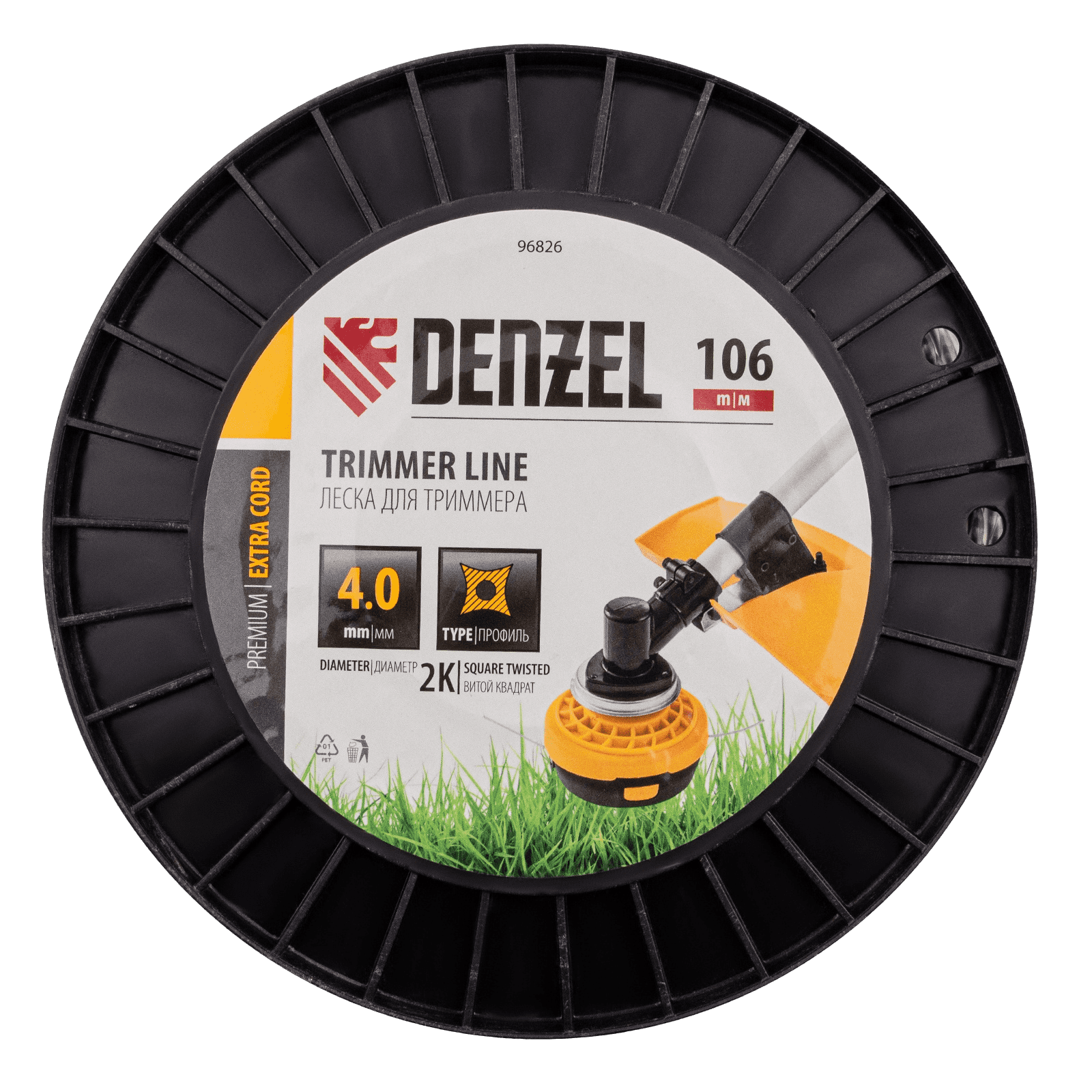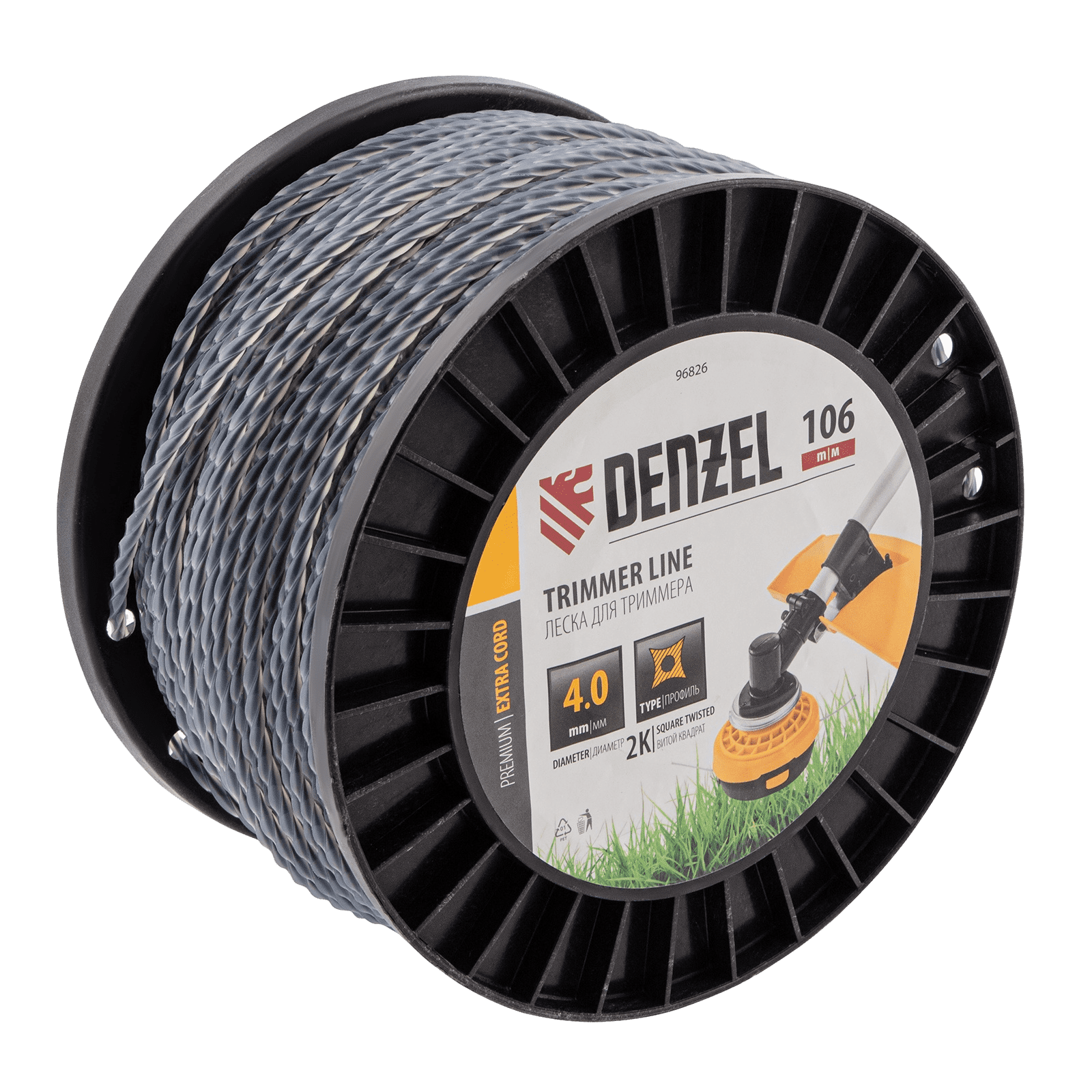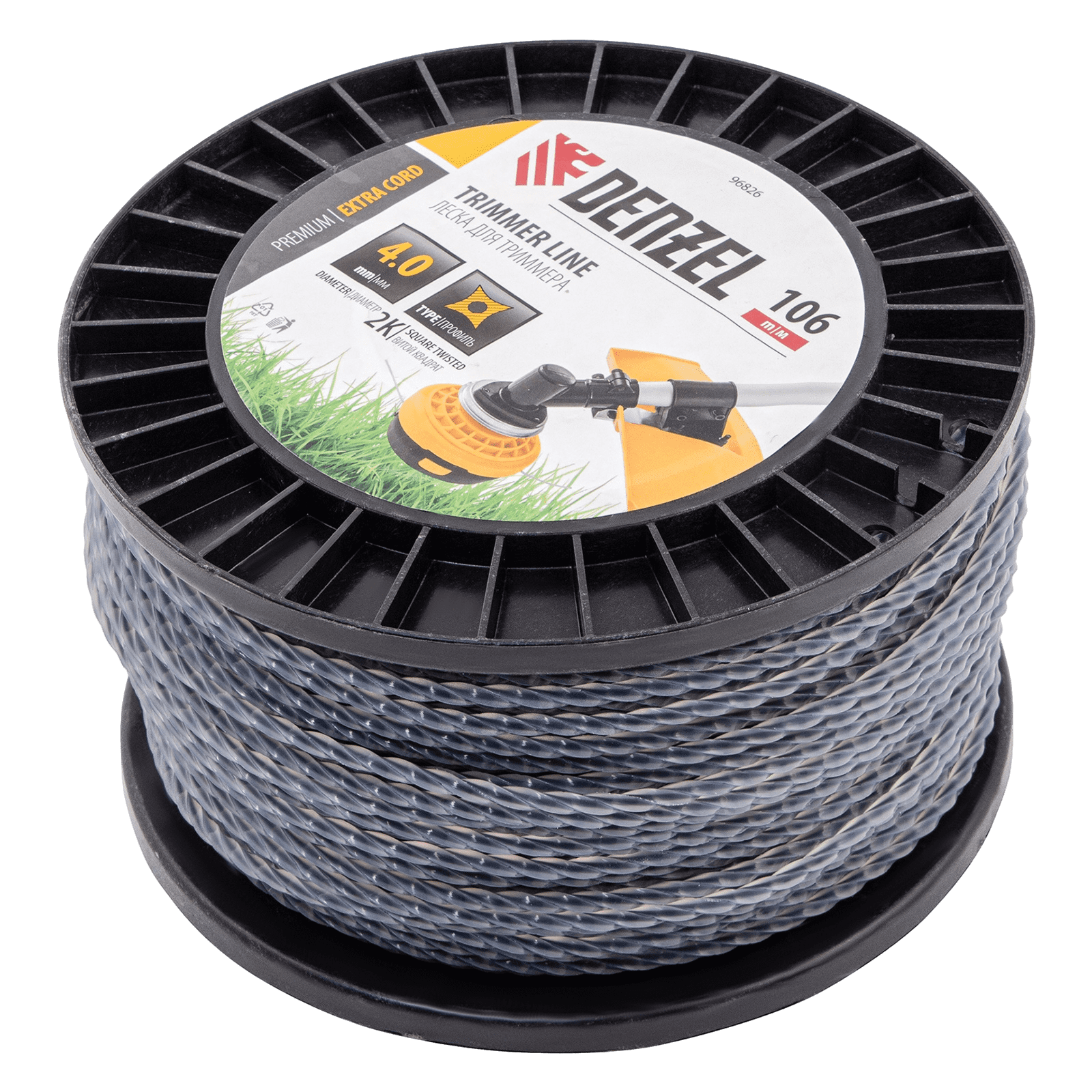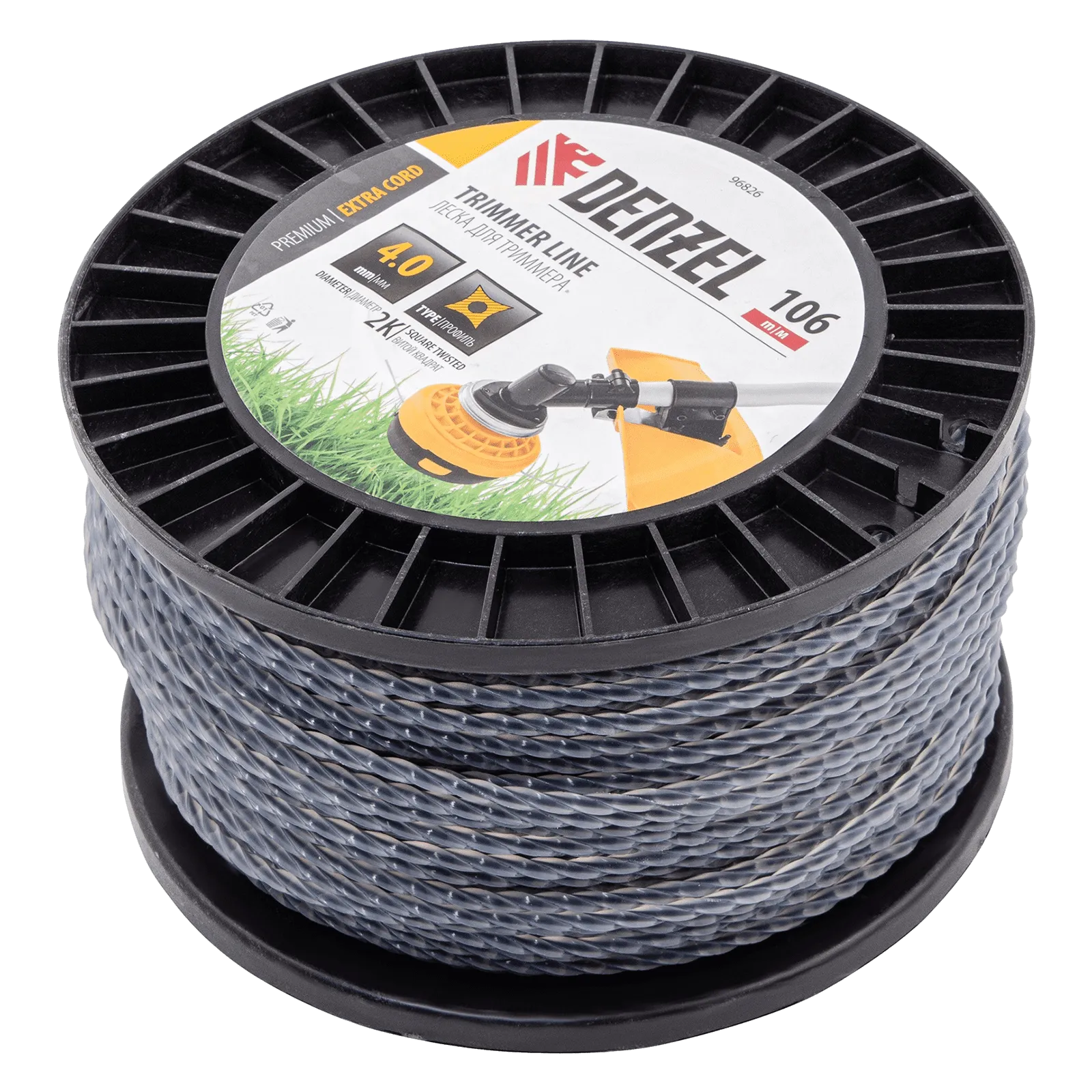 Двухкомпонентная леска для триммера Denzel EXTRA CORD 96826 толщиной 4,0 мм и длиной 106 м, на DIN-катушке, имеет сечение «витой квадрат» и предназначена для скашивания крупностеблевой растительности, мелких кустарников и сорняков. Эффективна даже при использовании на замусоренной территории. Используется на бензотриммерах с объемом двигателя более 52 см3.
