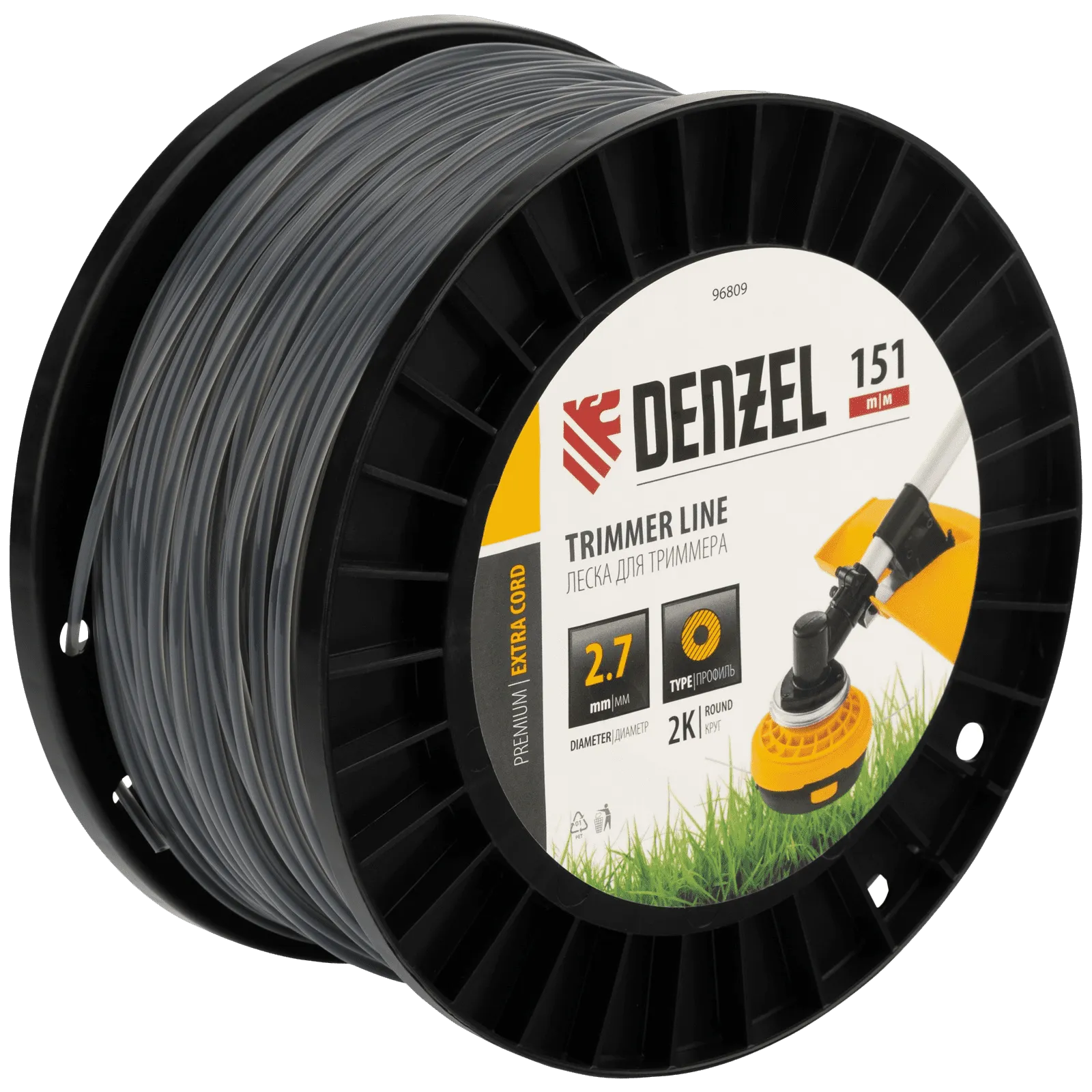 Двухкомпонентная леска для триммера Denzel EXTRA CORD 96809 размером 2,7 мм х 151 м, с круглым сечением, на DIN-катушке, предназначена для работы с бензотриммерами с объемом двигателя 25-52 см3. Используется для скашивания густой травы и сорняков с толстыми стеблями, будет полезна для ухода за дачным участком или придомовой территорией.