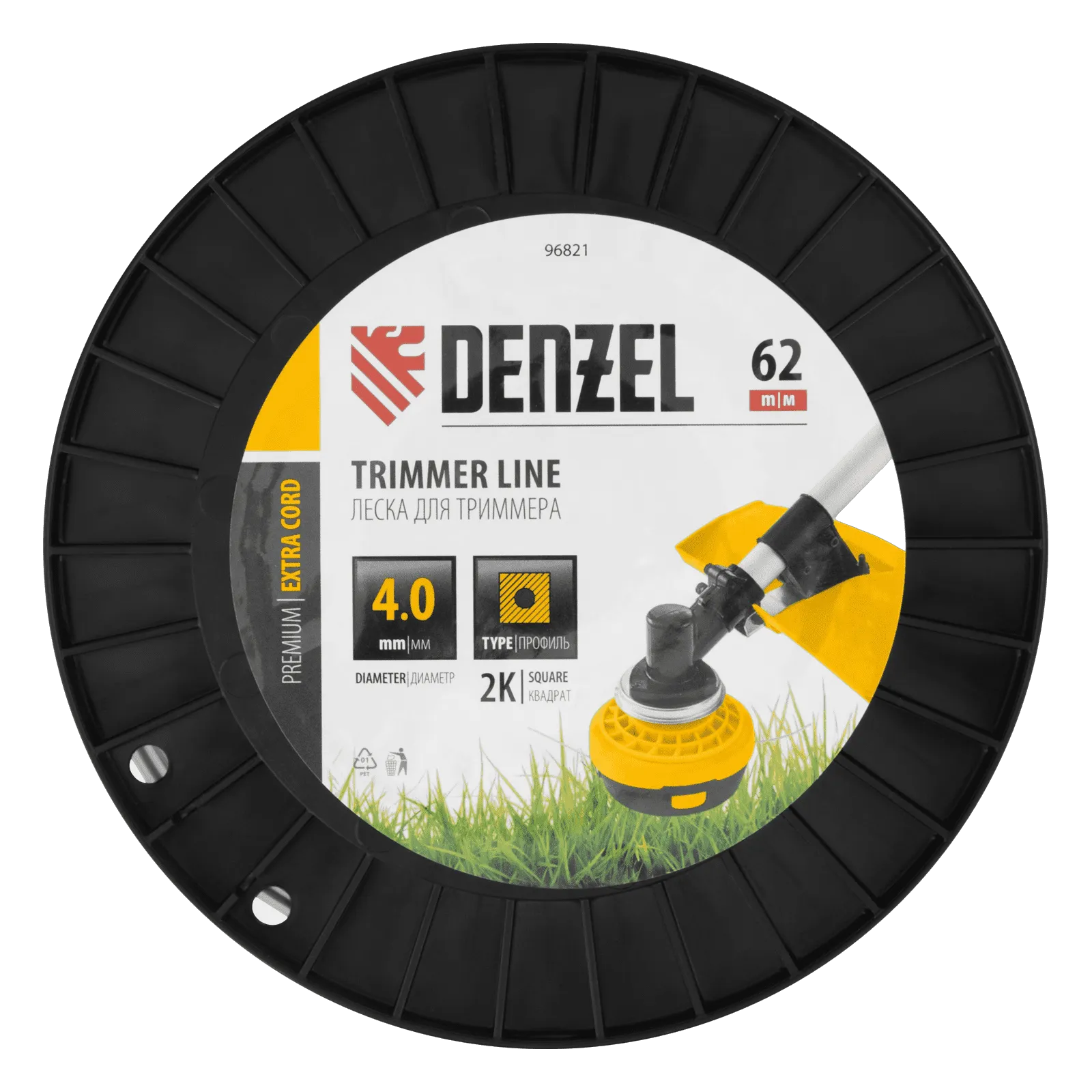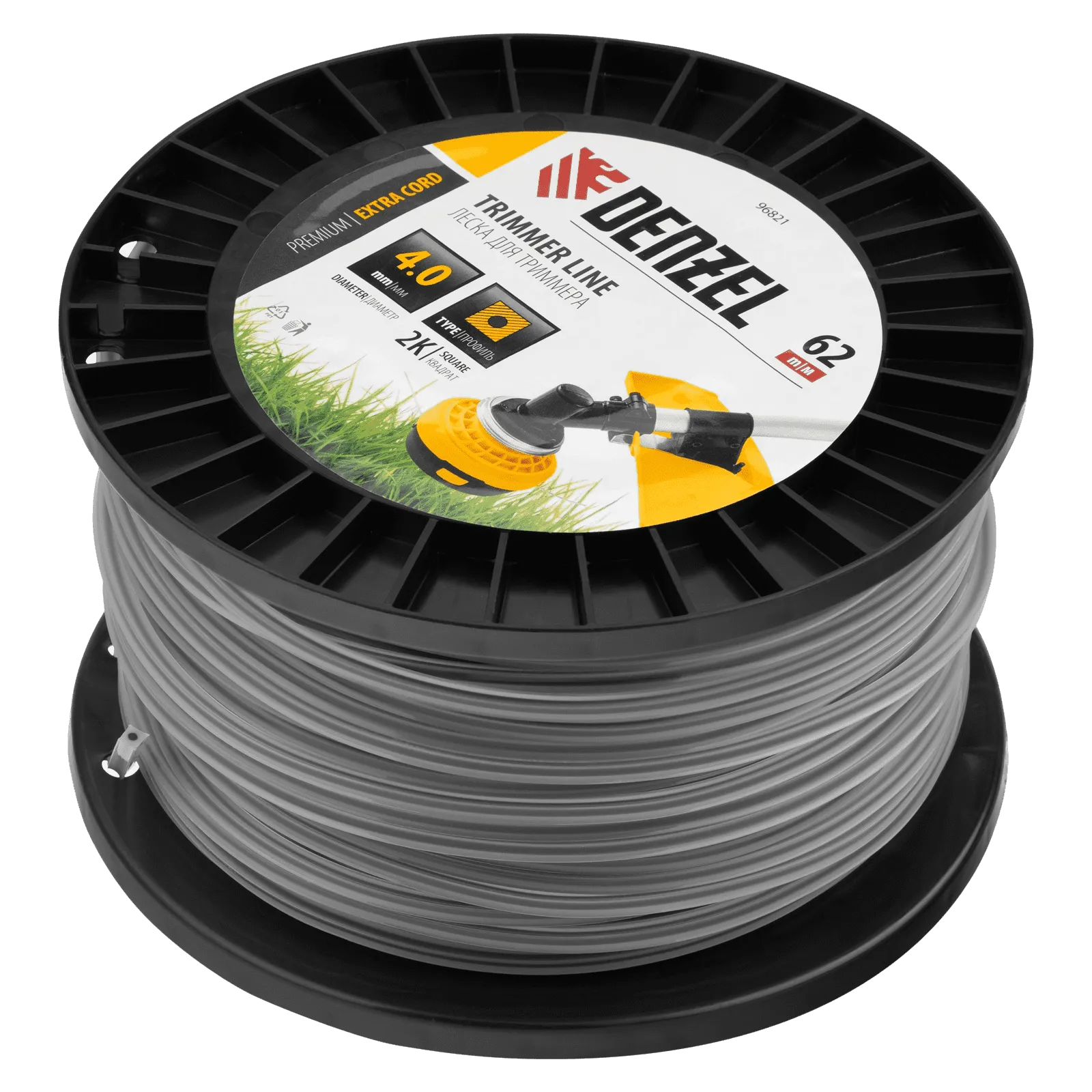 Двухкомпонентная леска для триммера Denzel EXTRA CORD 96821 размером 4,0 мм х 62 м, с сечением «квадрат», на DIN-катушке, используется для скашивания густых зарослей травы и сорных растений на дачном участке и придомовой территории. Заправляется в катушку мощных бензотриммеров. Благодаря острым граням леска успешно справляется с толстыми, жесткими стеблями, позволяя быстро обработать участок большой площади.