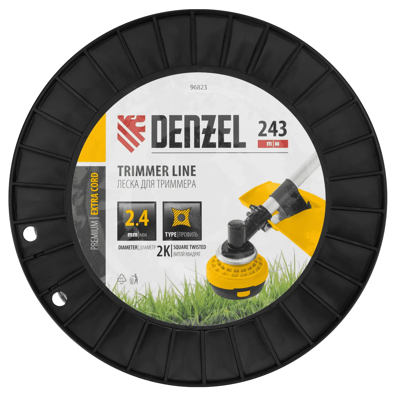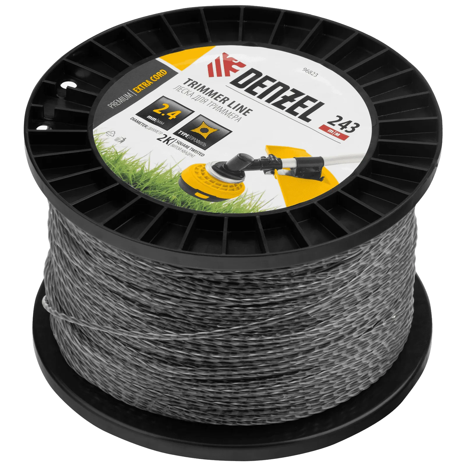 Двухкомпонентная леска для триммера Denzel EXTRA CORD 96823 размером 2,4 мм х 243 м, с сечением «витой квадрат», на DIN-катушке, используется для скашивания густых зарослей травы и сорных растений на дачном участке и придомовой территории. Предназначена для электротриммеров и бензокос с объемом двигателя 25-52 см3. Устойчива к излому, что облегчает ее заправку в катушку. Благодаря острым граням леска успешно справляется с толстыми, жесткими стеблями, позволяя быстро обработать участок большой площади.