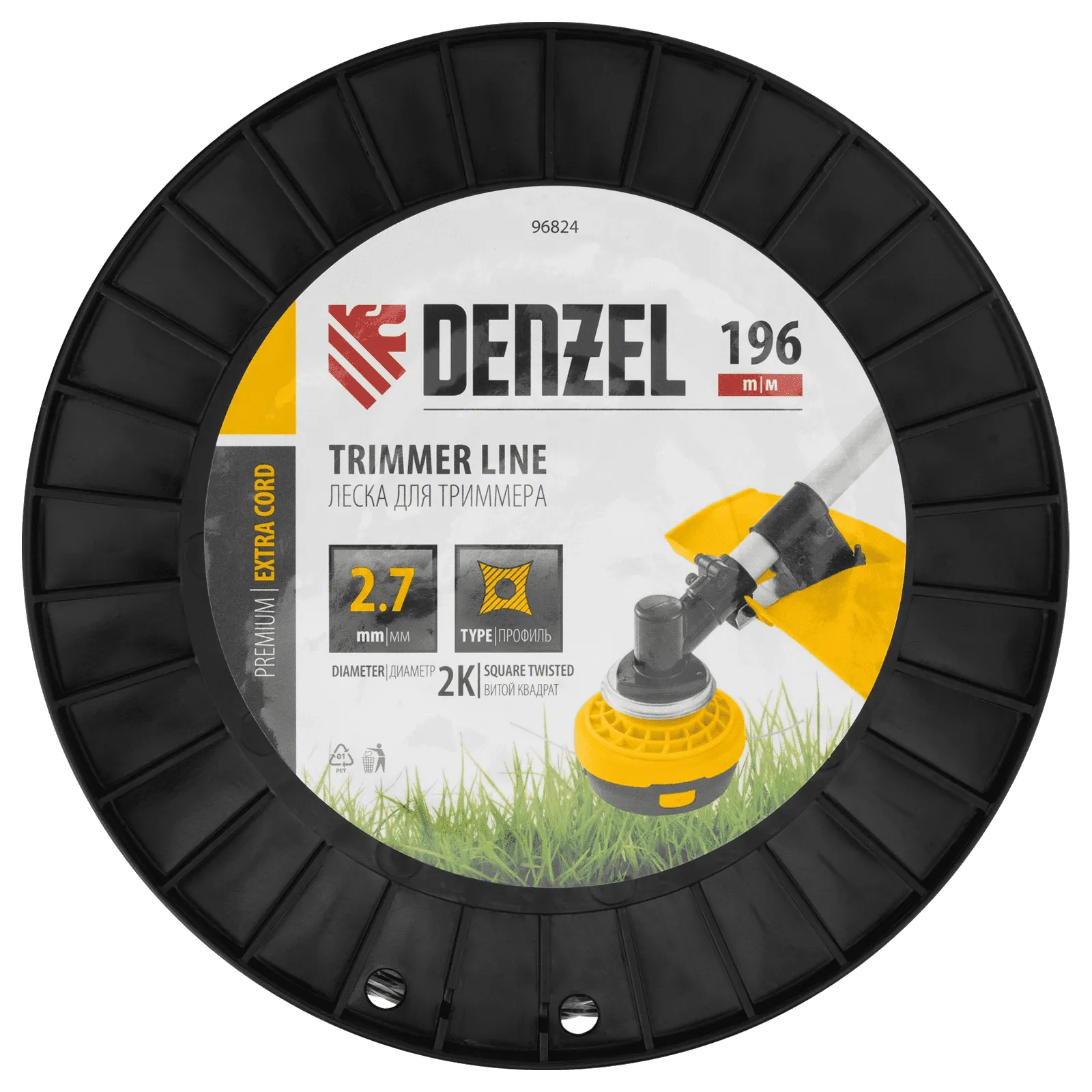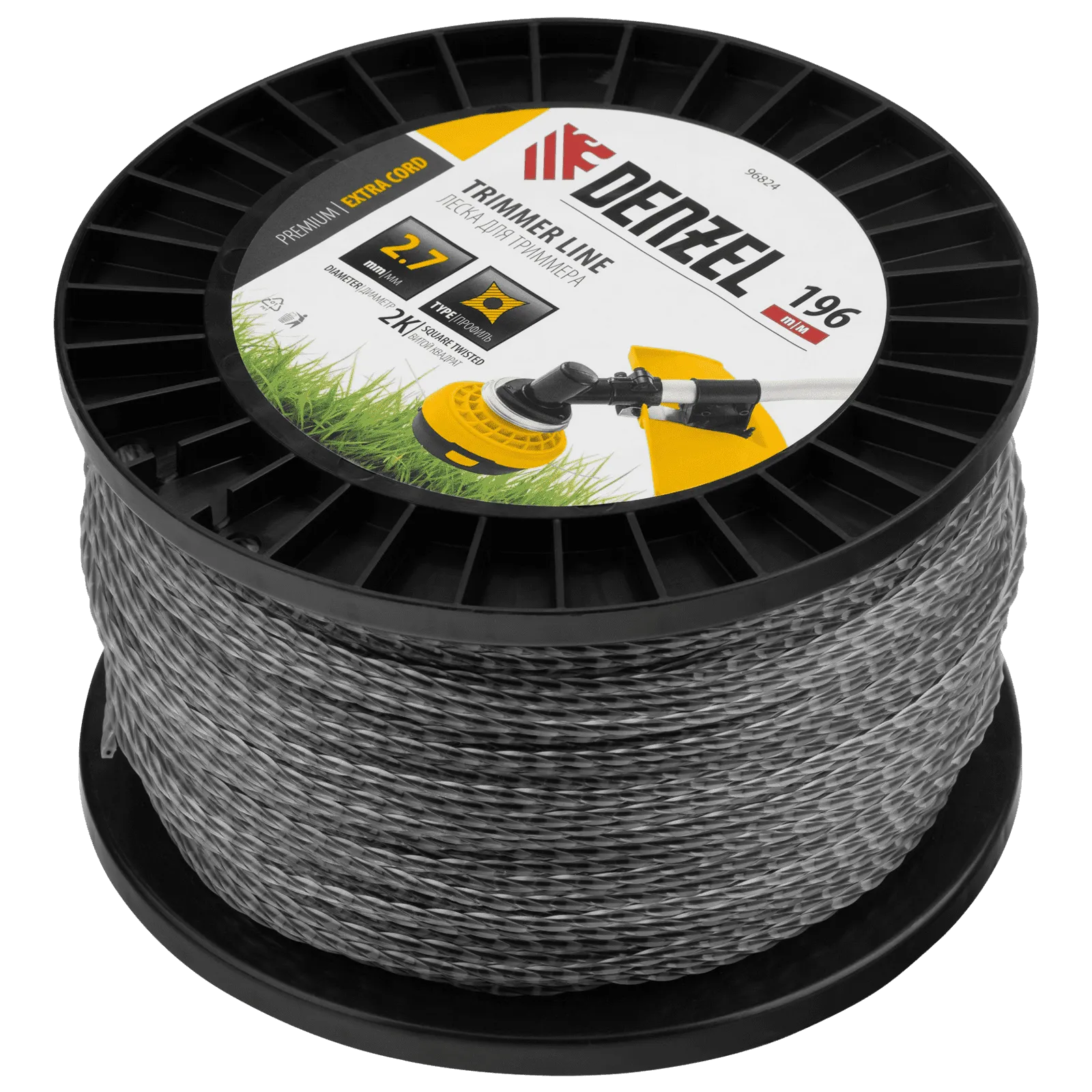 Двухкомпонентная леска для триммера Denzel EXTRA CORD 96824 размером 2,7 мм х 196 м, с сечением «витой квадрат», на DIN-катушке, используется для скашивания густых зарослей травы и сорных растений на дачном участке и придомовой территории. Предназначена для бензотриммеров с объемом двигателя 25-52 см3. Устойчива к излому, что облегчает ее заправку в катушку. Благодаря острым граням леска успешно справляется с толстыми, жесткими стеблями, позволяя быстро обработать участок большой площади.