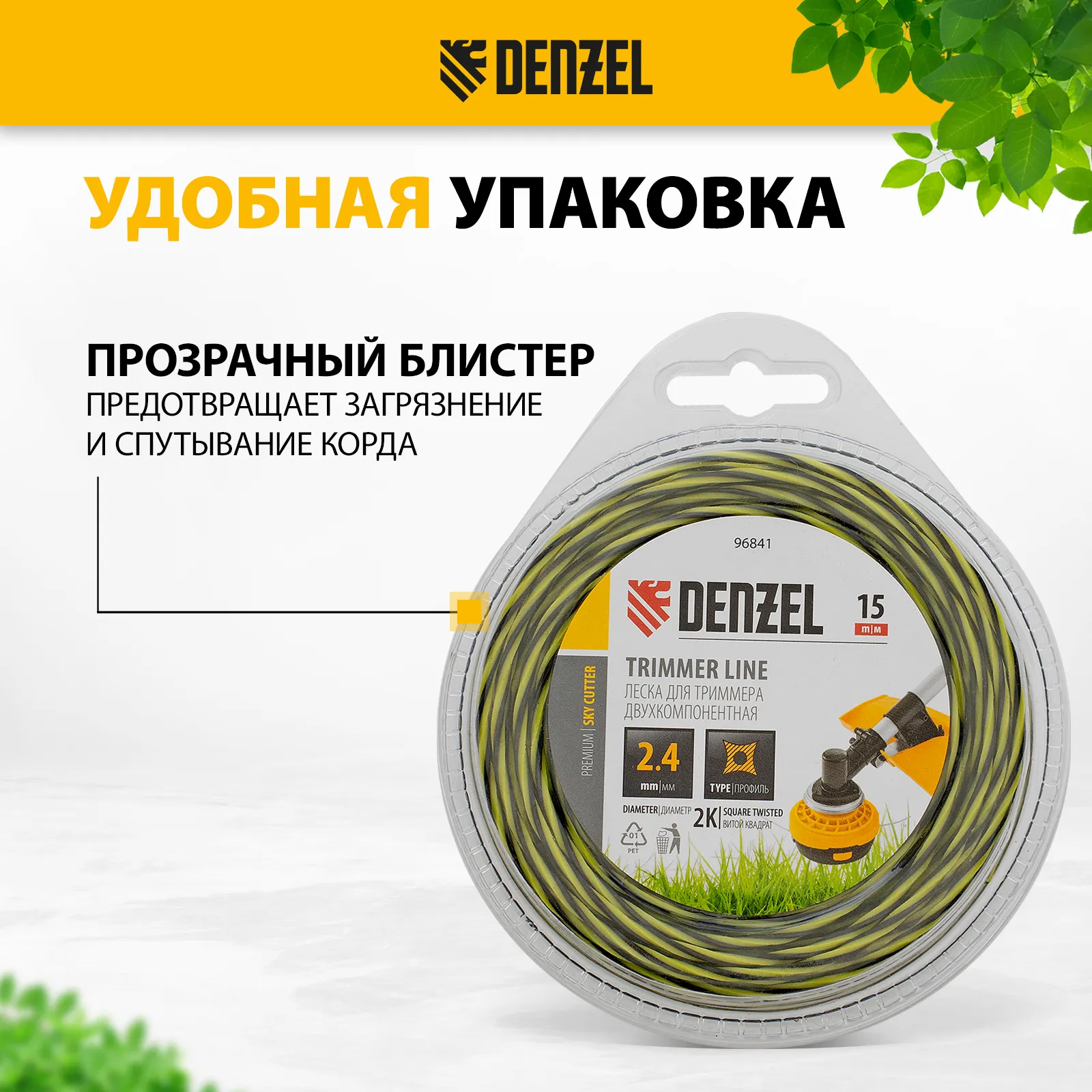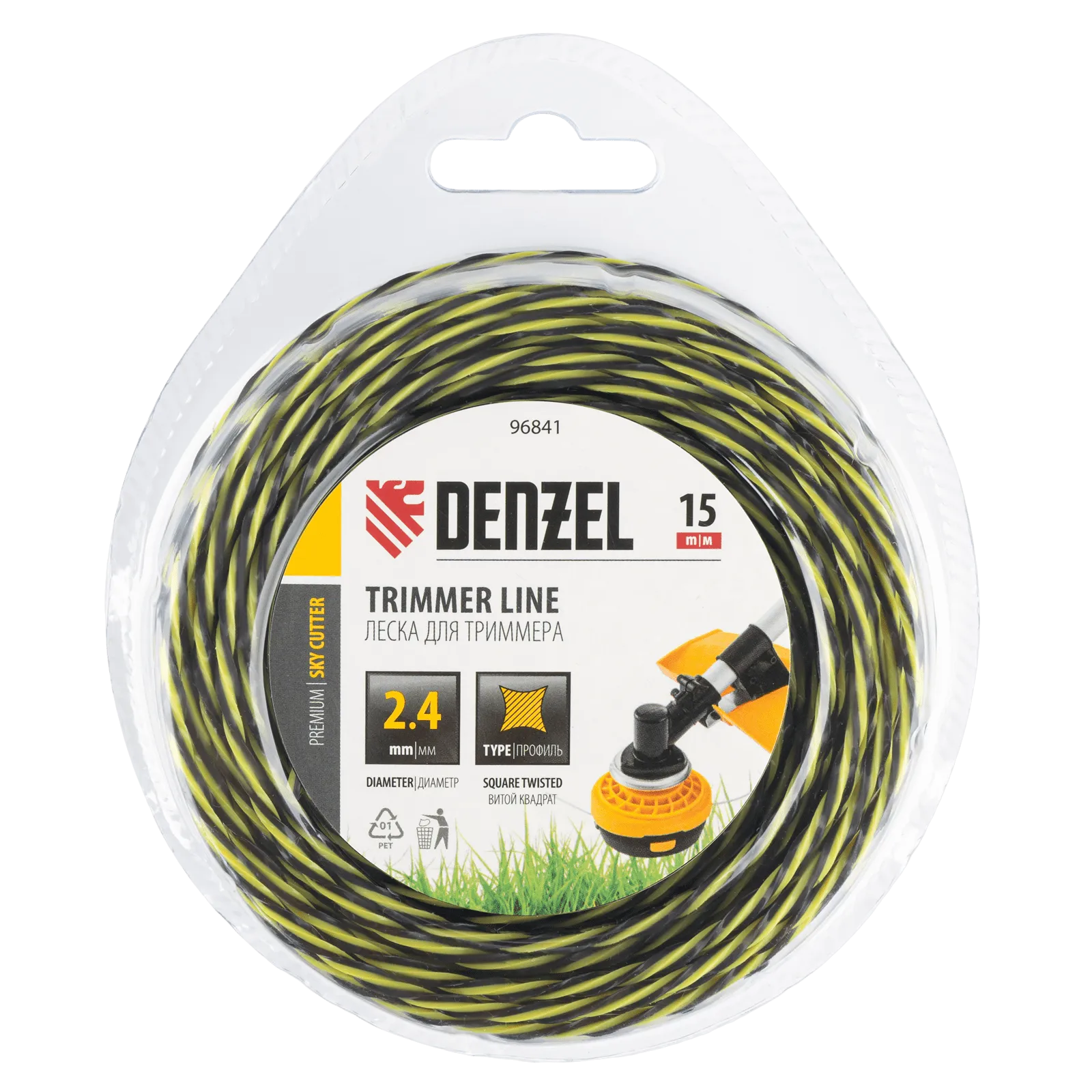 Витая квадратная леска для триммера Denzel SkyCutter 96841 с двухкомпонентной структурой, 2,4 мм х 15 м, в блистере, — расходный материал для электротриммеров и бензиновых триммеров с объемом двигателя 25-52 см3. Благодаря агрессивному профилю леска обеспечивает высокую скорость работы, эффективно скашивая густую траву, сорняки, а также растения с жесткими стеблями. Пригодится владельцам дачных участков.