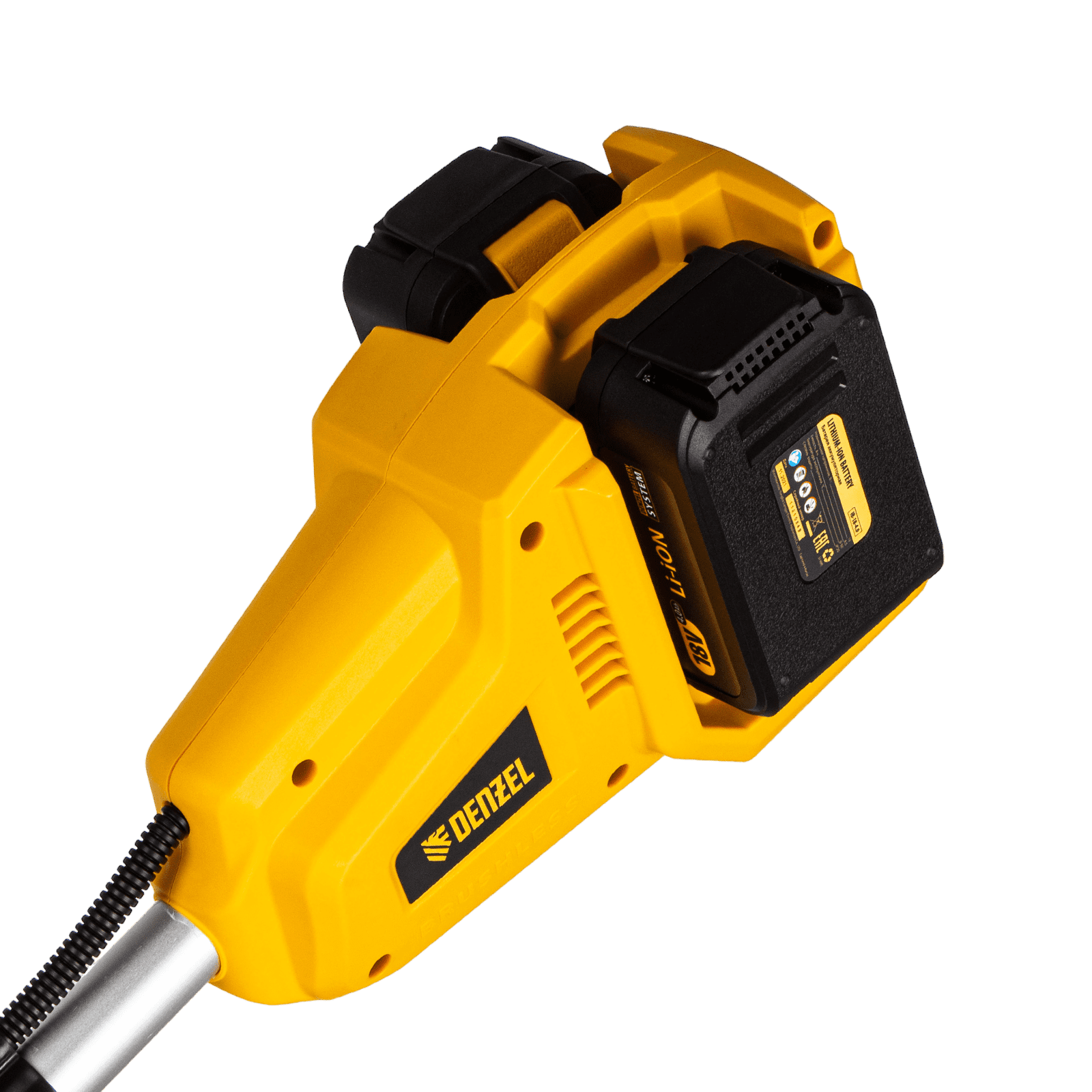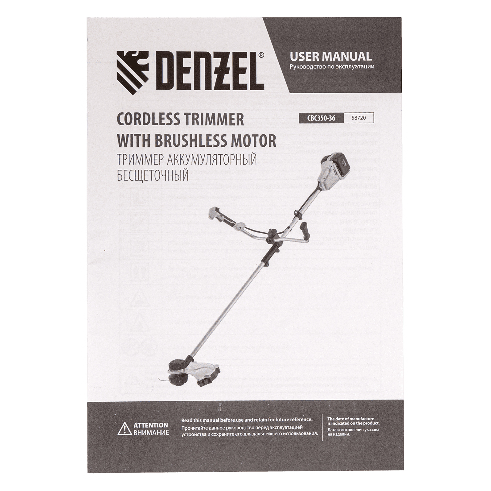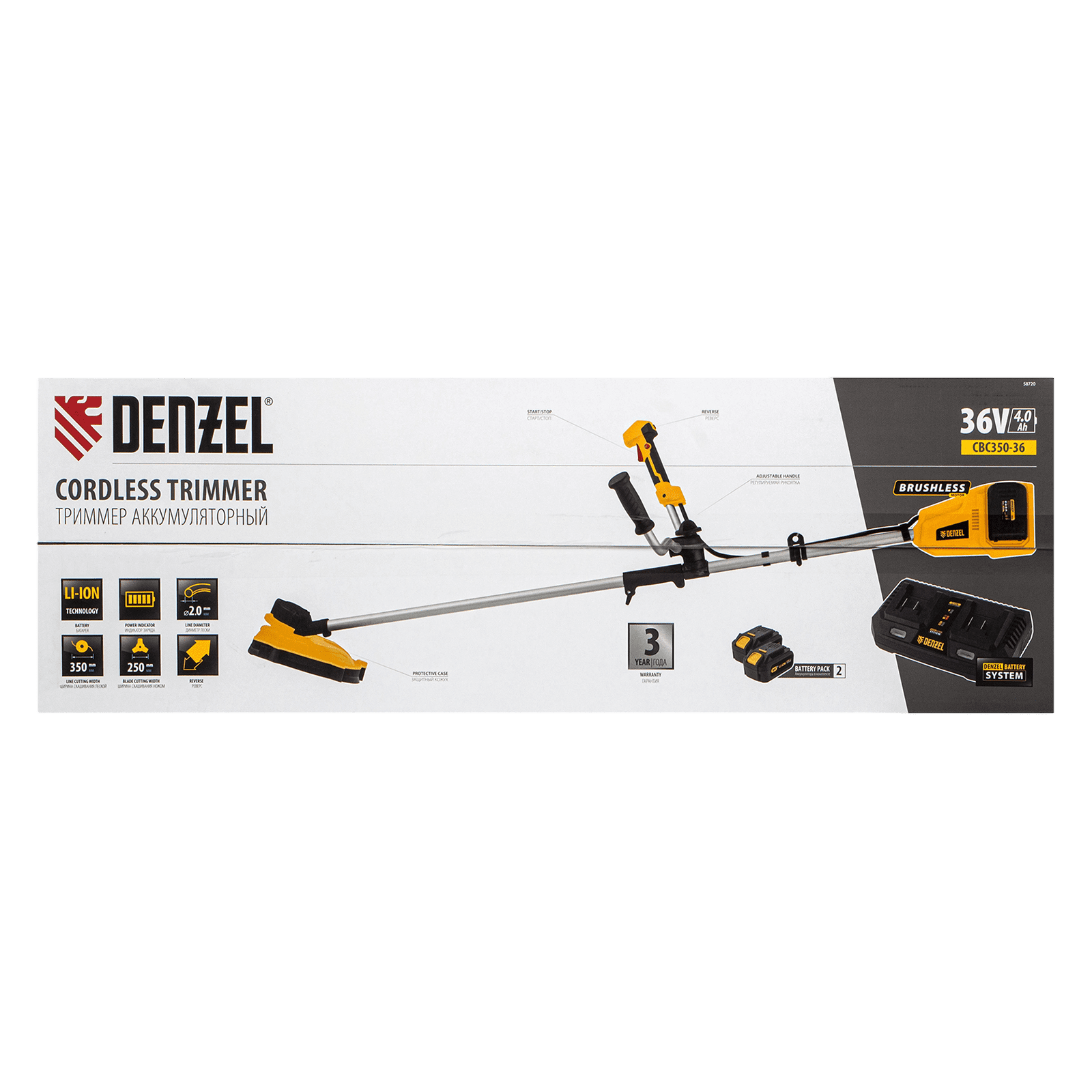 Аккумуляторный бесщеточный триммер Denzel CBC350-36 58720 с двумя батареями Li-ion, 36 В, используется для скашивания густой травы, сорняков и мелкого кустарника на приусадебном участке. В качестве оснастки используется катушка с леской диаметром 2 мм и трехлопастный нож. Ширина скашивания леской составляет 350 мм, ножом — 250 мм.;Триммер работает от двух аккумуляторов увеличенной емкости с интеллектуальной системой распознавания типа нагрузки. Бесщеточный электродвигатель обеспечивает частоту вращения шпули со скоростью 6500 об/мин — этого достаточно для эффективного решения поставленных задач. Т.к. техника не зависит от электросети, работать можно даже в самых отдаленных участках сада.