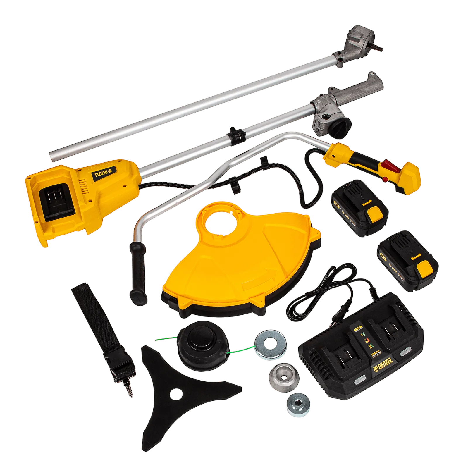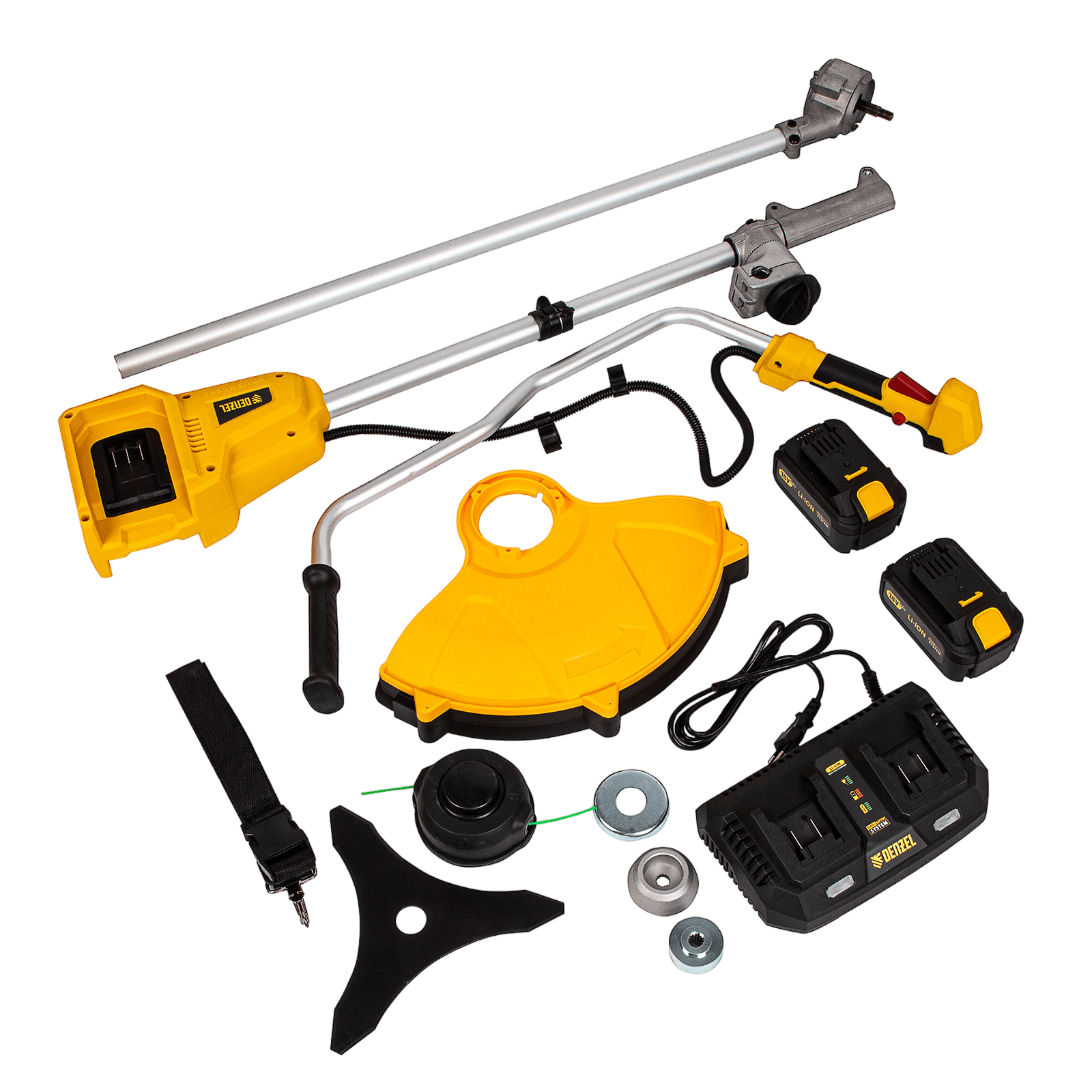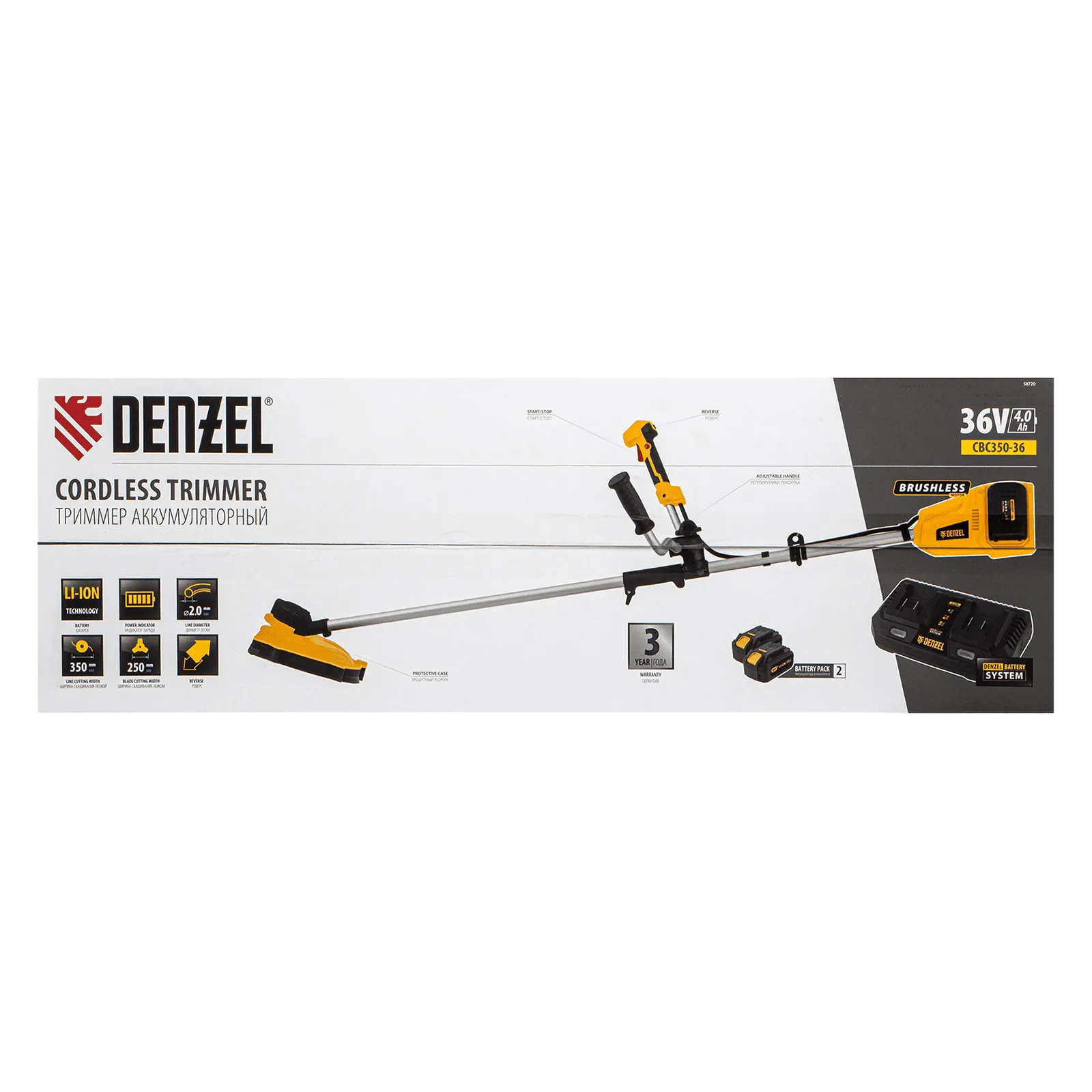 Аккумуляторный бесщеточный триммер Denzel CBC350-36 58720 с двумя батареями Li-ion, 36 В, используется для скашивания густой травы, сорняков и мелкого кустарника на приусадебном участке. В качестве оснастки используется катушка с леской диаметром 2 мм и трехлопастный нож. Ширина скашивания леской составляет 350 мм, ножом — 250 мм.;Триммер работает от двух аккумуляторов увеличенной емкости с интеллектуальной системой распознавания типа нагрузки. Бесщеточный электродвигатель обеспечивает частоту вращения шпули со скоростью 6500 об/мин — этого достаточно для эффективного решения поставленных задач. Т.к. техника не зависит от электросети, работать можно даже в самых отдаленных участках сада.