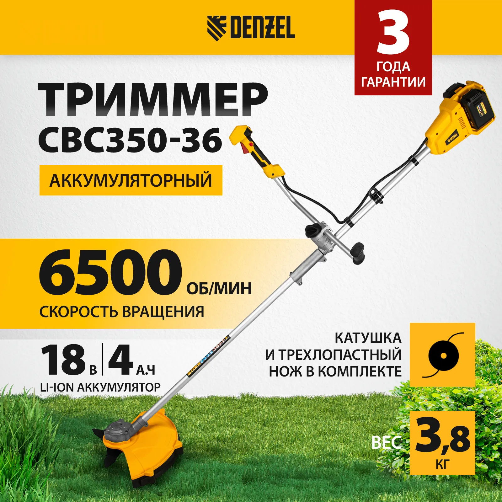 - Гарантия 3 года — качестве аккумуляторного триммера Denzel подтверждено производителем.